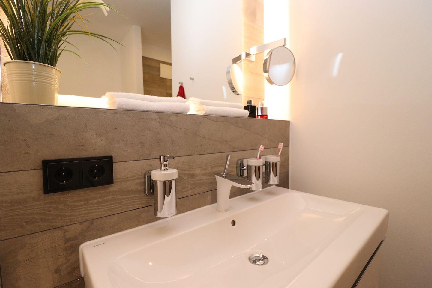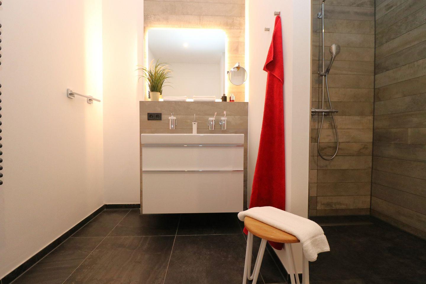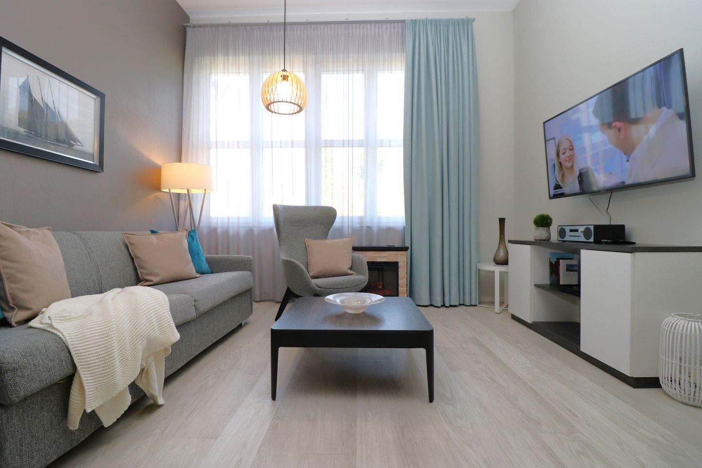Dort begrüßt Sie als erstes die offene NOLTE-Einbauküche mit Einbau-Elektrogeräte, wie einen Induktionsherd, einen Backofen, einen Geschirrspüler, einen Kühlschrank mit Gefrierkombination und eine Mikrowelle. Mit zahlreichem Koch-Zubehör ist die Küche perfekt zum zaubern kulinarischer Genüsse ausgestattet. Der Wohnbereich ist mit einem Couchtisch, zwei bequemen Sesseln und einem gemütlichen Sofa ausgestattet, welches bei Bedarf auch zur Aufbettung für 2 Personen dient. Zur medialen Unterhaltung finden Sie hier einen Flachbild-TV und kostenfreies WLAN. Gern können zwei weitere Gäste auf der Schlafcouch ( 180 cm x 200 cm) übernachten. Das helle Schlafzimmer erwartet Sie mit einem bequemen Boxspringbett. Auch hier befindet sich ein Flachbild- TV (32 Zoll), sowie Verdunklungsgardinen und ein Insektenschutz für eine angenehme Nachtruhe. Das Ensuite-Badezimmer überzeugt durch eine ebenerdige Dusche. Ein Kosmetikspiegel sowie ein Föhn müssen Sie in der Ausstattung des Bads ebenfalls nicht vermissen.