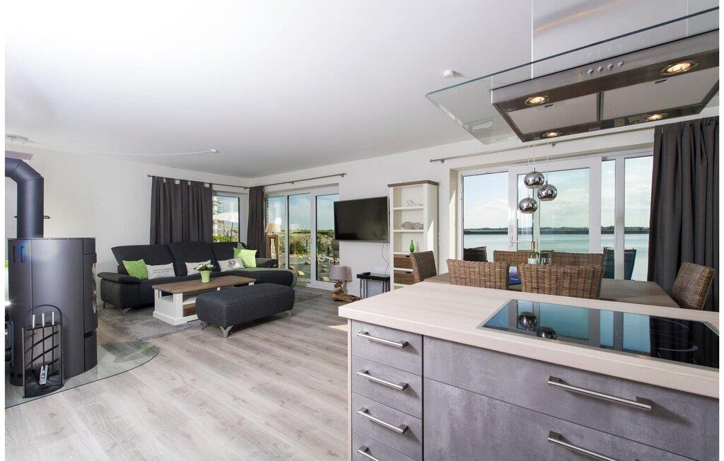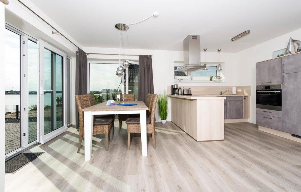 Der großzügige und lichtdurchflutete Wohn- /Essbereich stellt den Mittelpunkt der Ferienwohnung dar und überzeugt mit bodentiefen Fenstern, einer gemütlichen Sitzlandschaft und einem großen Esstisch, alles vor spektakulärer Wasserkulisse. Die offen gestaltete Küche bietet an hochwertiger Technik und Ausstattung alles, was das Kochherz begehrt. Direkt angrenzend an den Wohn-/Essbereich befindet sich die große Terrasse mit ganztags Sonne. In unmittelbarer Wassernähe und vor Hafenkulisse lässt sich hier entspannt die Seele baumeln lassen. Zwei Schlafzimmer bieten Platz für bis zu vier Erwachsene.