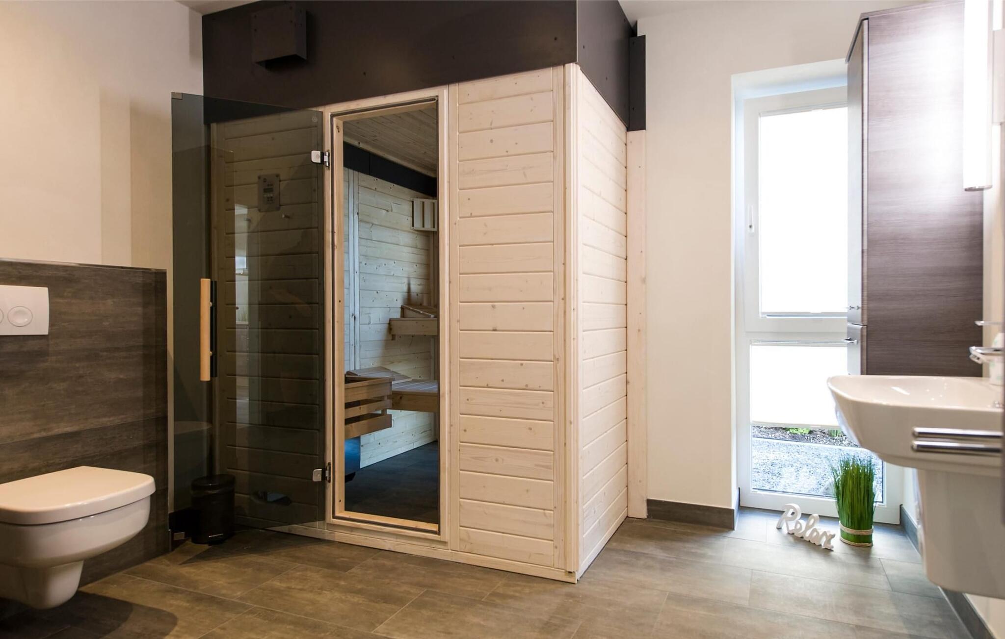 Das Hauptbadezimmer bietet neben einer bodengleichen Dusche auch ein persönliches Spa-Programm, denn die große finnische Sauna sorgt für Wellnessmomente.