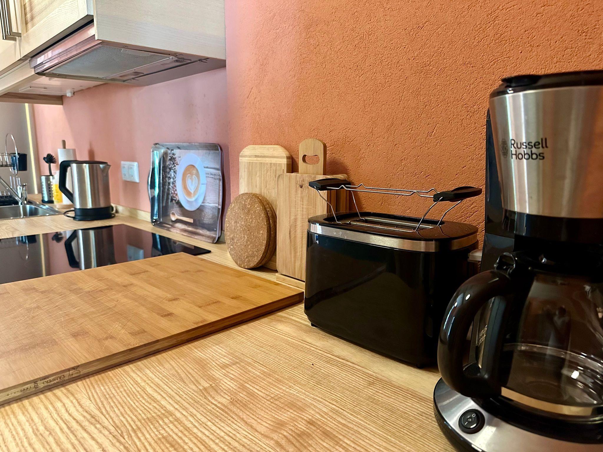 Die voll ausgestattete Küche besticht durch eine harmonisch in Holz gestaltete Einrichtung und verfügt über ein Ceranfeld sowie einen Backofen. Ein Geschirrspüler ist nicht vorhanden, aber die charmante Einrichtung lädt dennoch zum Kochen ein.