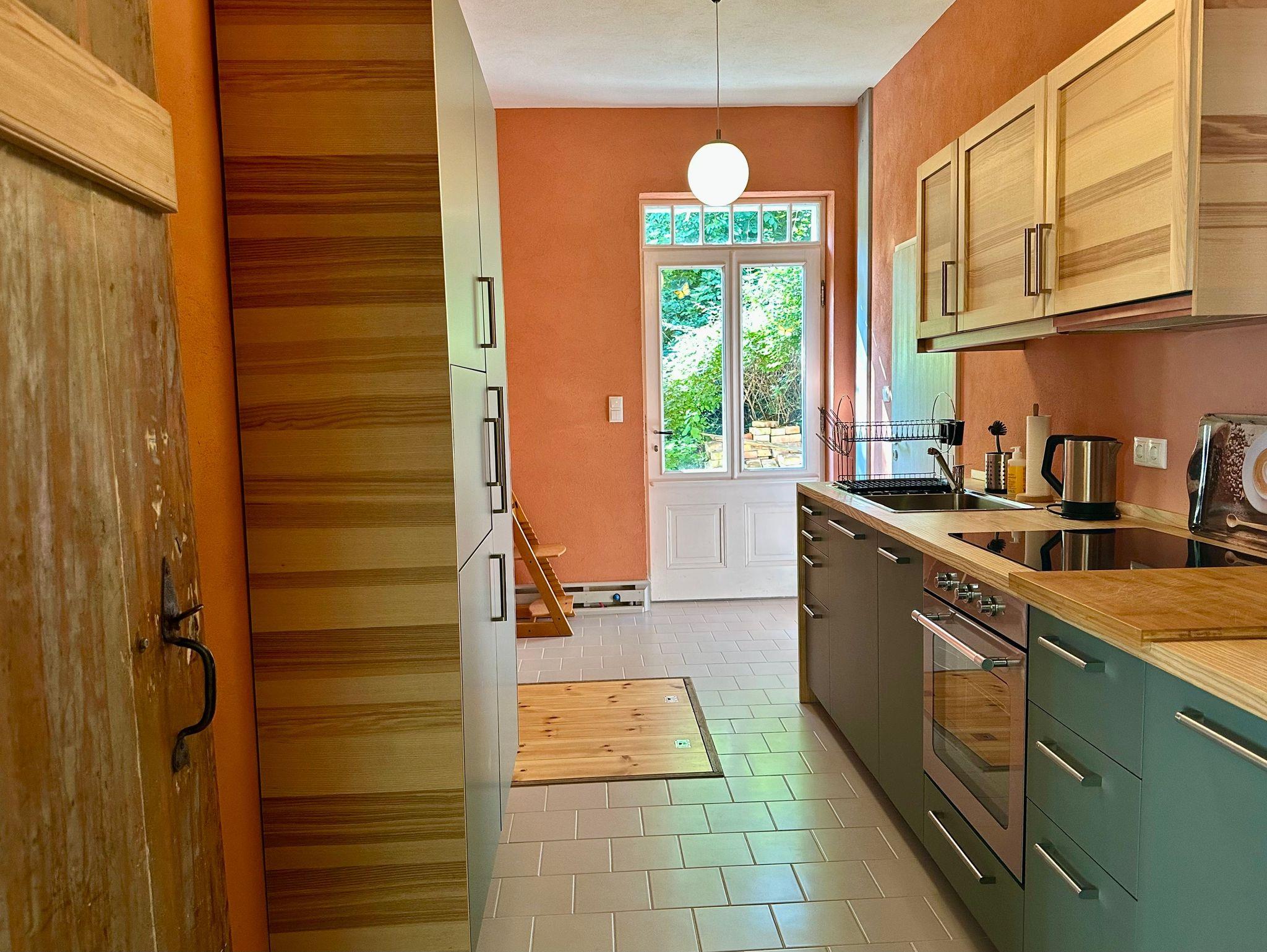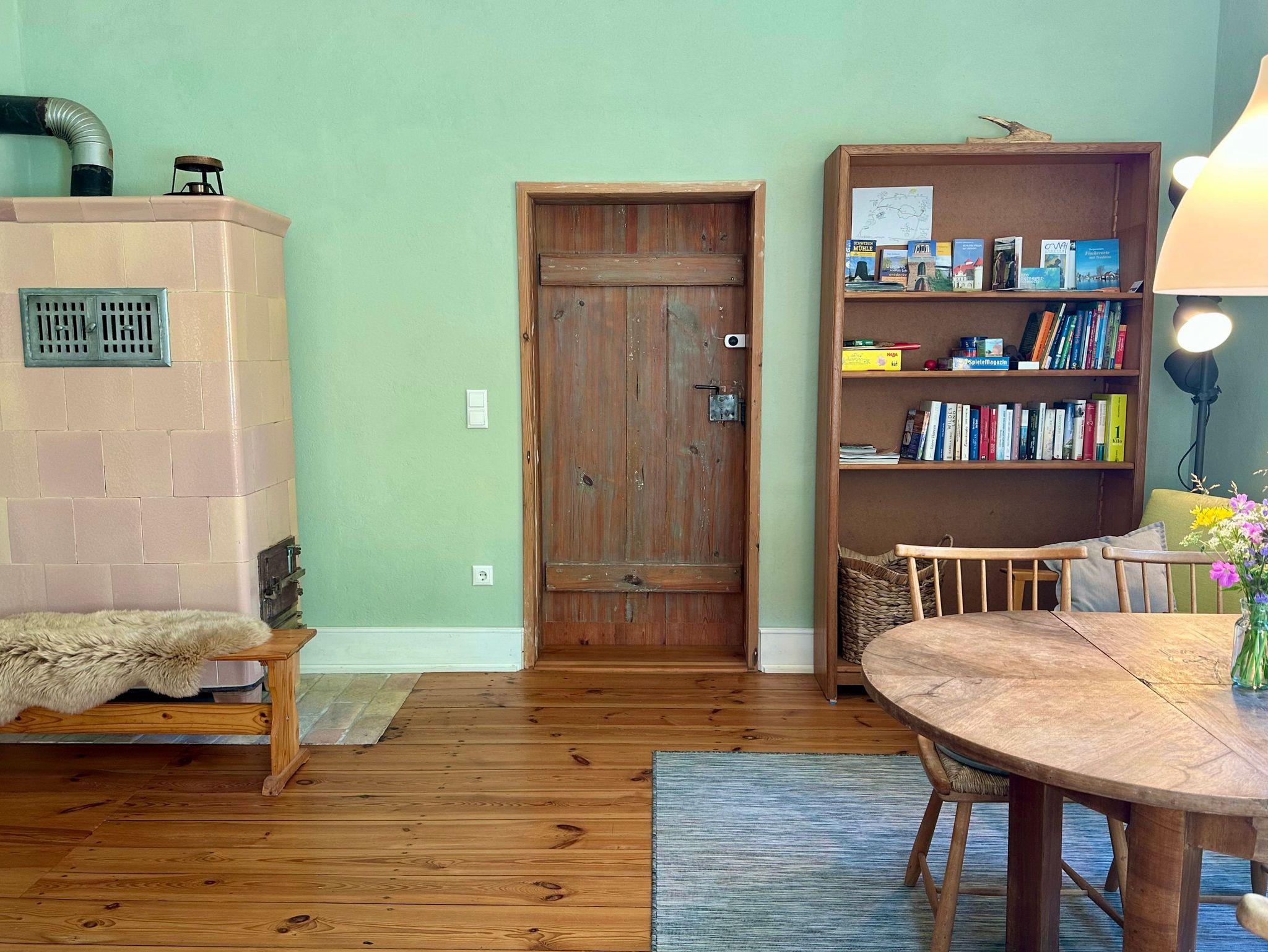 Besonders beeindruckend sind die sorgfältig restaurierten Türen und viele weitere historische Details, die aus dem ursprünglichen Kutscherhaus erhalten und mit viel Liebe zum Detail aufgearbeitet wurden. Sie verleihen der Wohnung eine authentische und einladende Atmosphäre.