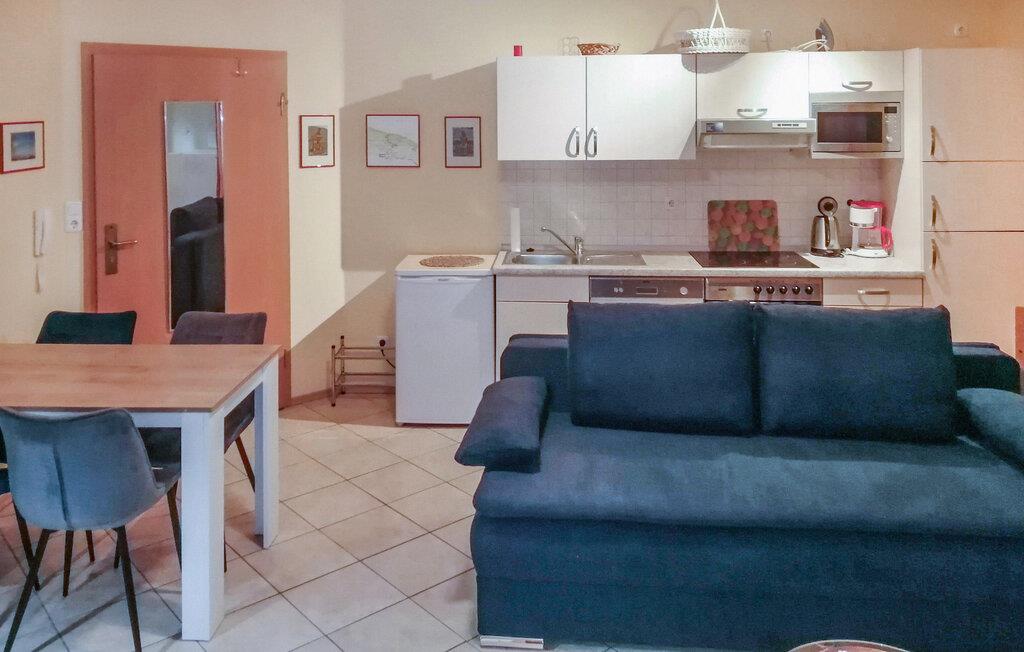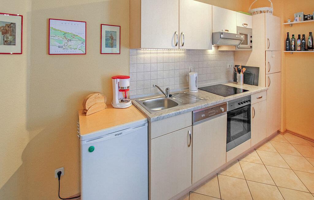Nur ca. 600 m (etwa 12 Gehminuten) vom Ostseestrand und ca. 800 m vom Achterwasser entfernt, befindet sich im Erdgeschoss eines Appartementhauses mit insgesamt 6 Wohneinheiten die komfortable Ferienwohnung für 2 Personen mit zwei Aufbettungsmöglichkeiten. Die ca. 40 qm große, mit Fußbodenheizung und einem Elektro-Kamin ausgestattete Nichtraucher-Wohnung verfügt über einen Wohnraum (Schlafcouch - Aufbettung für 2 Personen, Flachbild-TV mit Radio, Esstisch) mit offener Küche (E-Herd mit Backofen, Kühlschrank, Mikrowelle, Geschirrspüler, Wasserkocher, Kaffeemaschine), ein Schlafzimmer (Doppelbett) sowie ein Bad (Dusche, WC, Waschmaschine). Weiterhin stehen eine möblierte Terrasse, ein PKW-Stellplatz und ein Fahrradabstellraum zur Verfügung.