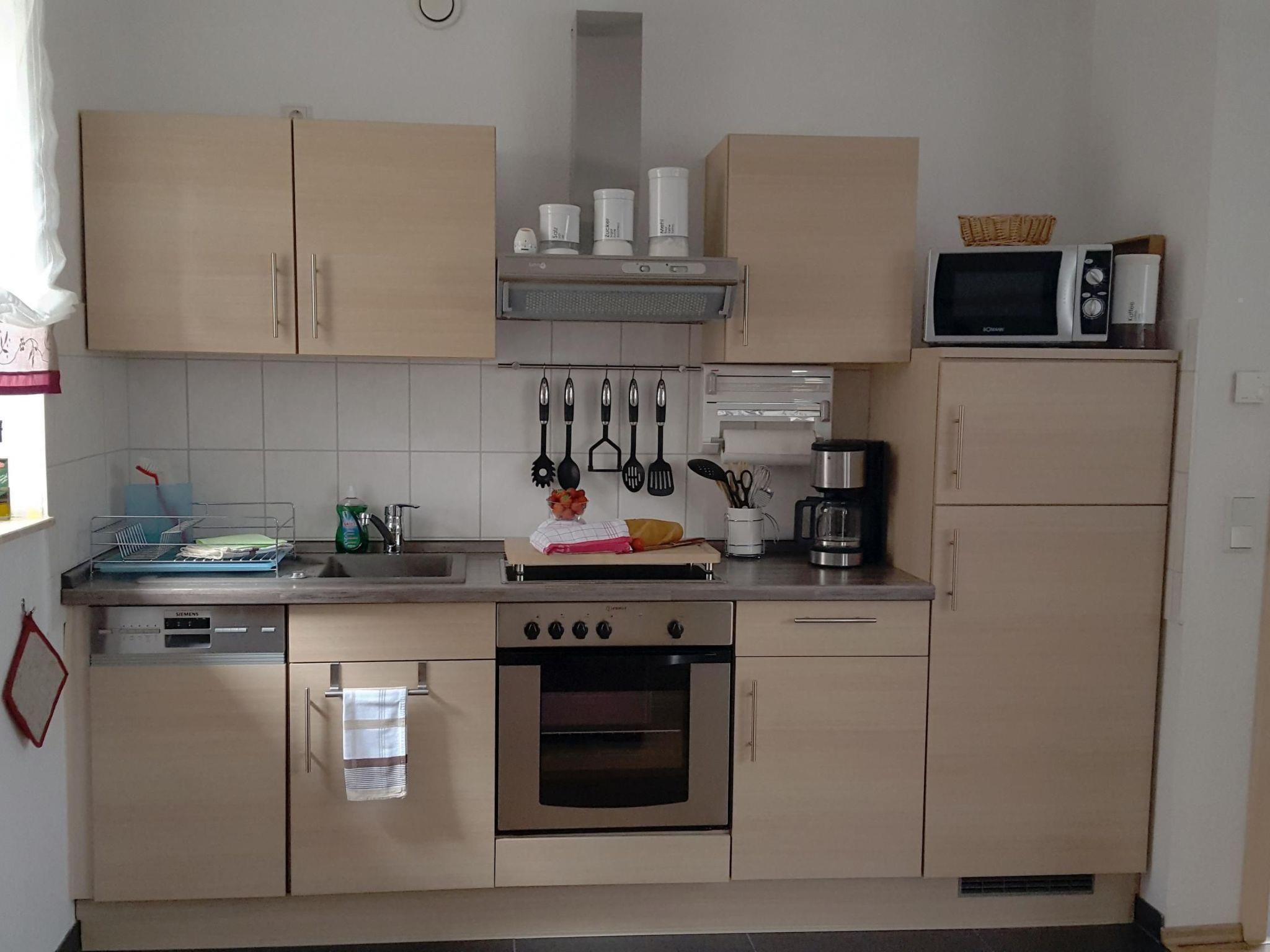 Im Herzen der Wohnung erwartet Sie ein heller Wohnbereich mit einer offenen Küche, die keine Wünsche offen lässt. Die moderne Küchenausstattung umfasst einen Geschirrspüler, einen Herd mit Ceranfeld und einen Kühlschrank. Darüber hinaus stehen Ihnen essentielle Küchengrundausstattungen wie Kaffee, Zucker, Salz, Mehl, Öle und eine Auswahl an Gewürzen zur Verfügung, die ein sofortiges heimeliges Gefühl vermitteln. Der Wohnbereich vereint Komfort und Funktionalität, sodass Sie jede Mahlzeit in einer einladenden Atmosphäre zubereiten und genießen können.