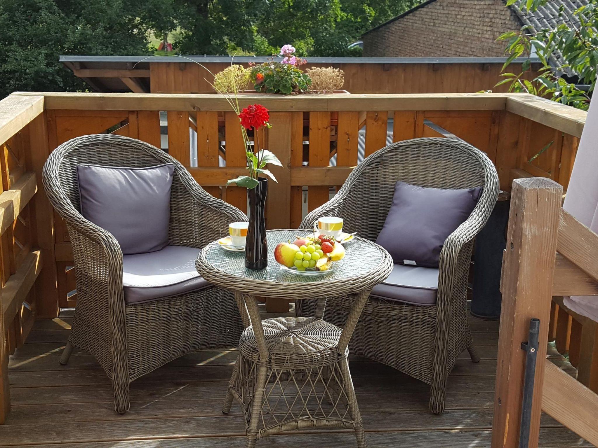 Die Wohnung ist über eine Außentreppe zugänglich und verfügt über einen einladenden Balkon mit Sitzmöbeln und Sonnenschirm - der ideale Ort, um den Morgen mit einer Tasse Kaffee zu begrüßen oder den Tag in Ruhe ausklingen zu lassen. Genießen Sie hier die friedliche Atmosphäre und tanken Sie frische Luft.