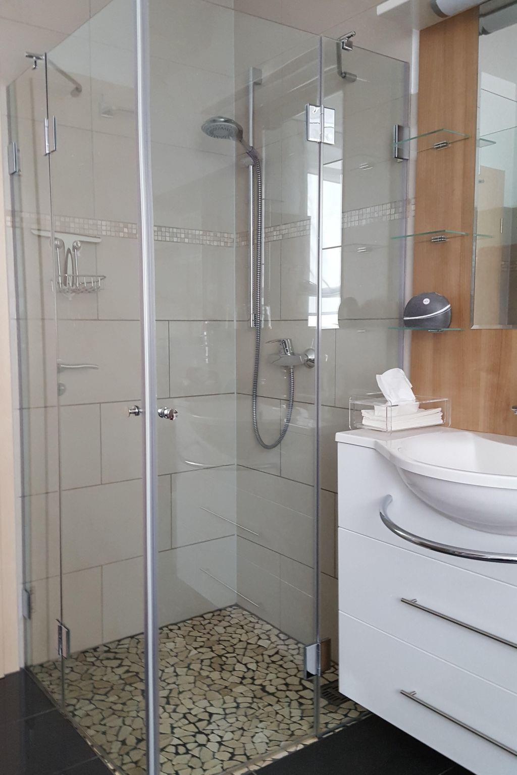 Das Apartment besticht durch eine durchdachte Raumaufteilung, die neben dem Wohnraum auch ein modernes Tageslichtbad mit einer ebenerdigen Dusche und ein Schlafzimmer umfasst. Im Schlafzimmer finden Sie ein komfortables Doppelbett (1,80 x 2,00 m) sowie ausreichend Stauraum im geräumigen Kleiderschrank. Für eine dritte Person oder Familien mit Kindern steht eine bequeme Schlafcouch im Wohnzimmer bereit. Ein Babyreisebett und/oder ein Gästebett können auf Wunsch zur Verfügung gestellt werden.