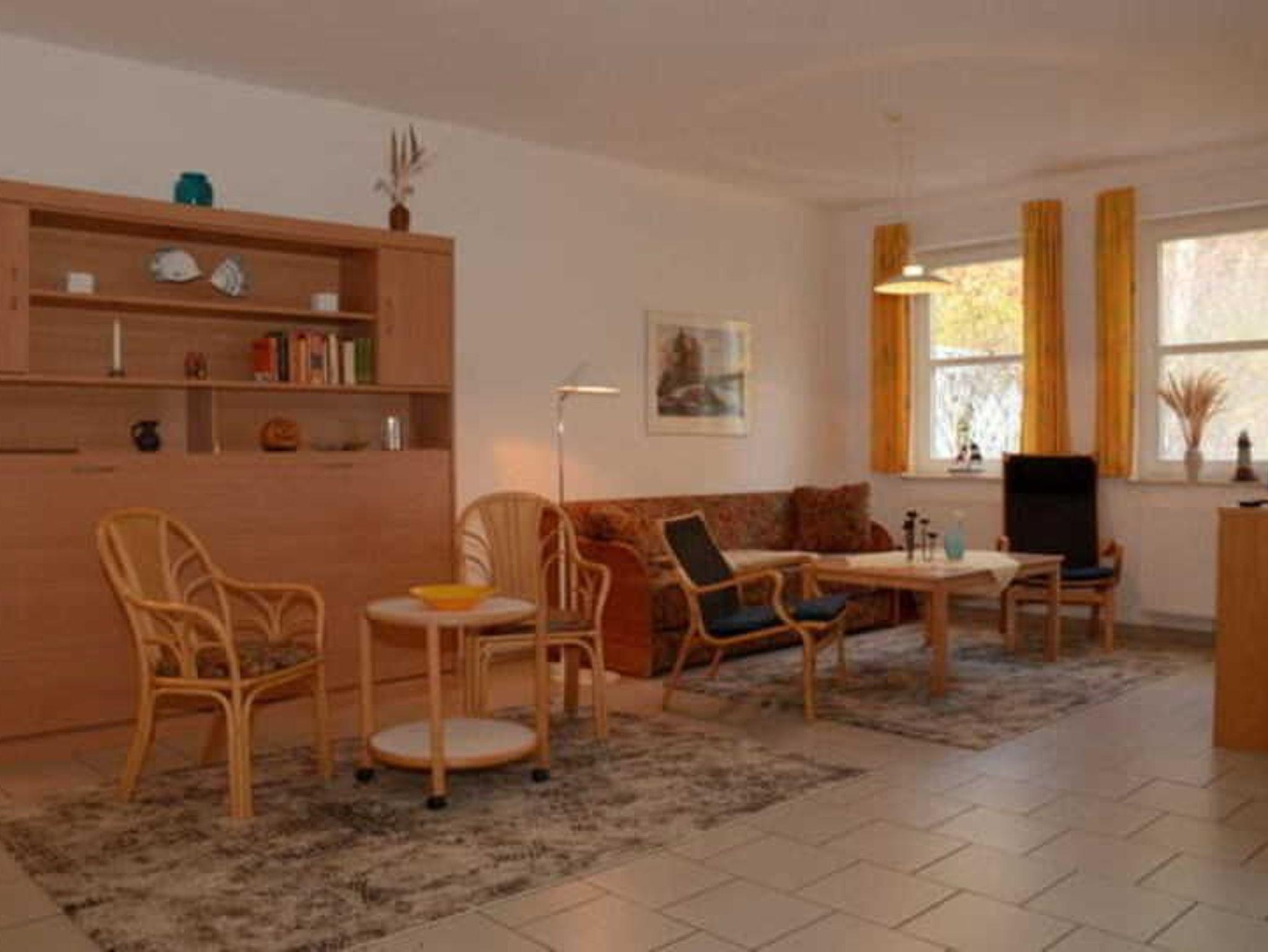 1 geräumiger Wohnraum mit komfortabler Küchenzeile,einem Schrankbett und einer Schlafcouch; weiterhin ein Schlafraum mit einem Doppelbett und einem Schlafraum mit zwei getrennt stehenden Betten; Bad/ WC mit bodengleicher Dusche; Terrasse mit Waldblick-seeseitig