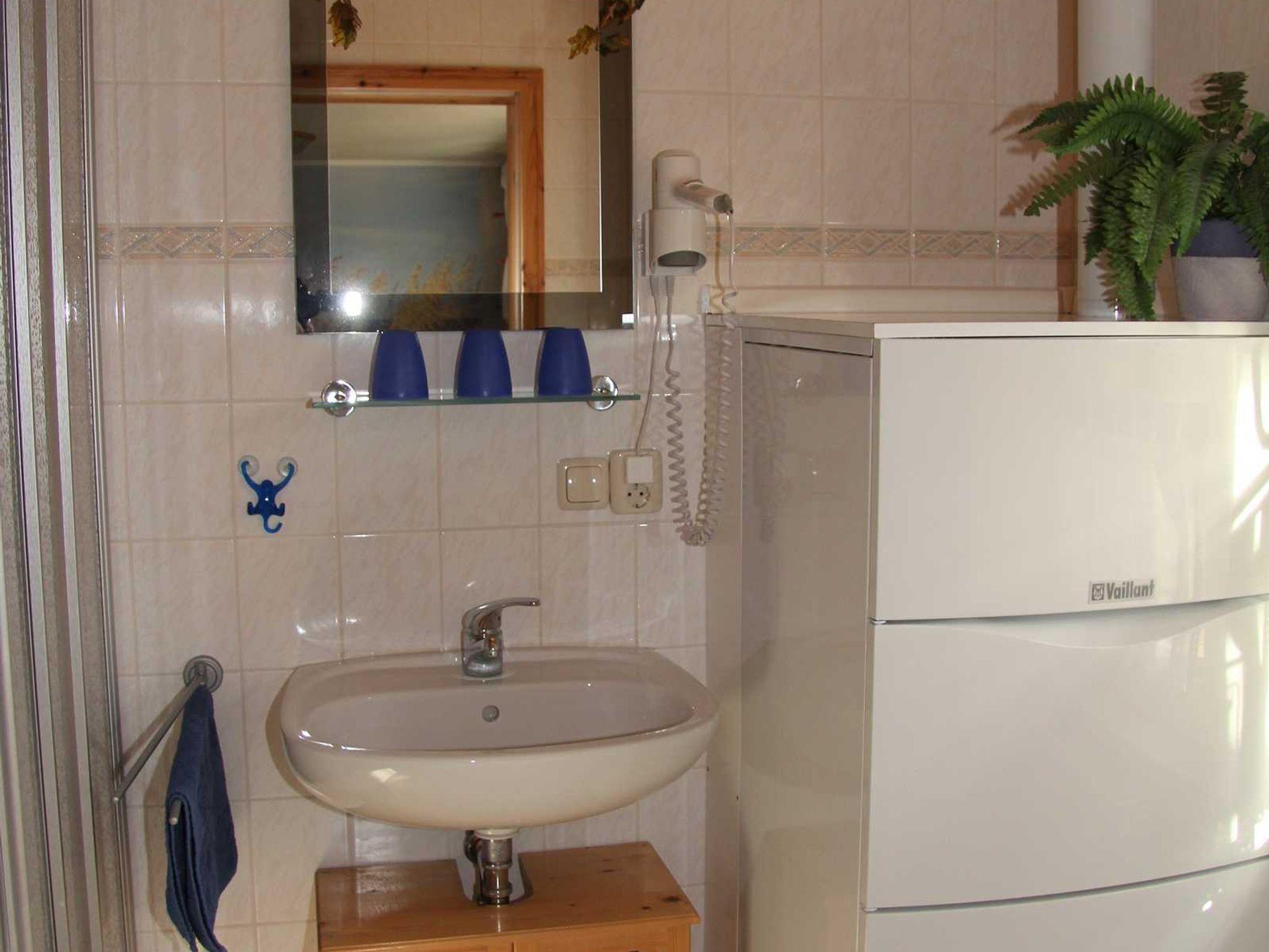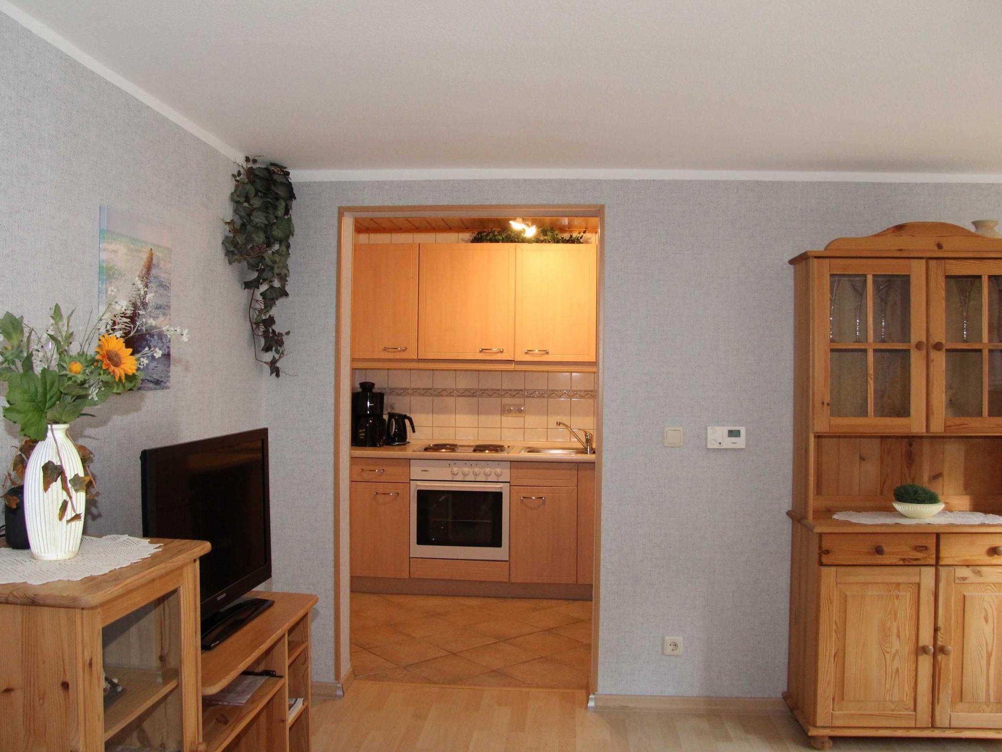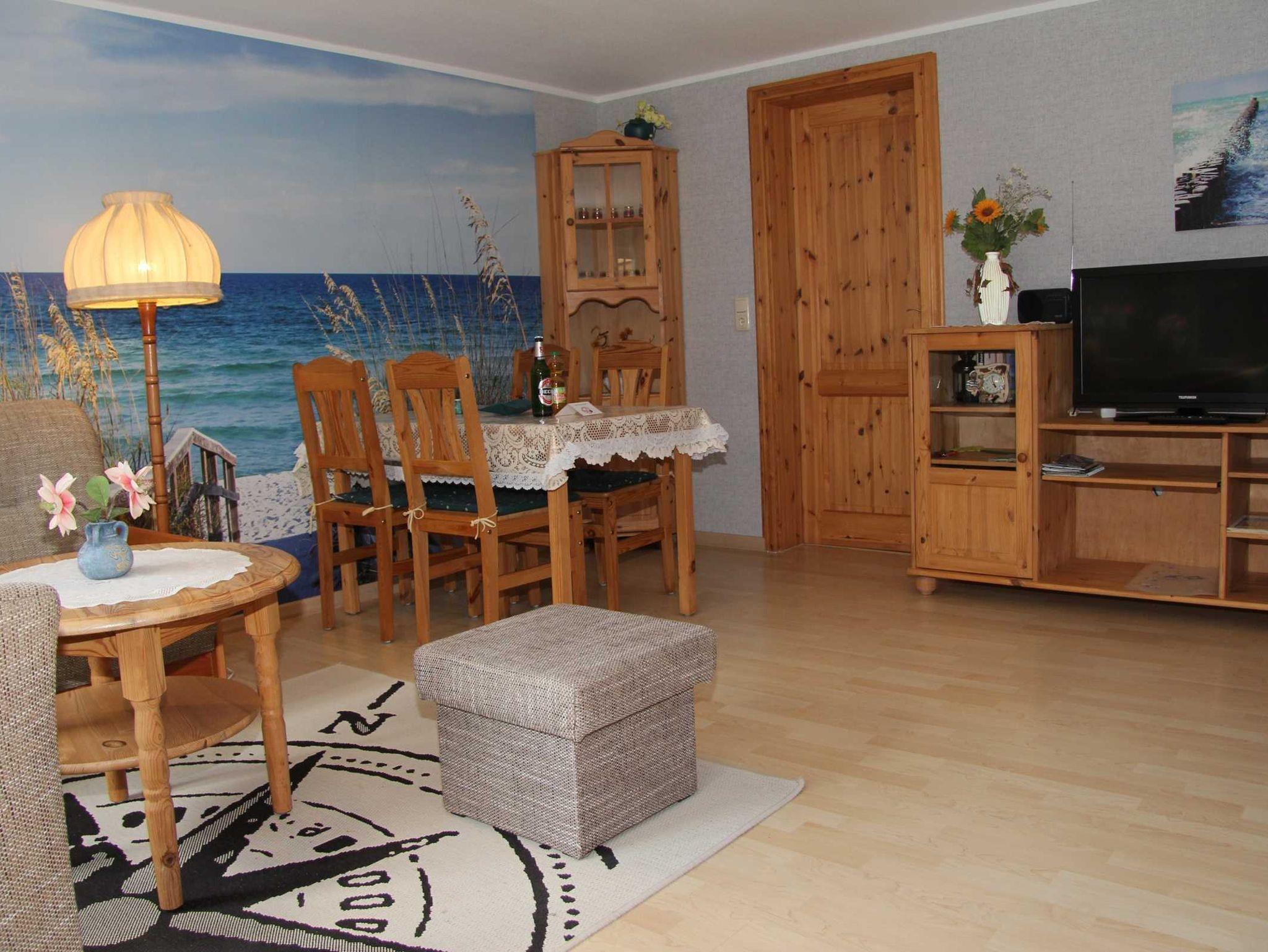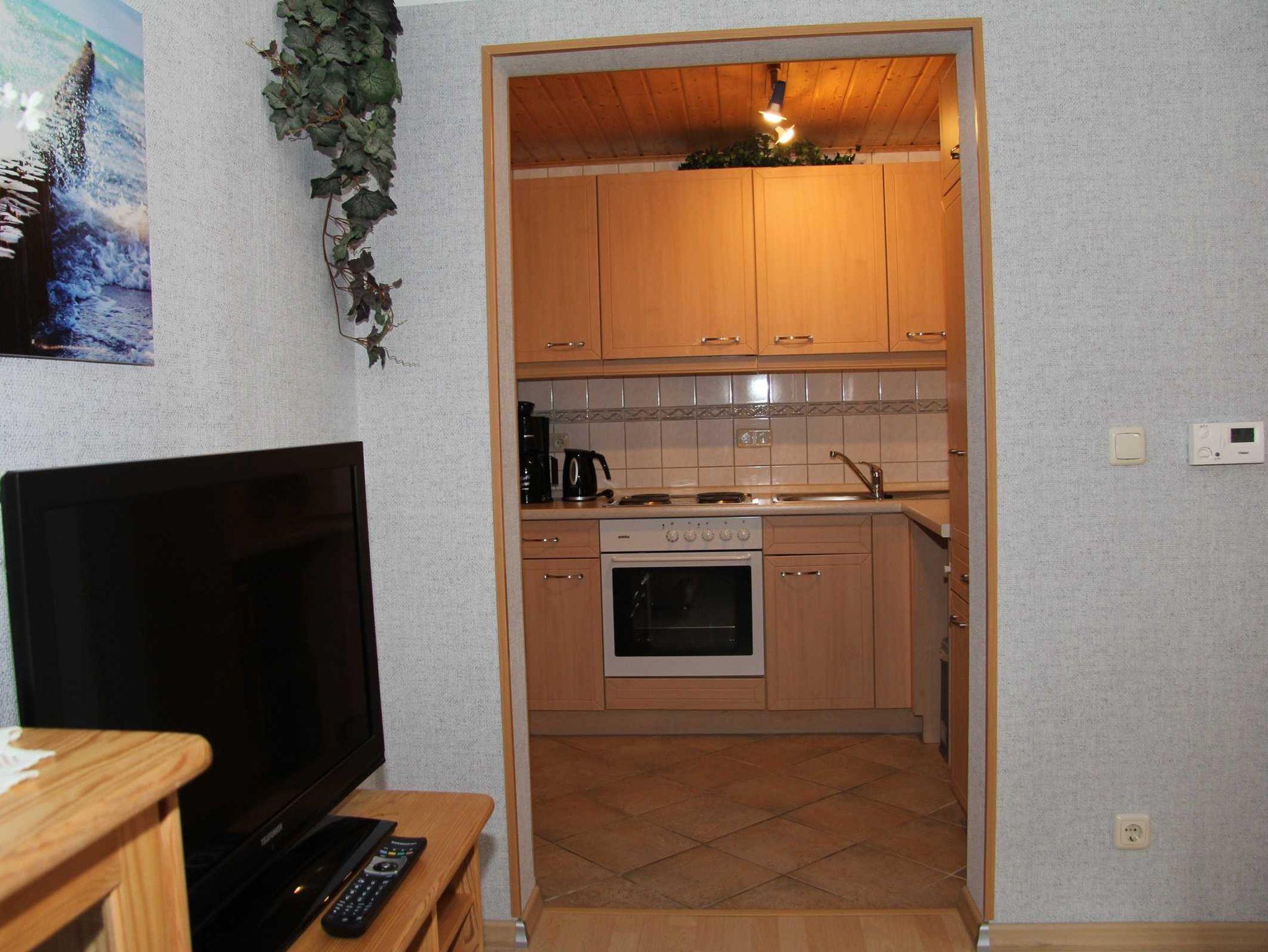 Zur Ausstattung der Wohnung gehört eine Küche mit Backofen, Kühlschrank mit Gefriermöglichkeit, Mikrowelle, Kaffeemaschine und Wasserkocher. Im Wohnzimmer befindet sich eine gemütliche Sitzecke, TV-Flachbild, Radio sowie Esstisch bis zu vier Personen. Das Bad besteht aus Dusche und WC. Die Bettwäsche ist im Preis enthalten. Das Schlafzimmer bietet ein Doppelbett sowie einen großzügigen Kleiderschrank. Auf der eigenen möblierten und überdachten Terrasse zur Südseite können Sie den Abend gemütlich ausklingen lassen.