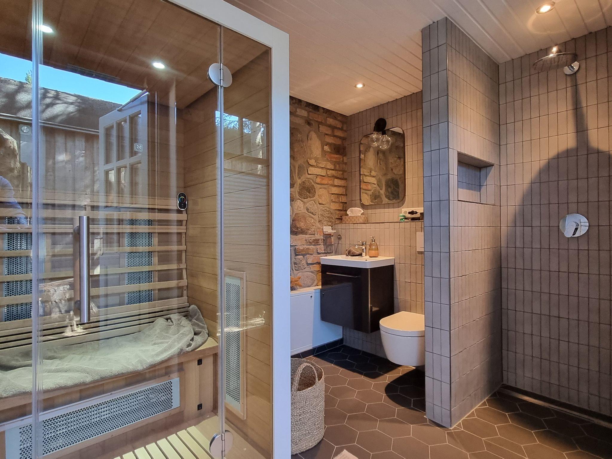 • Das Badezimmer verfügt über eine Dusche, eine Badewanne, ein Waschbecken, ein WC und einen Handtuchtrockenheizkörper