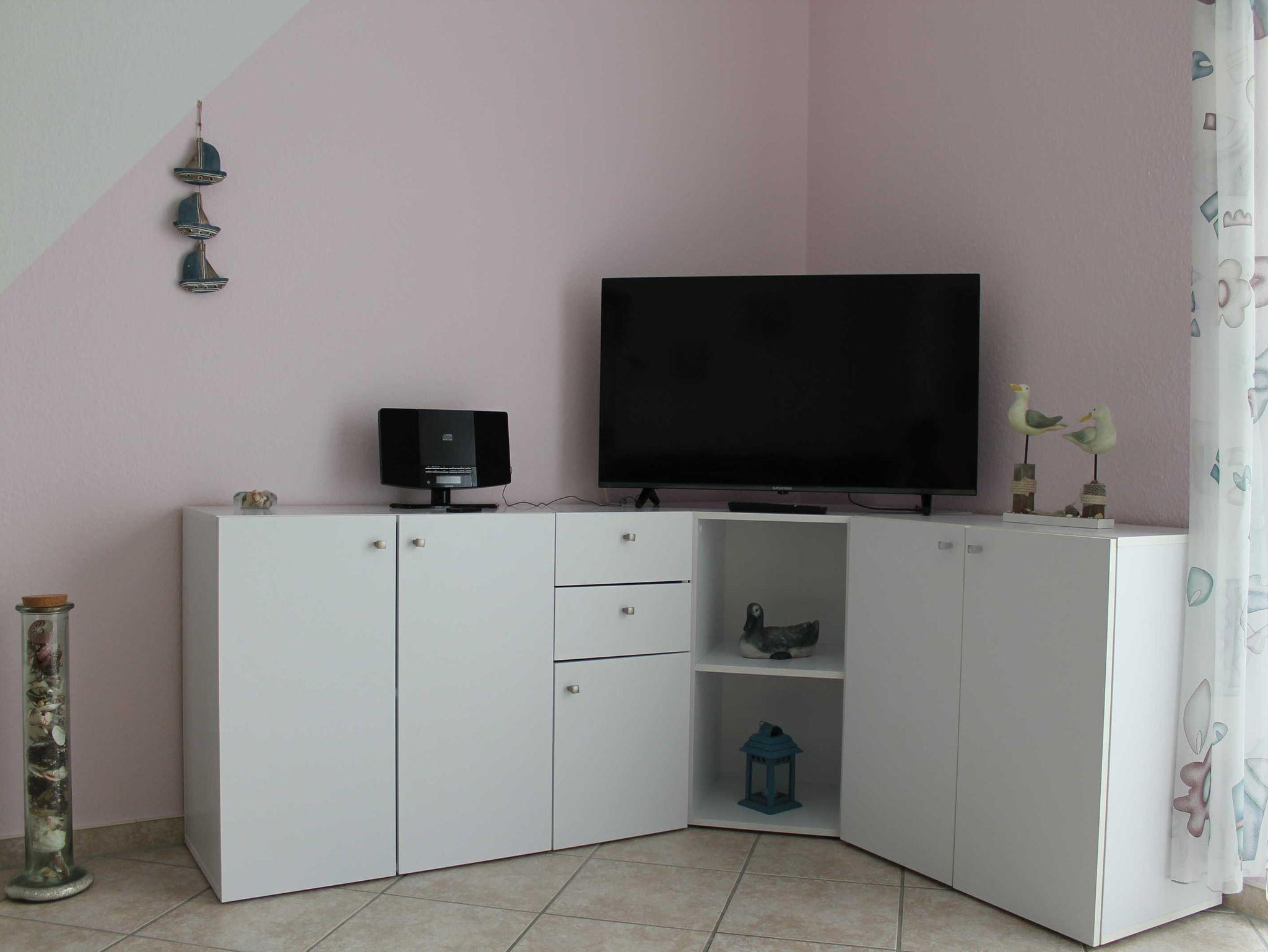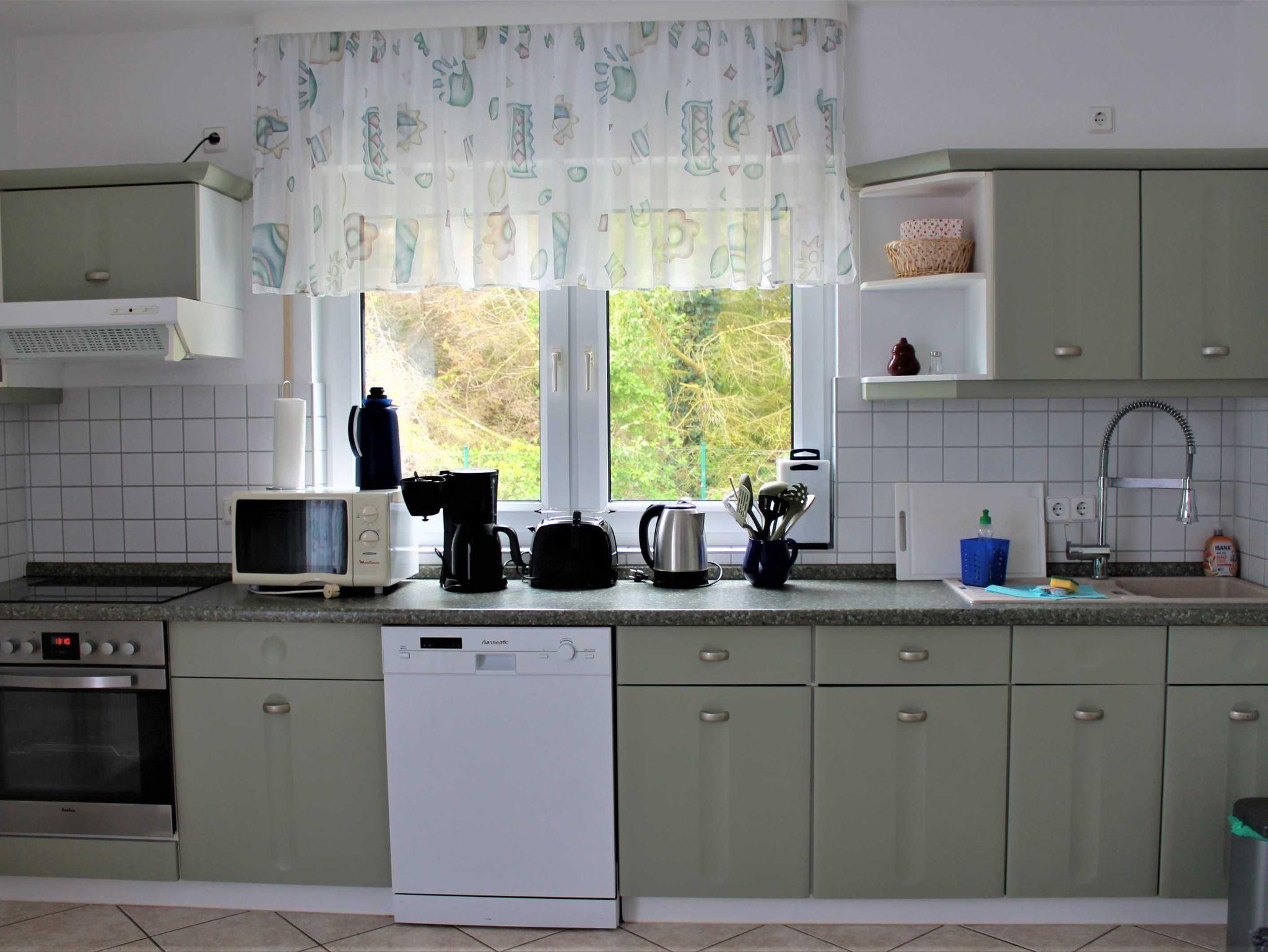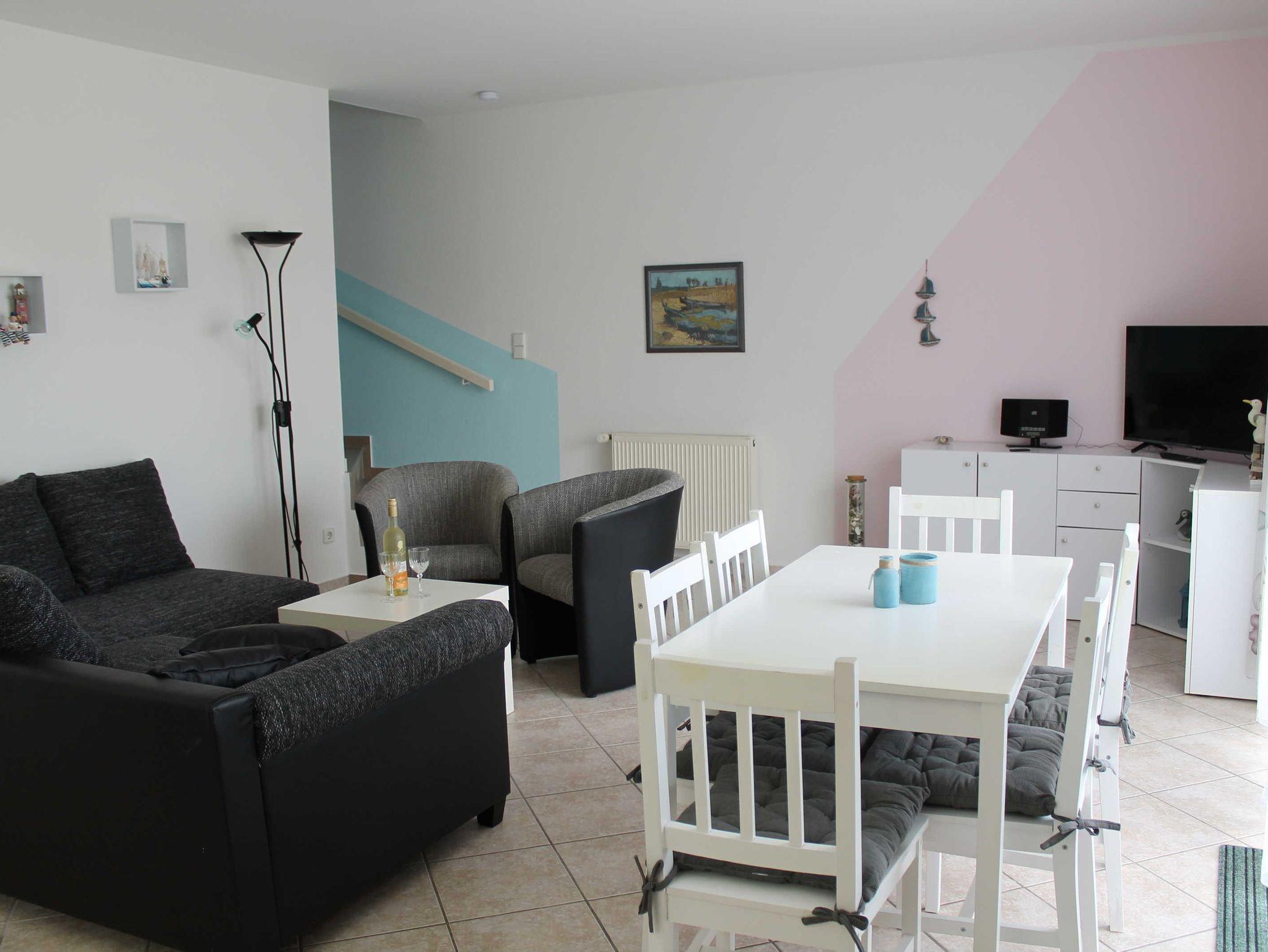 Im großen hellen Wohnzimmer mit Couchgarnitur (2 Aufbettungen möglich), Fernseher, Radio, DVD- und CD-Player ist auch eine Küche und ein Essbereich integriert. Die Küche ist komplett eingerichtet mit Herd, Backofen, Kühlschrank, Geschirrspüler, Mikrowelle, Kaffeemaschine, Toaster und Wasserkocher. Geschirr und Gläser sind ausreichend vorhanden.