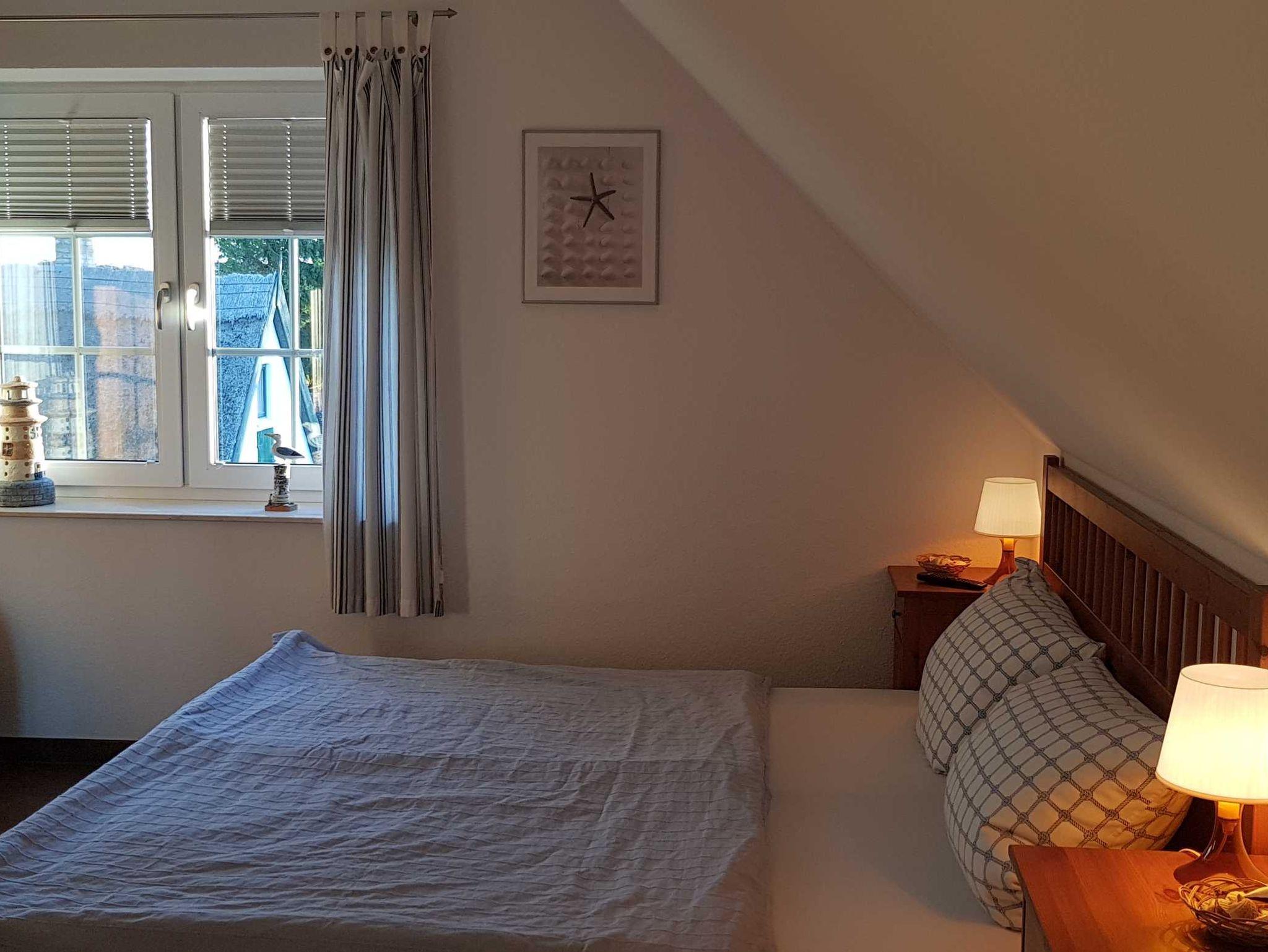 im Obergeschoss über Schlafzimmer mit Doppelbett 1,80 m, Flachbild-TV und einem Schrank,