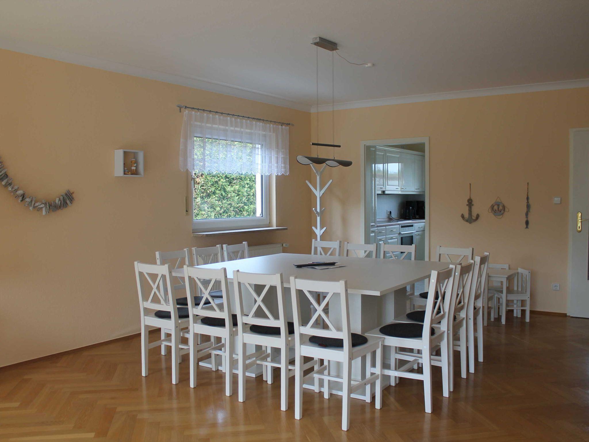 eingerichtet ist. An dem großen Esstisch finden gut 12 Personen Platz.
