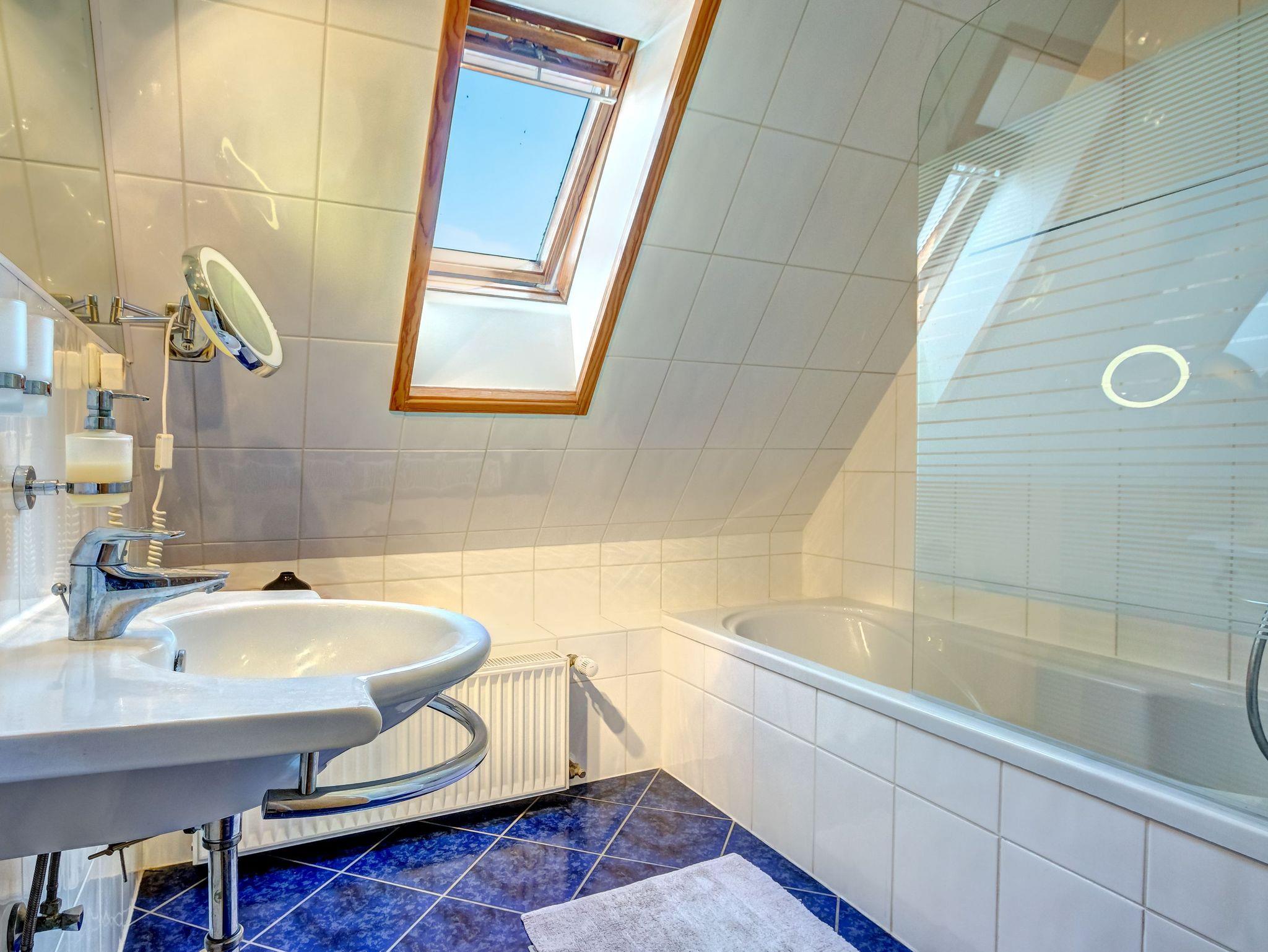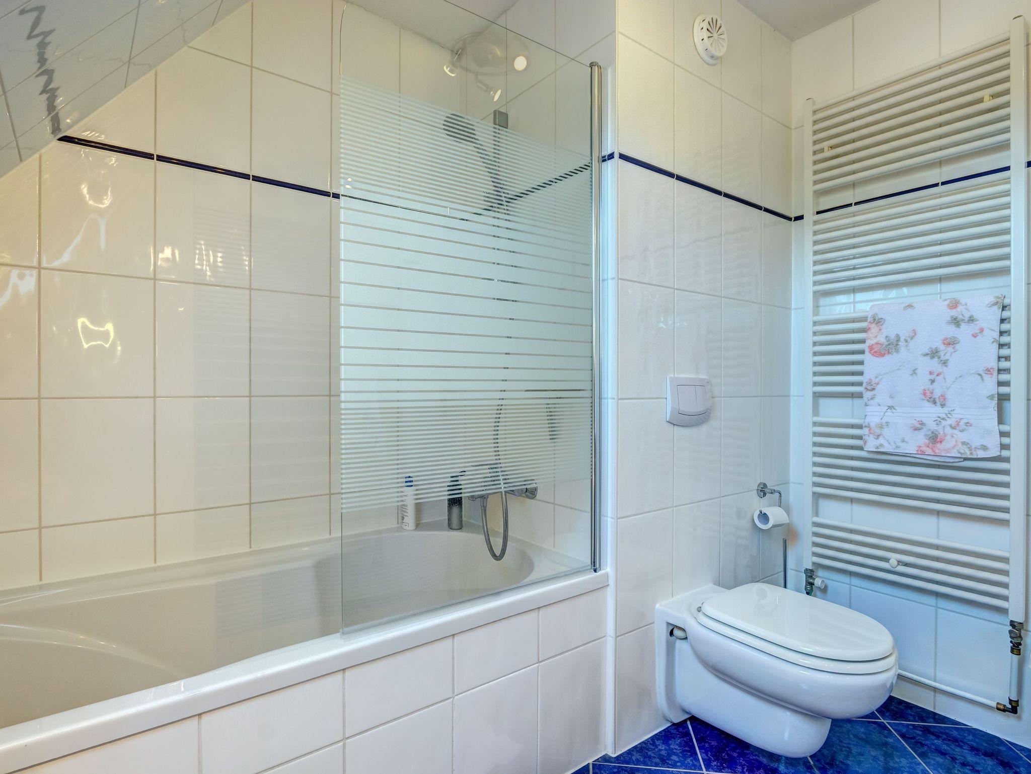 Das geräumige Bad bietet Badewanne mit Dusche, WC und Außenfenster.