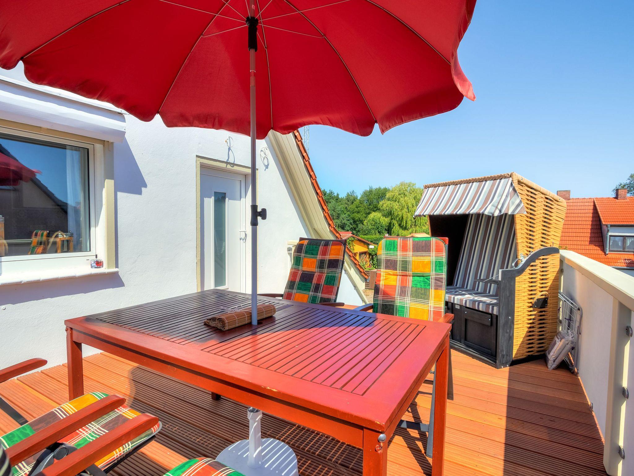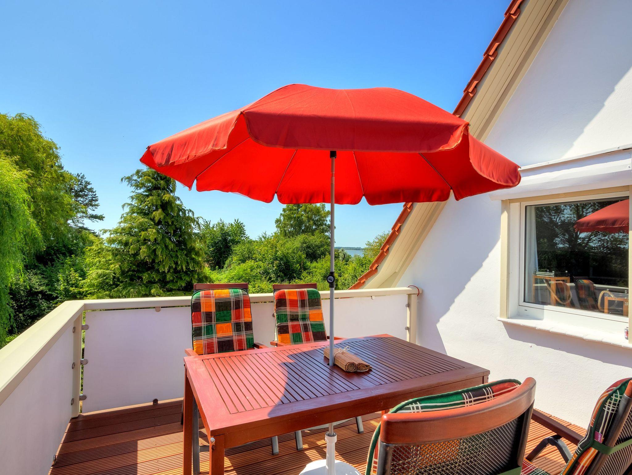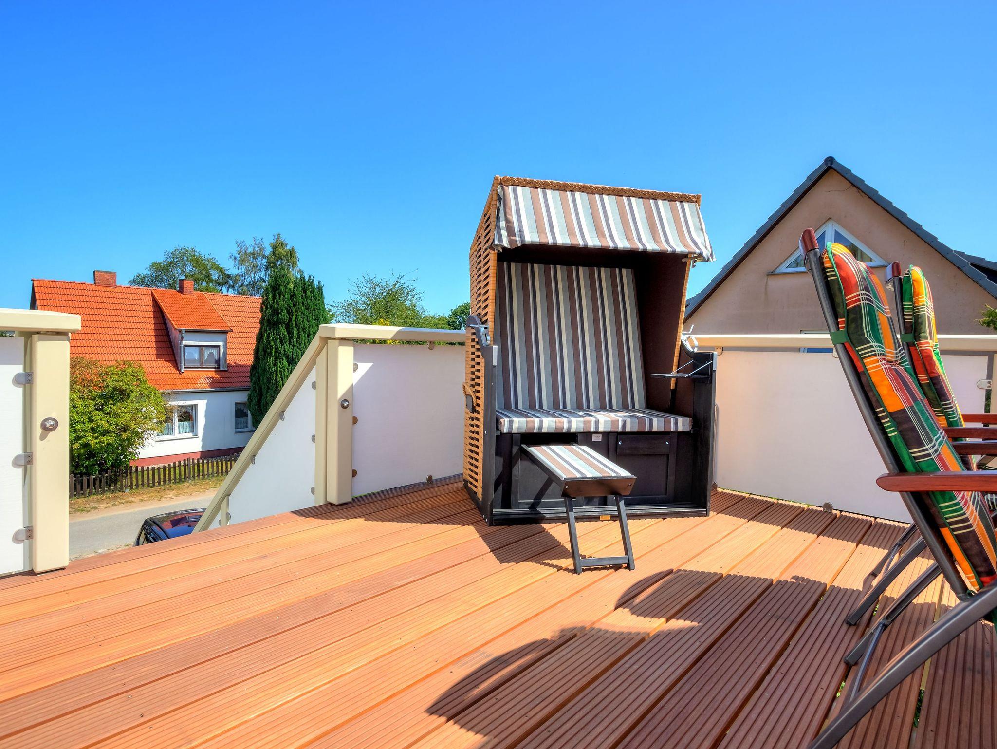Die nach Osten ausgerichtete Balkon-Terrasse lädt auf Gartenmöbeln und einem windschützenden Strandkorb zum Relaxen und Sonnenbaden ein. Frühstücken Sie bei Sonnenschein und genießen Sie die Ruhe und den herrlichen Ausblick.