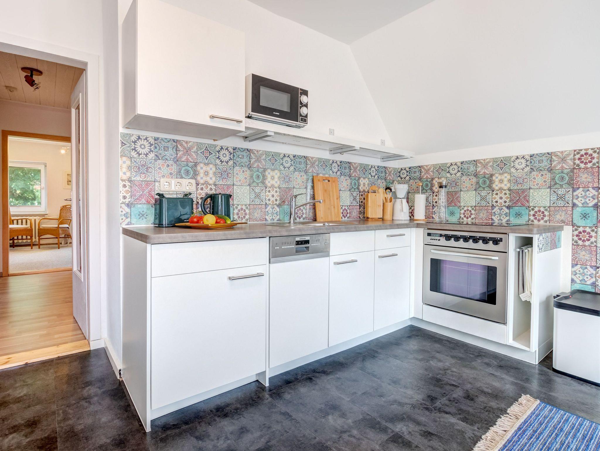 Über eine Außentreppe gelangen sie auf eine ca. 20 m² große Terrasse mit Sitz,- bzw. Liegemöglichkeiten und Grill. Von dort aus betreten Sie die geräumige Wohnung und kommen in eine Wohnküche mit einer voll ausgestatteten Küchenzeile mit Kühlschrank und integriertem Frostfach, Mikrowelle, Herd mit Backofen, Geschirrspüler, Wasserkocher, Toaster, Kaffeemaschine und weiteren nützlichen Ausstattungselementen.