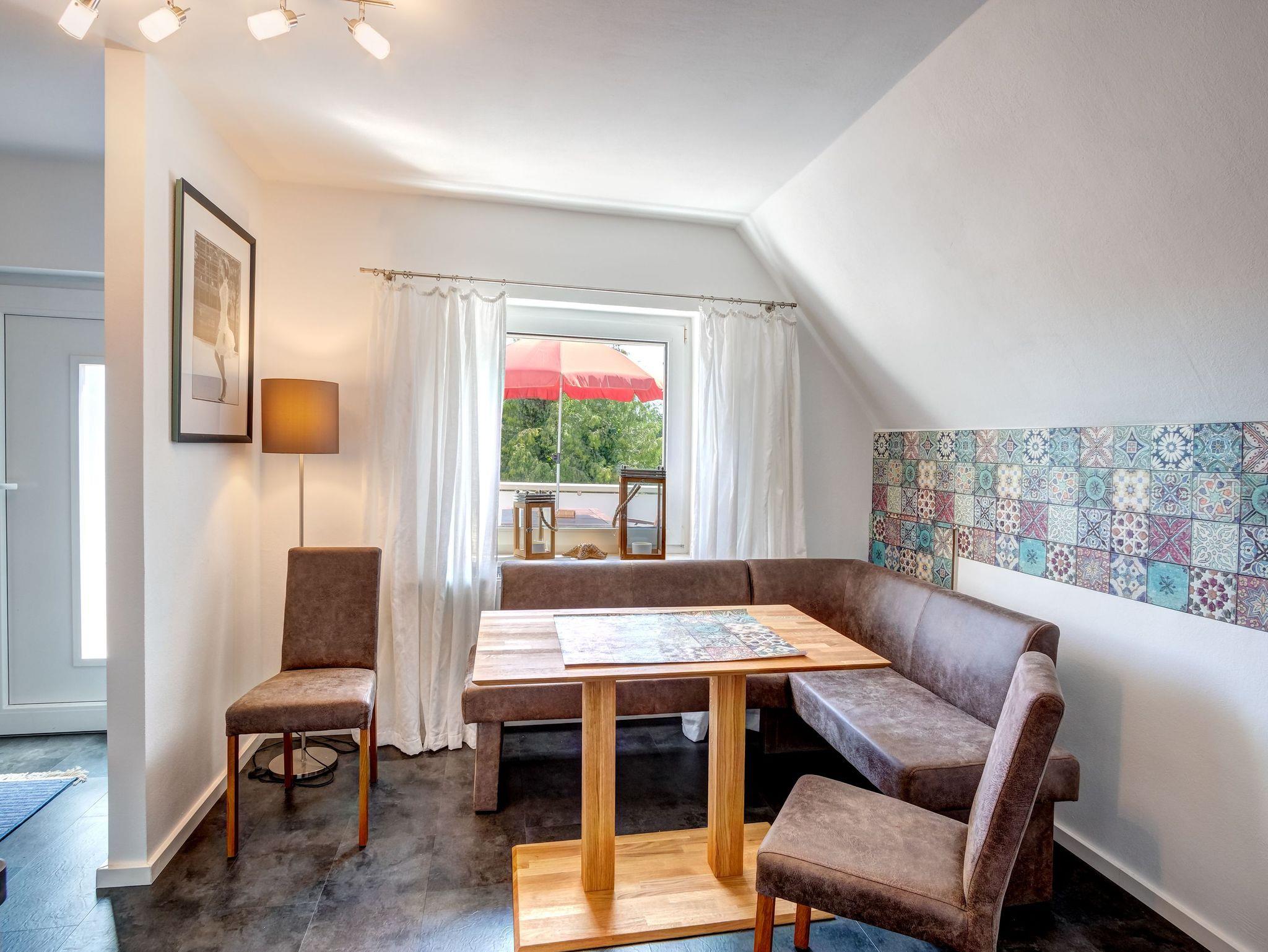 Angrenzend steht Ihnen ein Esstisch mit 2 Stühlen und einer Polstereckbank mit Flachbild TV zur Verfügung.