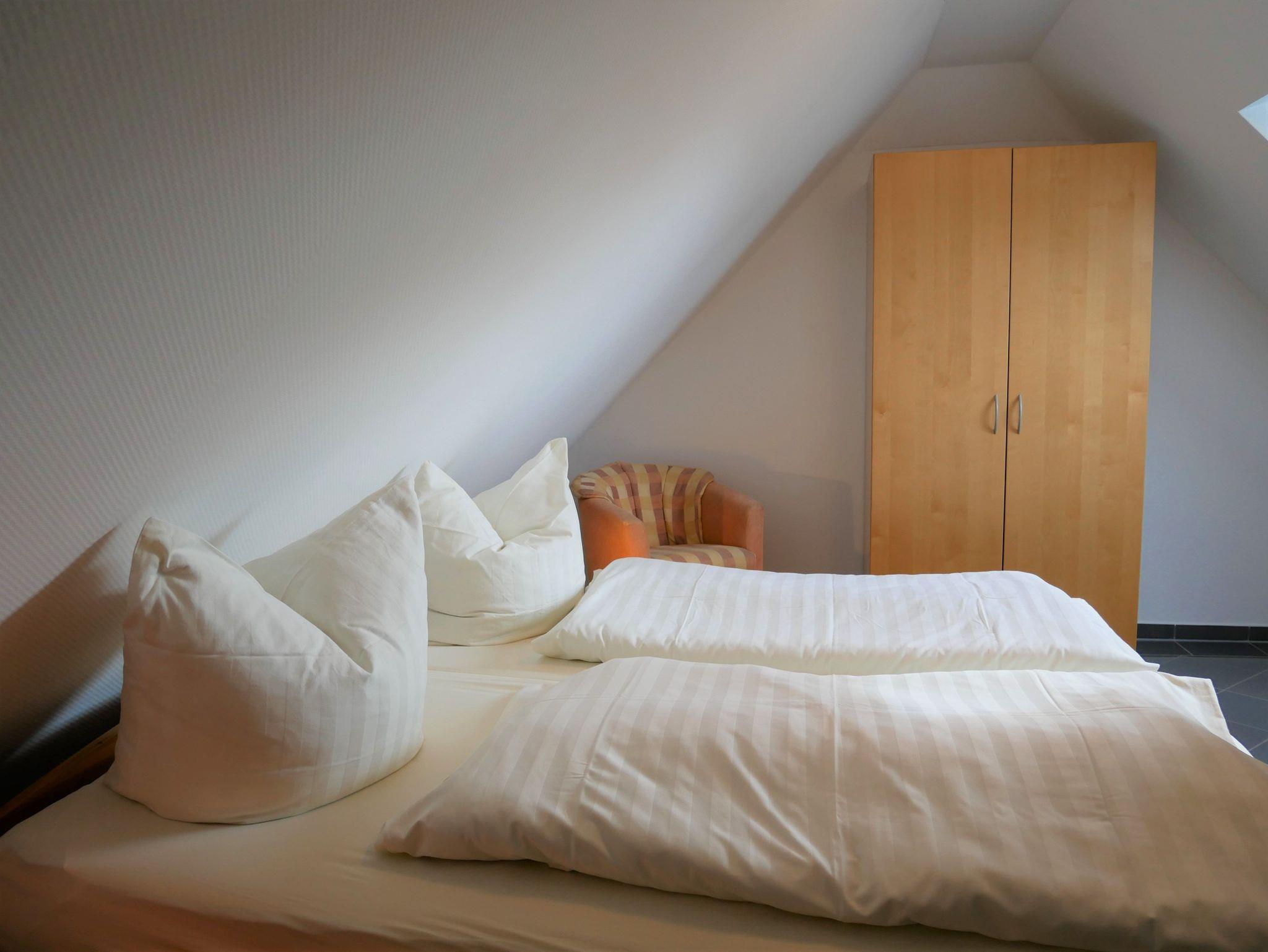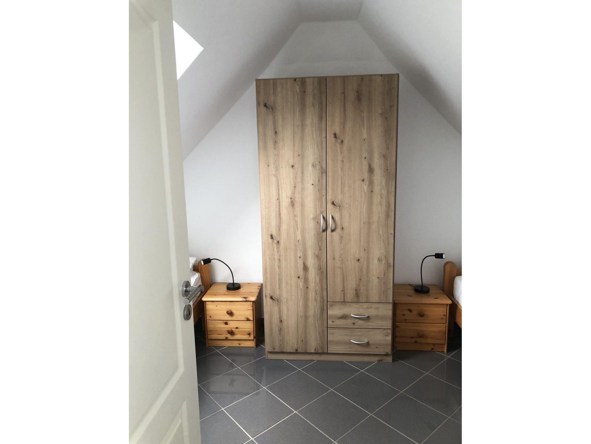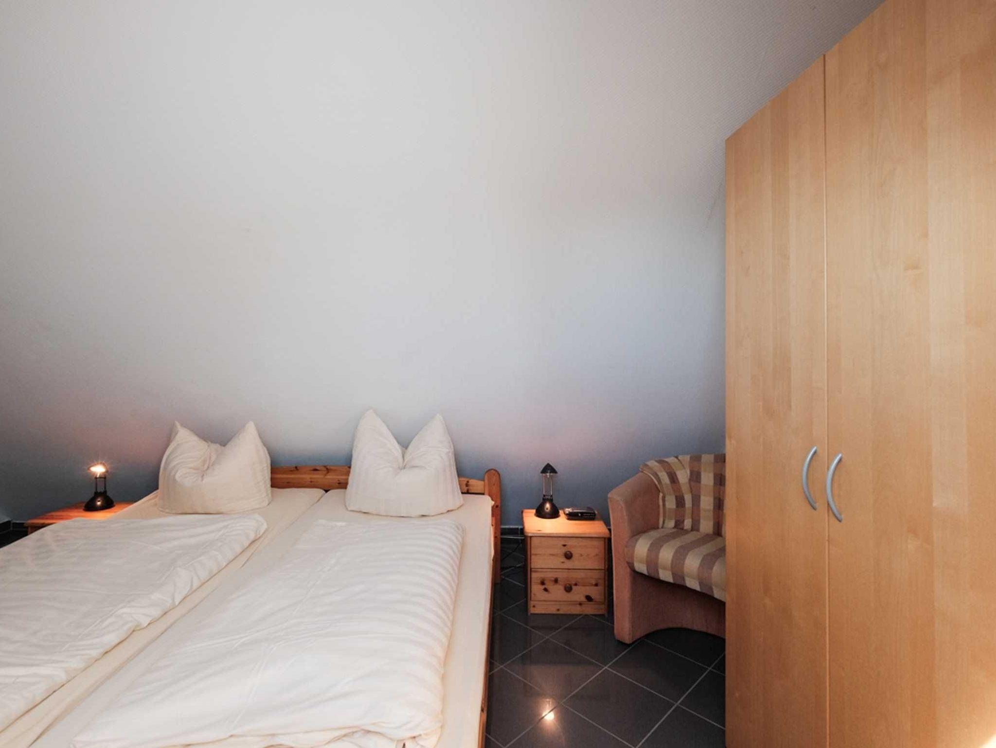 Die beiden Schlafzimmer befinden sich im Dachgeschoss und sind über eine Raumspartreppe zu erreichen. (Achtung, es handelt sich um eine steile Treppe und ist für Gäste mit Geh- oder Sehbehinderung, sowie für kleine Kinder nicht geeignet). Ein Schlafzimmer verfügt über ein gemütliches Doppelbett, einen Kleiderschrank und zwei Sesseln. Das zweite Schlafzimmer ist mit zwei Einzelbetten und mit einem Kleiderschrank ausgestattet. Das Badezimmer verfügt über eine Dusche.