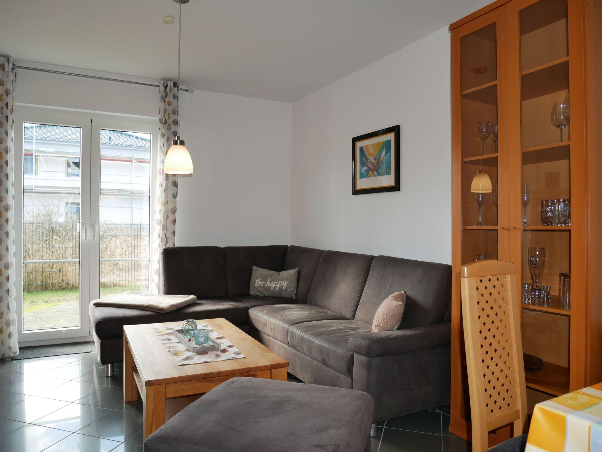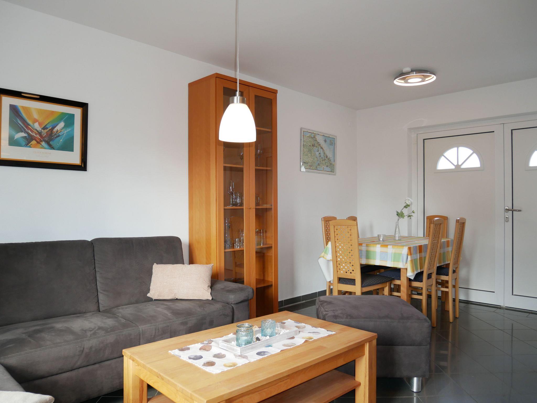 Die helle, großzügige und exklusiv eingerichtete 3-Raum-Maisonette-Ferienwohnung befindet sich im Nebenhaus, ist ca. 55 m² groß und für 4 Personen geeignet. Das Wohnzimmer befindet sich im Erdgeschoss und ist mit einer gemütlichen Eckcouch, Flachbildfernseher und Musikanlage ausgestattet. Die separate Einbauküche verfügt über ein Cerankochfeld, erhöhter Backofen, Kaffeemaschine, Kühlschrank mit Gefrierfach, Toaster und Wasserkocher.