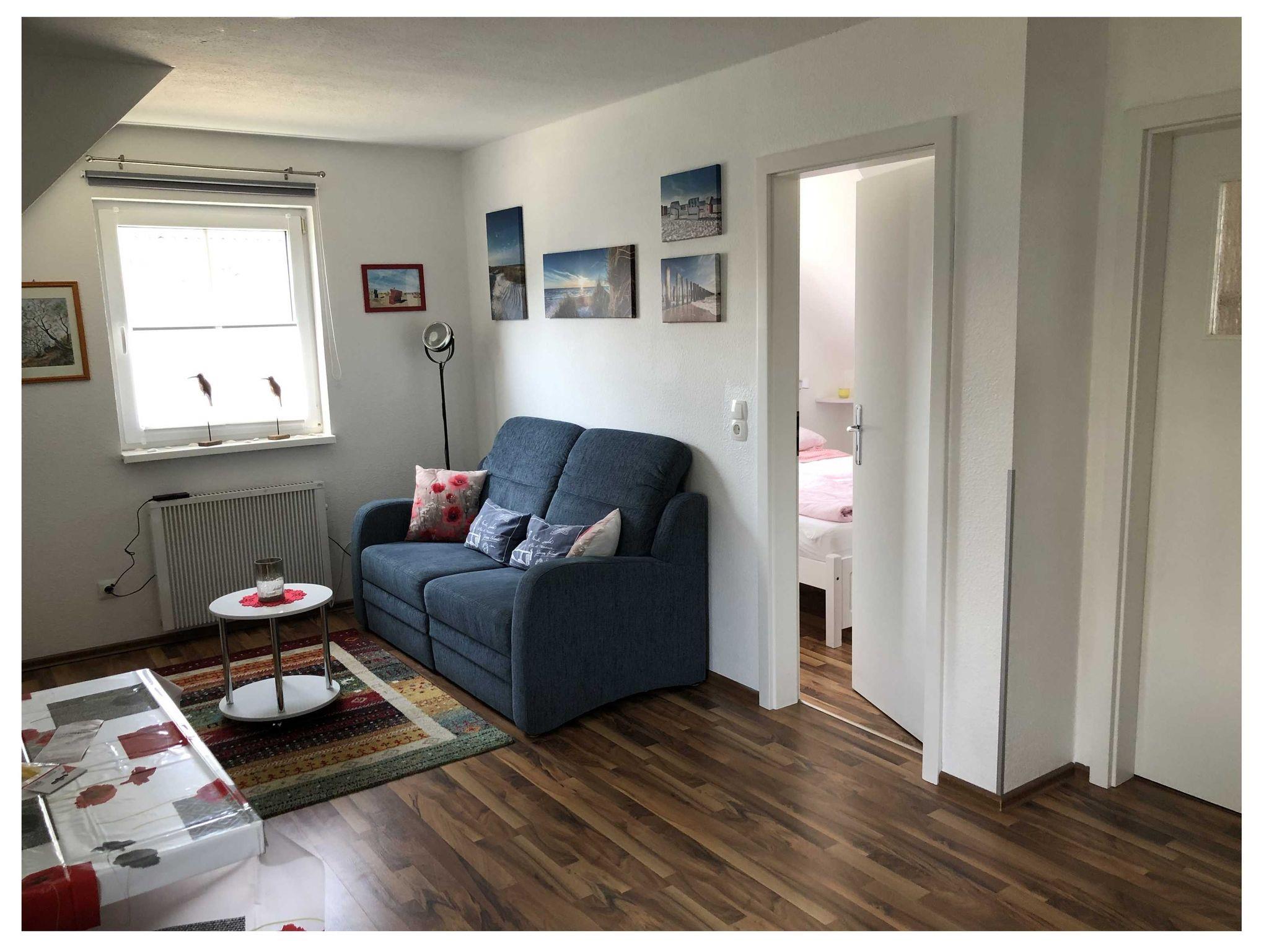 Ferienwohnung,40 qm groß, ganzjährig nutzbar im OG einer Anlage mit 6 Ferienwohnungen, verteilt auf 2 Häuser auf einem 900 m2 großen Grundstück. Wohnraum mit gemütlicher Couch, großem Esstisch, Elektrokamin, Sat-TV.