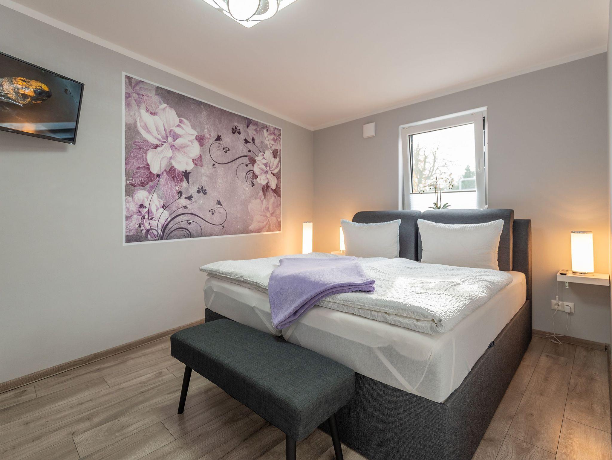 • Ein Schlafzimmer mit einem komfortablen Boxspringbett,