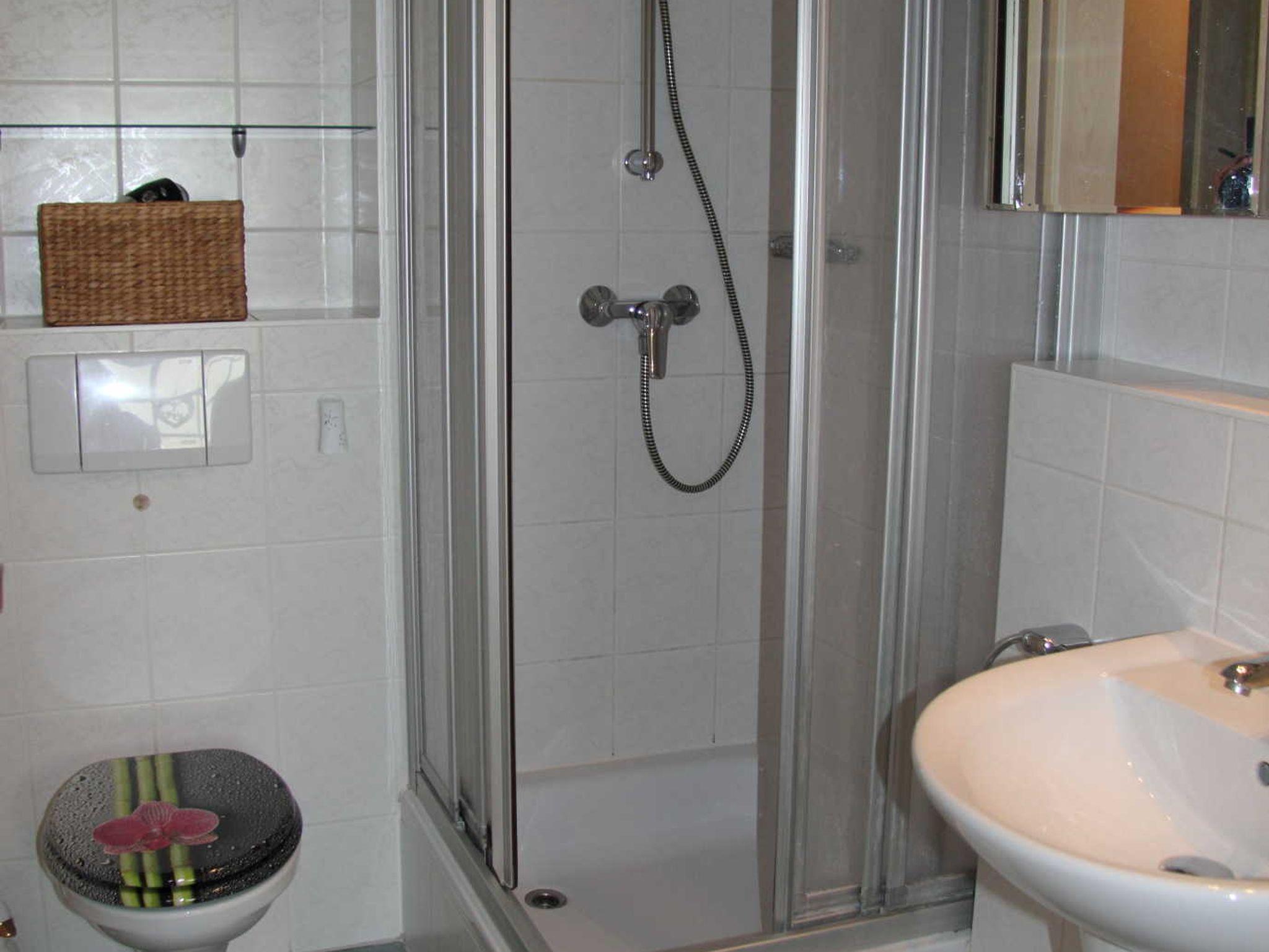 Bad mit Dusche, WC, Waschbecken, Fön, sowie einem großen Spiegelschrank als Ablagefläche,