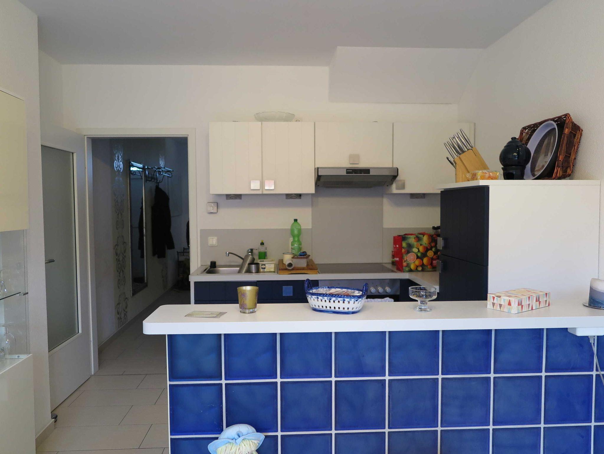 -Küche voll ausgestattet mit Geschirr, Besteck, Geschirrspüler, Kaffeemaschine, Toaster, Wasserkocher, Auflaufformen, Teekanne, E-herd mit Ceran-Kochfeld und Backofen, Kühlschrank, Gefrierschrank