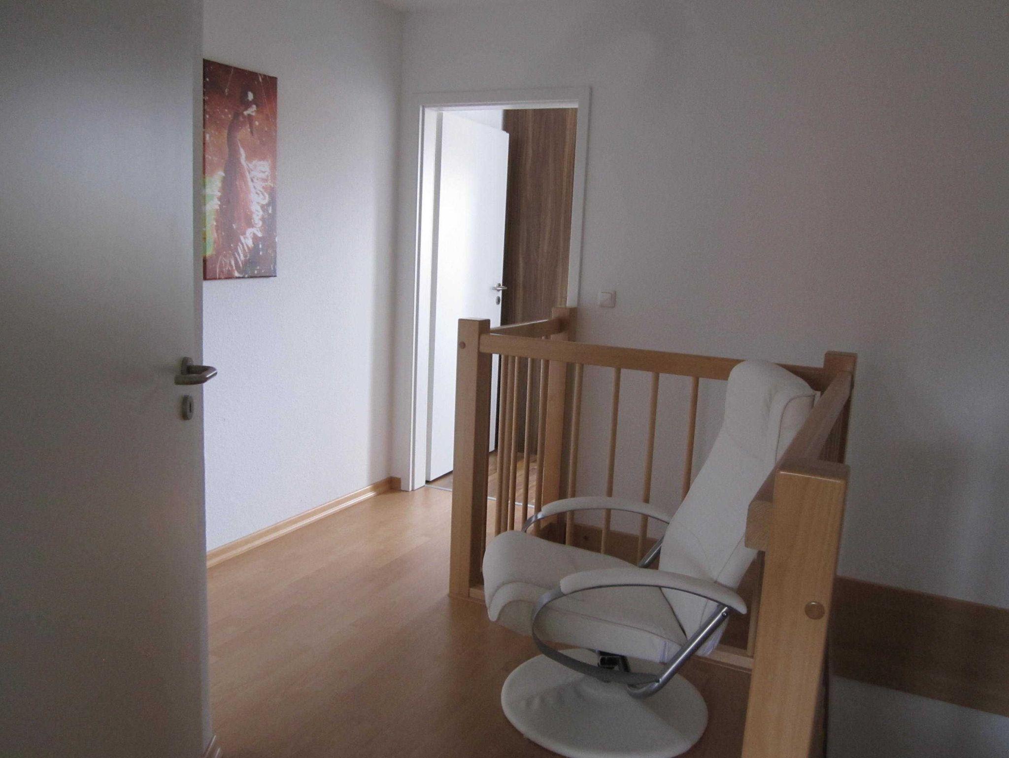 Die obere Etage mit zwei Schlafzimmern und einem zweiten Bad mit Dusche und WC, bietet einen weiteren Balkon. Im größeren Schlafzimmer ist ein weiterer kleiner Fernseher (26 Zoll Flach TV-Sat).