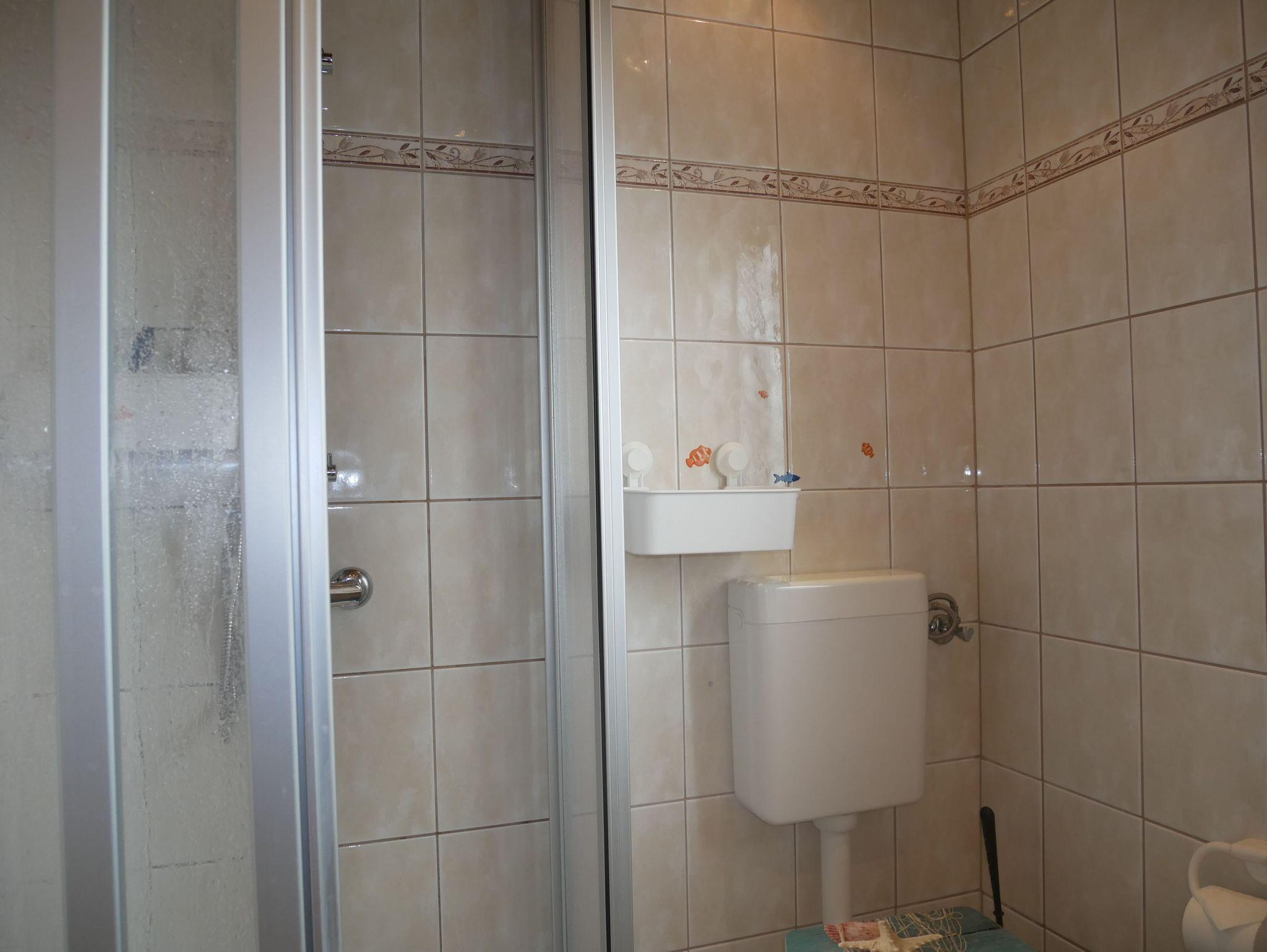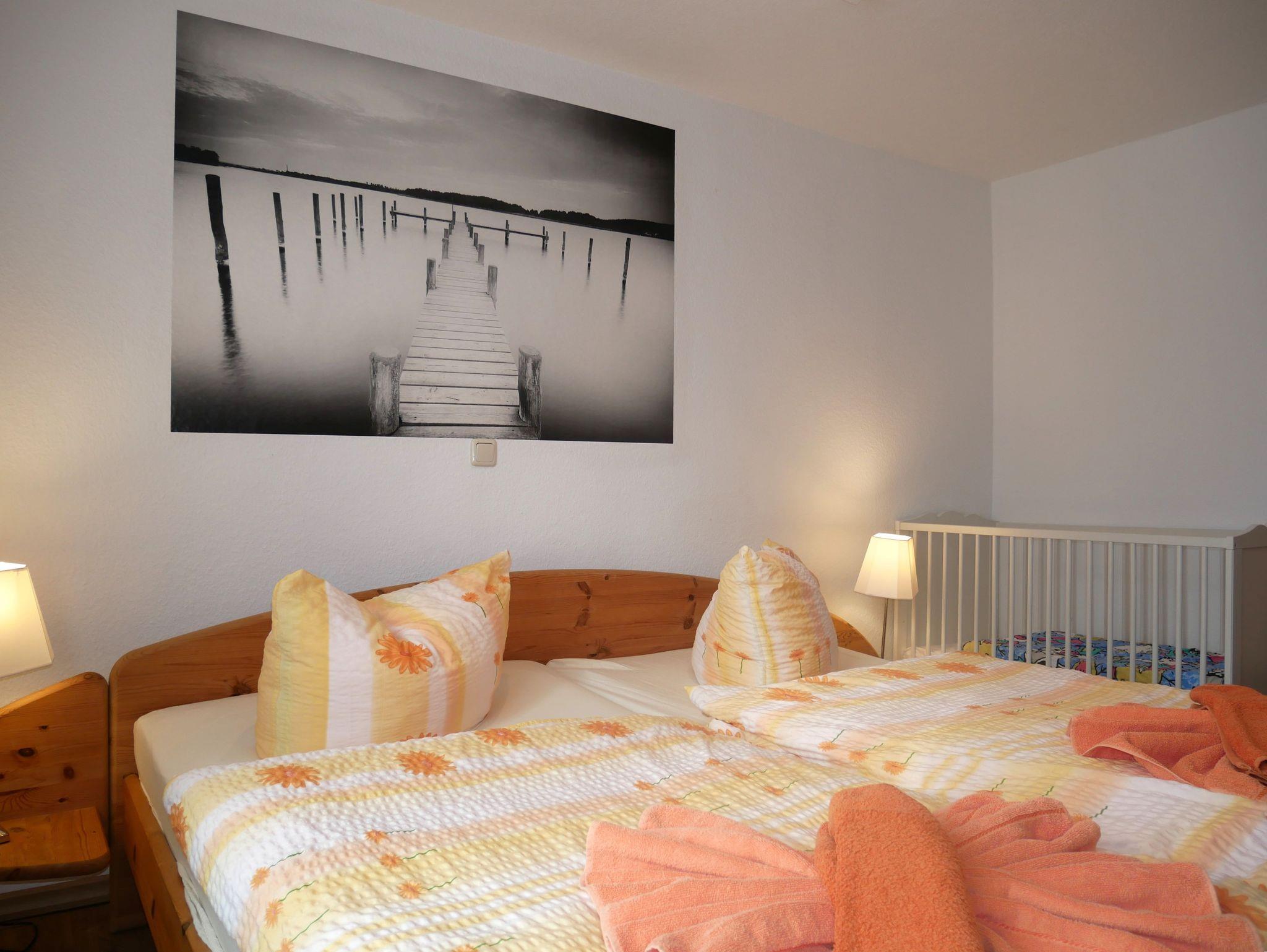 Das Hauptschlafzimmer ist mit einem gemütlichen Doppelbett, einem Holzbabybett und einem Kleiderschrank ausgestattet. Ein weiteres Schlafzimmer bietet zwei Einzelbetten und eignet sich ideal für Kinder oder mitreisende Erwachsene. Das Badezimmer ist kompakt, aber funktional und verfügt über eine Dusche.
