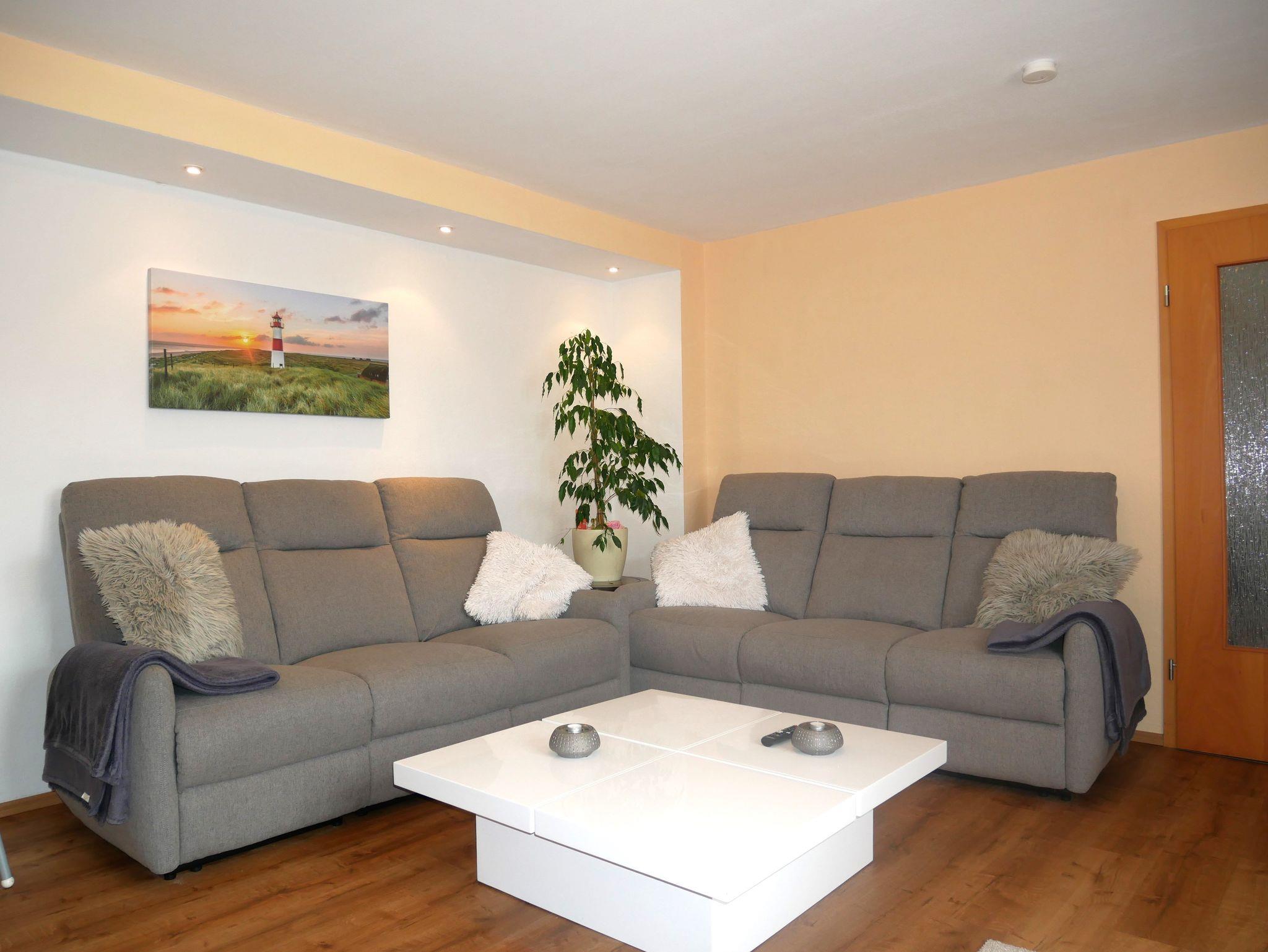 Das großzügige Wohnzimmer lädt mit zwei komfortablen Couchen mit Relaxfunktion zum Entspannen ein. Für Unterhaltung sorgen ein Flachbild-Smart-TV, ein DVD-Player, ein VHS-Player sowie eine Auswahl an Gesellschaftsspielen. Eine kleine Bibliothek mit Büchern für Erwachsene und Kinder sowie eine Sammlung von DVDs und VHS-Kassetten rundet das Angebot ab.