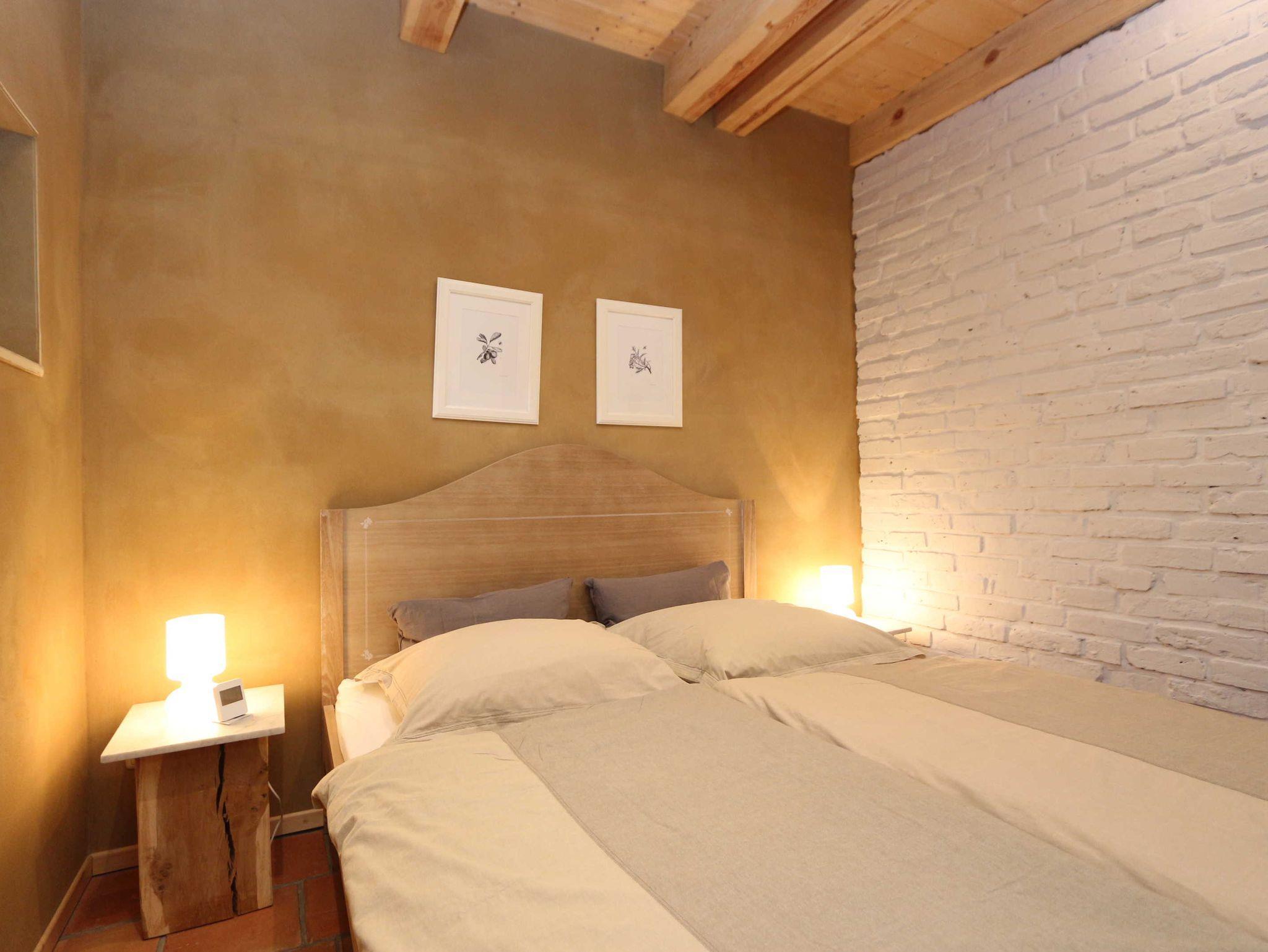 • Das Schlafzimmer im Erdgeschoss verfügt über ein Doppelbett (1,80 x 2,00m) und einem Kleiderschrank