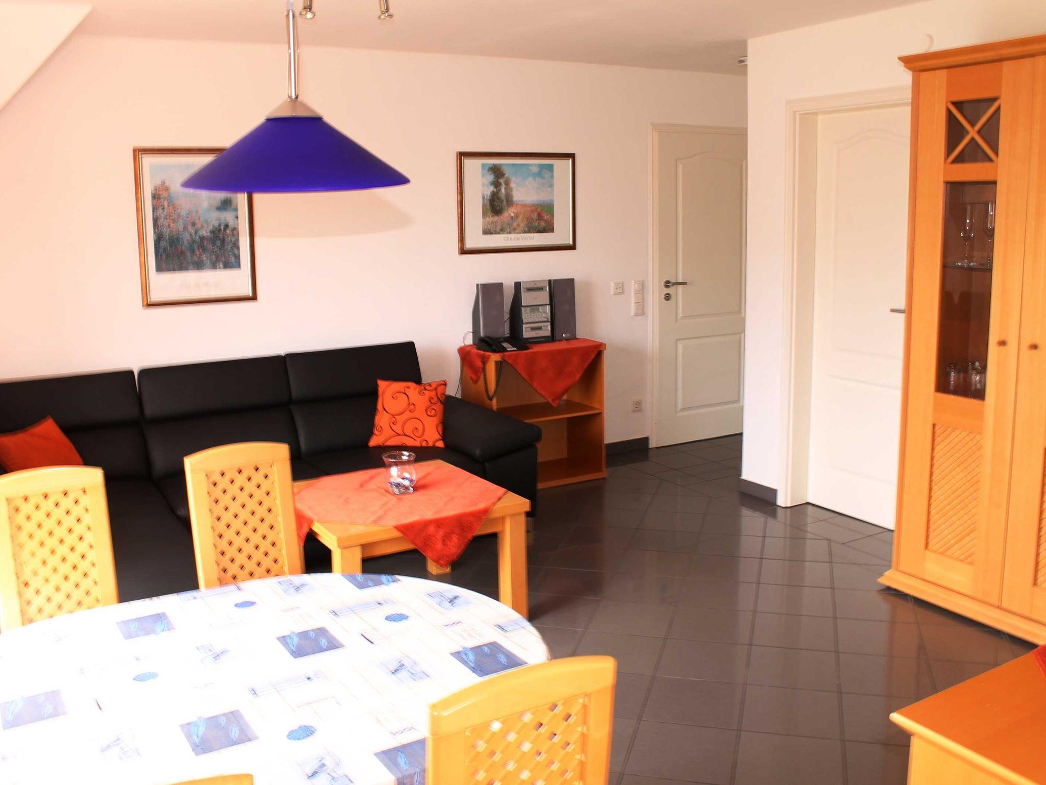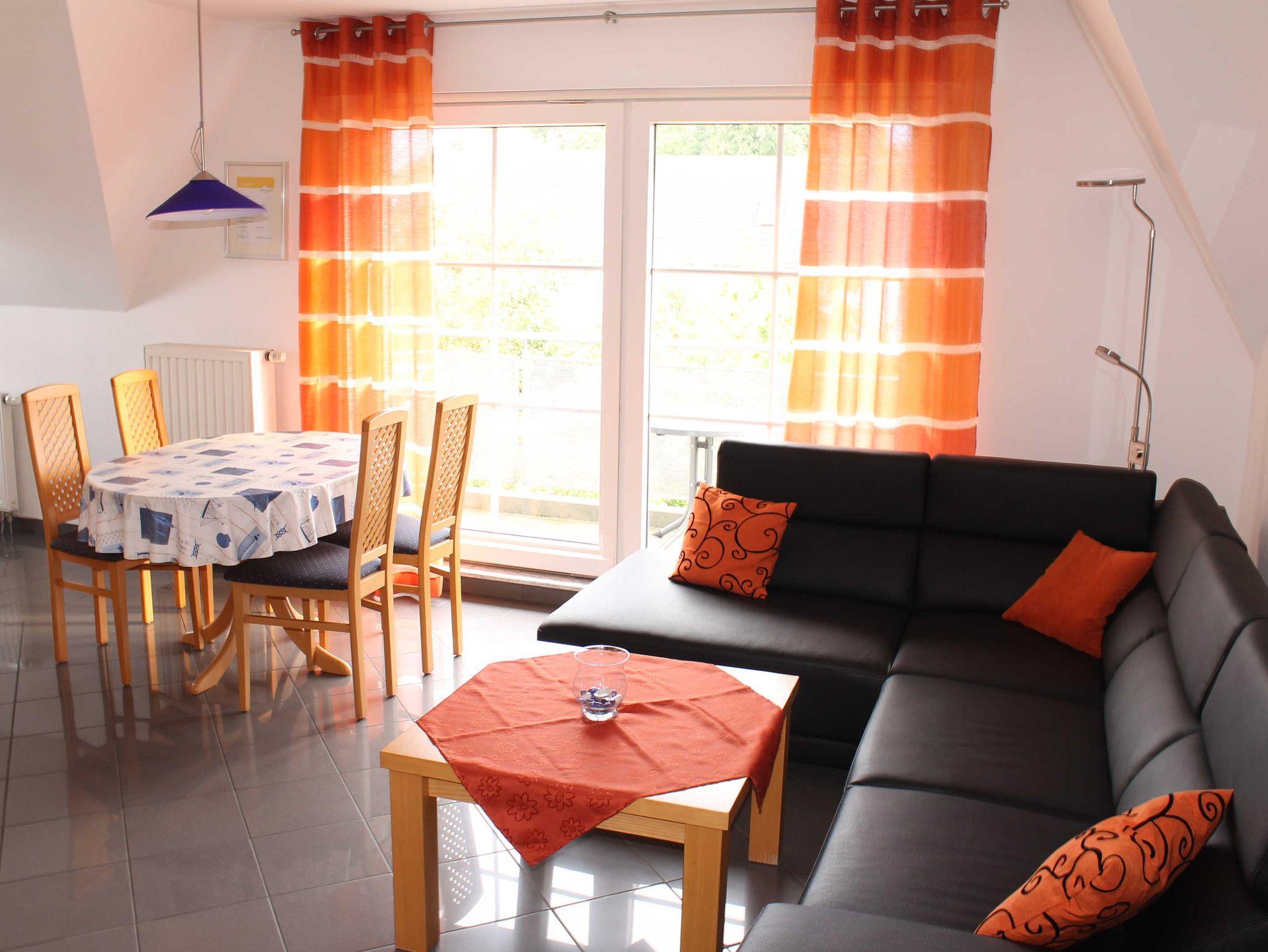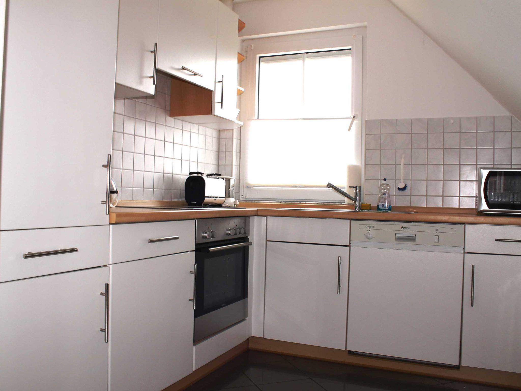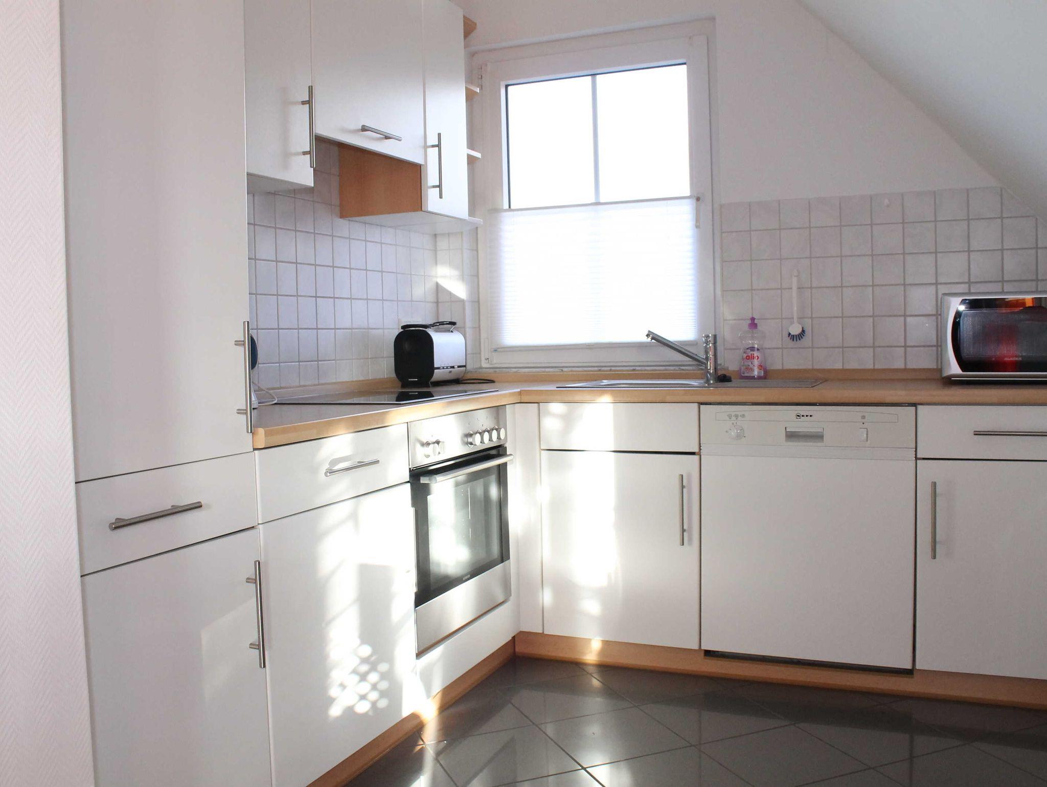 Sie wohnen in einer 60 qm großen 3-Raum-Komfortwohnung für 4 Personen. Der helle Wohnbereich hat eine komfortable Wohnlandschaft mit Essbereich. Die angrenzende Einbauküche ist ausgestattet mit Cerankochfeld, Backofen, Spülmaschine, Mikrowelle, Kühlschrank mit Gefriermöglichkeit, Wasserkocher, Eierkocher, Toaster und Kaffeemaschine.