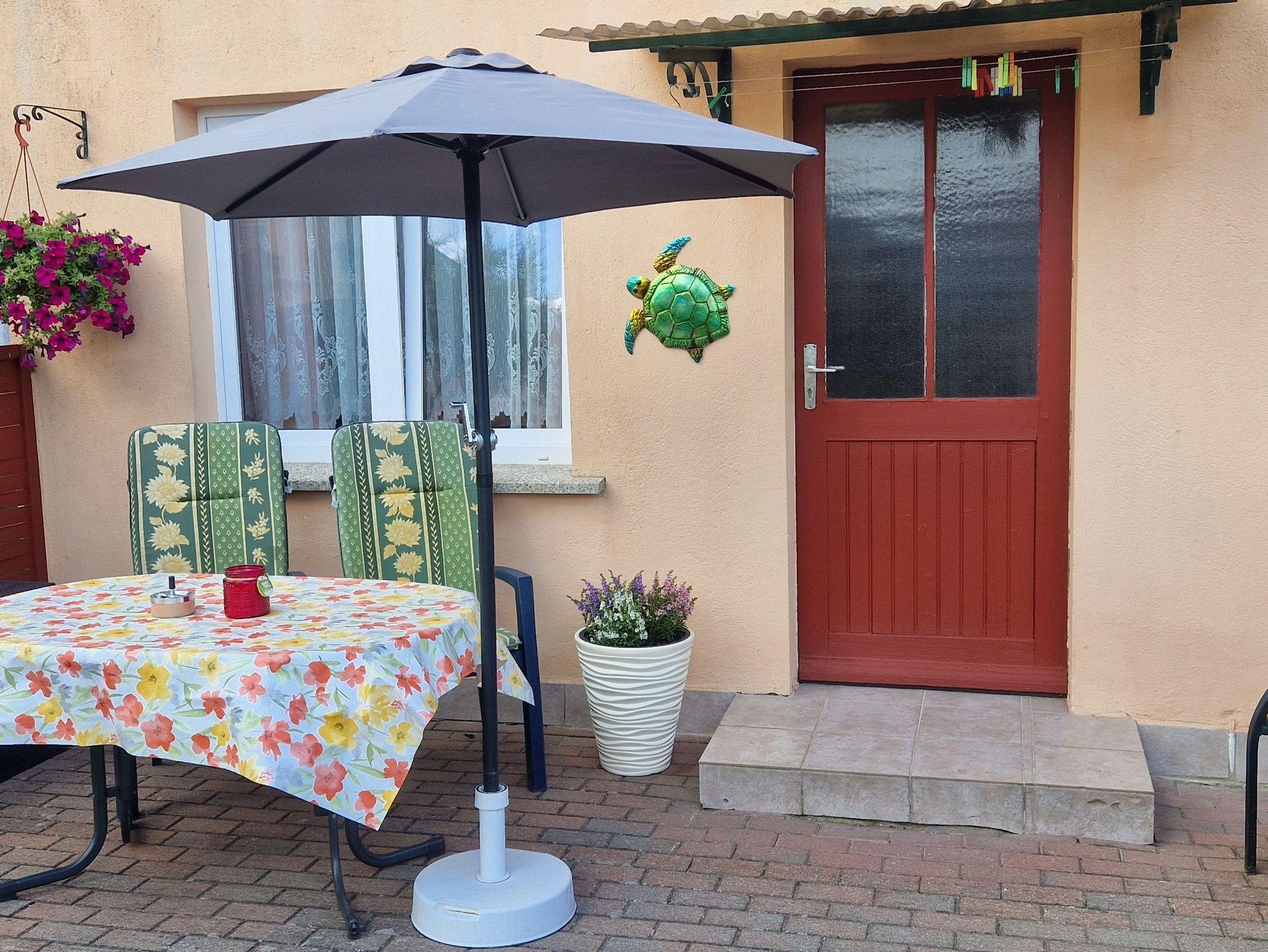 Vor dem Bungalow können Sie auf der sonnigenTerrasse verweilen. Ein Grill kann ausgeliehen werden.