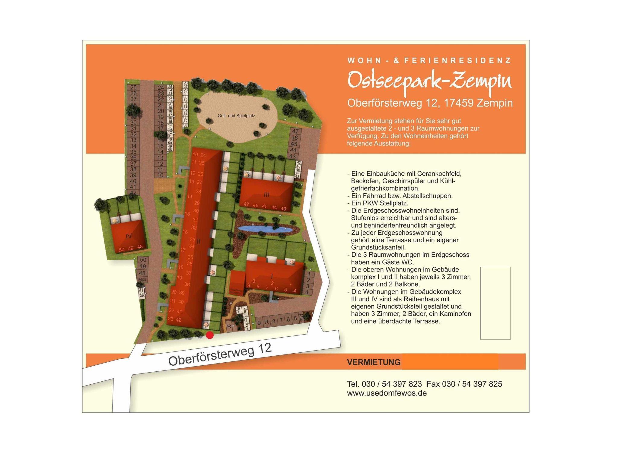 Die Ferienresidenz Ostseepark- Zempin liegt idyllisch hinter den Dünen in dem malerischen Ostseebad Zempin. Die Ferienwohnung wird ganzjährig für max.5 Personen vermietet. Die neu eingerichtete Ferienwohnung mit einer Größe von 82m² lädt mit ihrem gemütlichen Ambiente und dem beiden Balkonen zum Wohl fühlen ein. Hier kann man den Alltagsstress abschalten und sich in angenehmer Atmosphäre wohl fühlen. Für Familien mit Kindern ist gesorgt, ein schöner Spielplatz befindet sich innerhalb der Anlage. Auf dem Gelände befindet sich ein gemeinschaftlicher Grillplatz der genutzt werden kann sowie ein gemeinschaftlicher Wasch- und Trockenraum mit 2 Waschmaschinen und 1 Trockner (gegen Gebühr).
