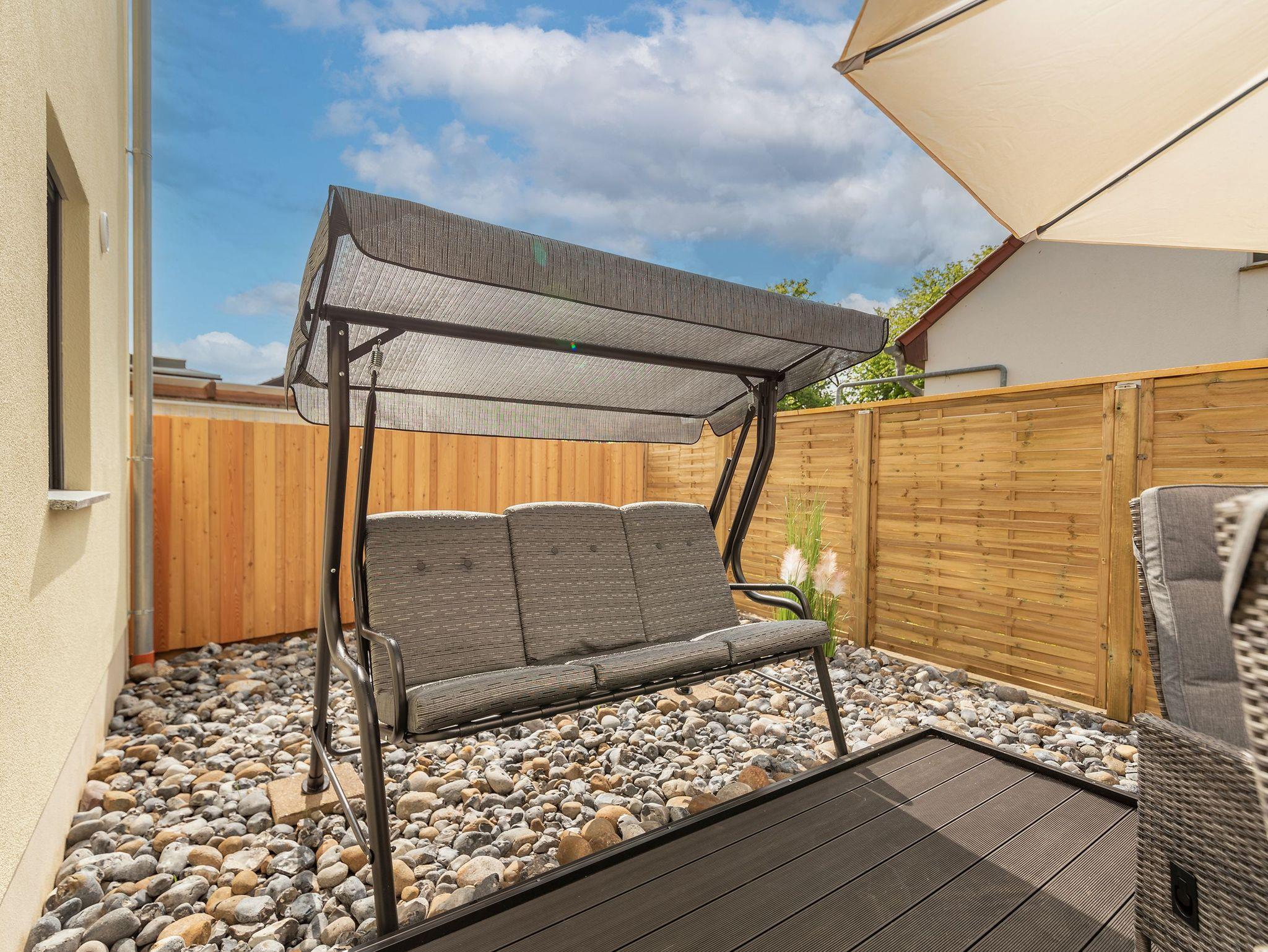 • Eine Sonnenterrasse mit Gartenmöbeln und einer Hollywoodschaukel.