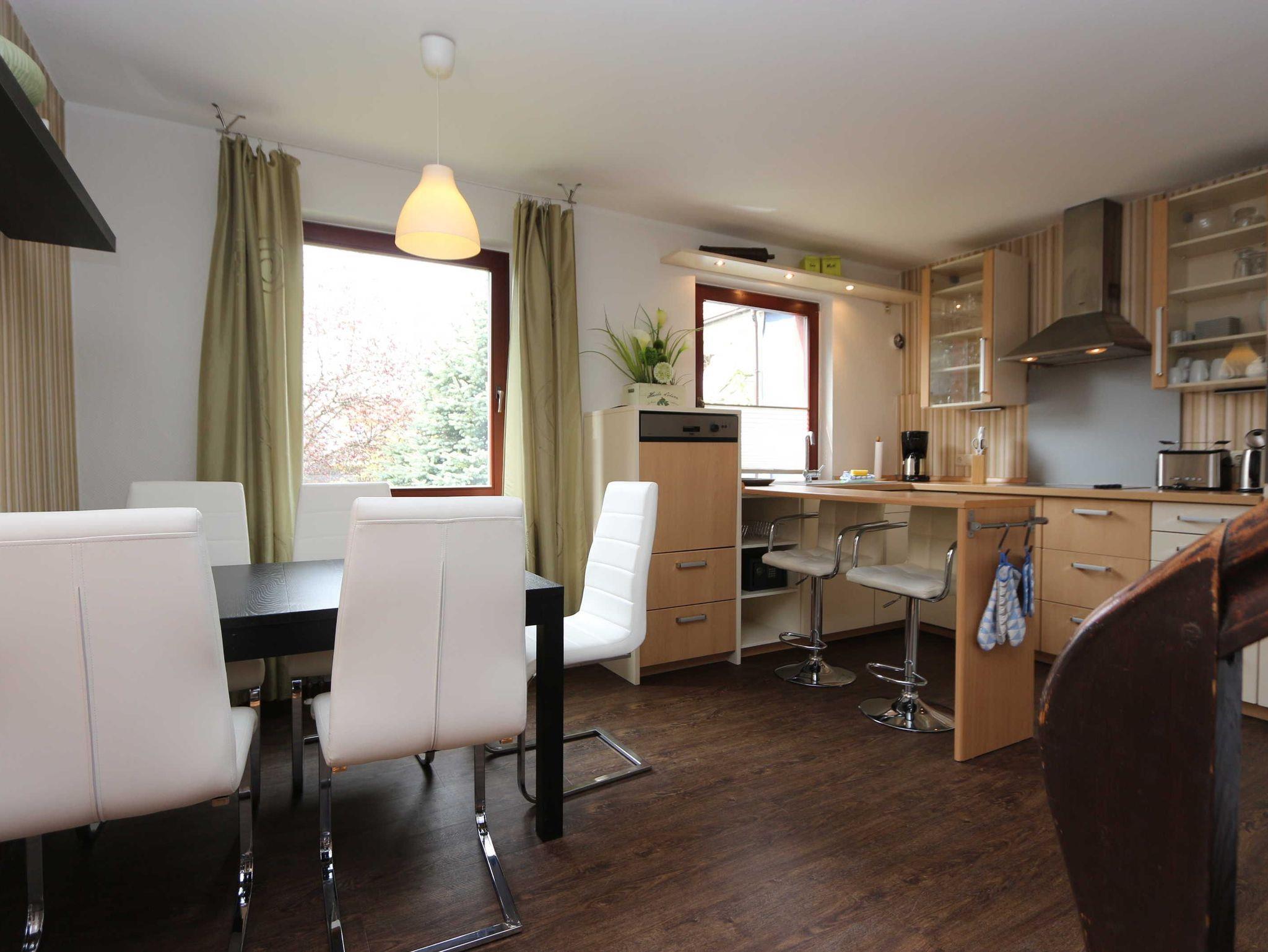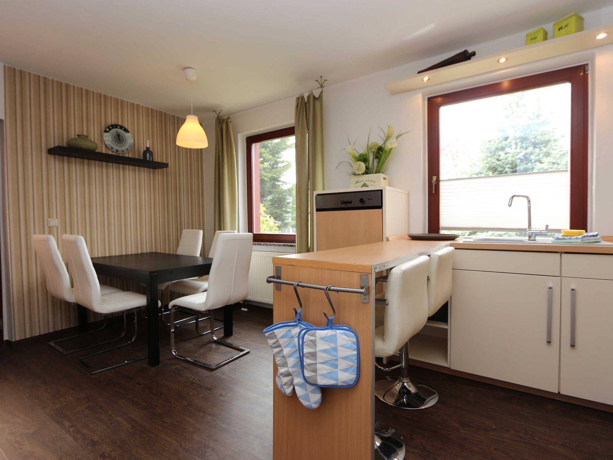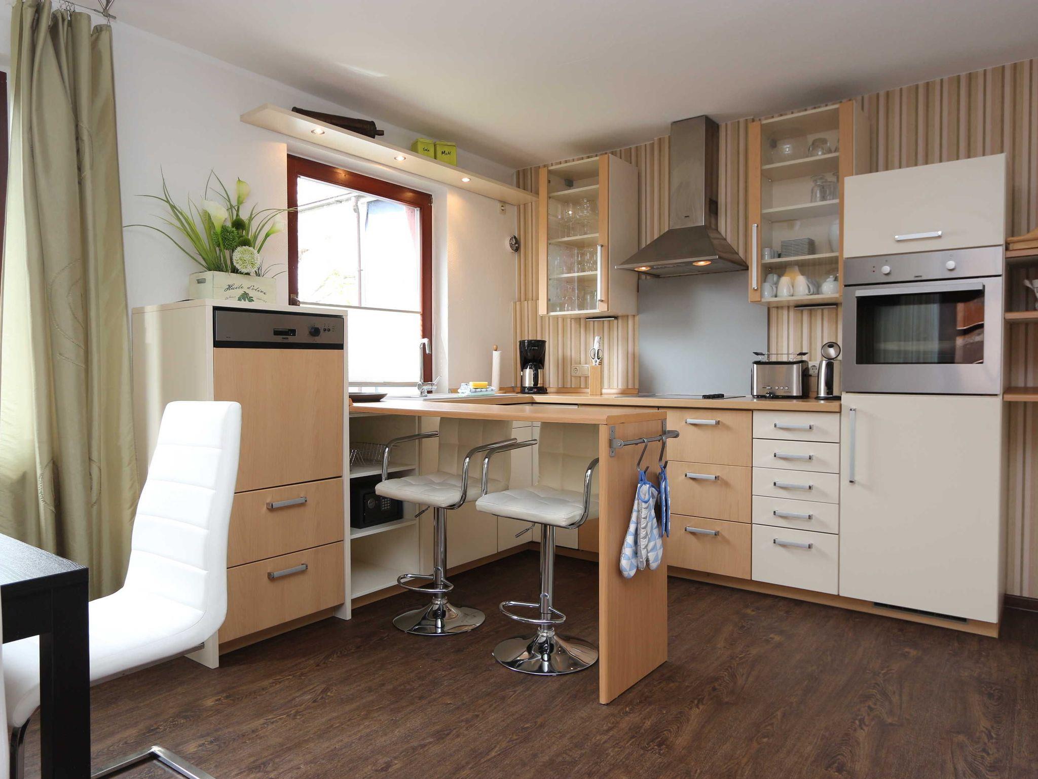 • eine Küche mit Einbauküche, Tisch und Stühlen, Spülmaschine, Herd und alles was in der küche benötigt wird;