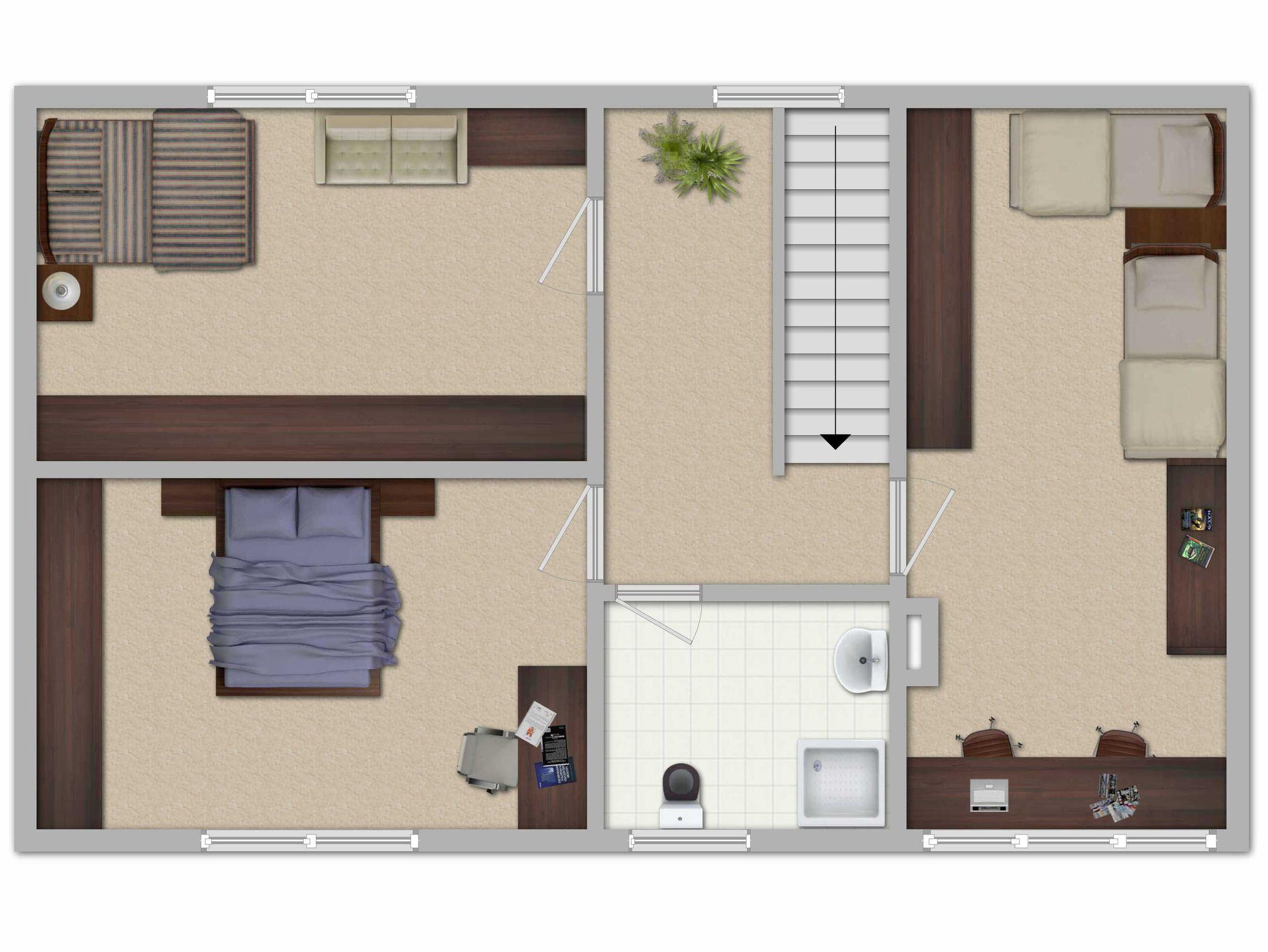 Zum Haus gehören Schlafräume und eine kleines Bad im Obergeschoss: