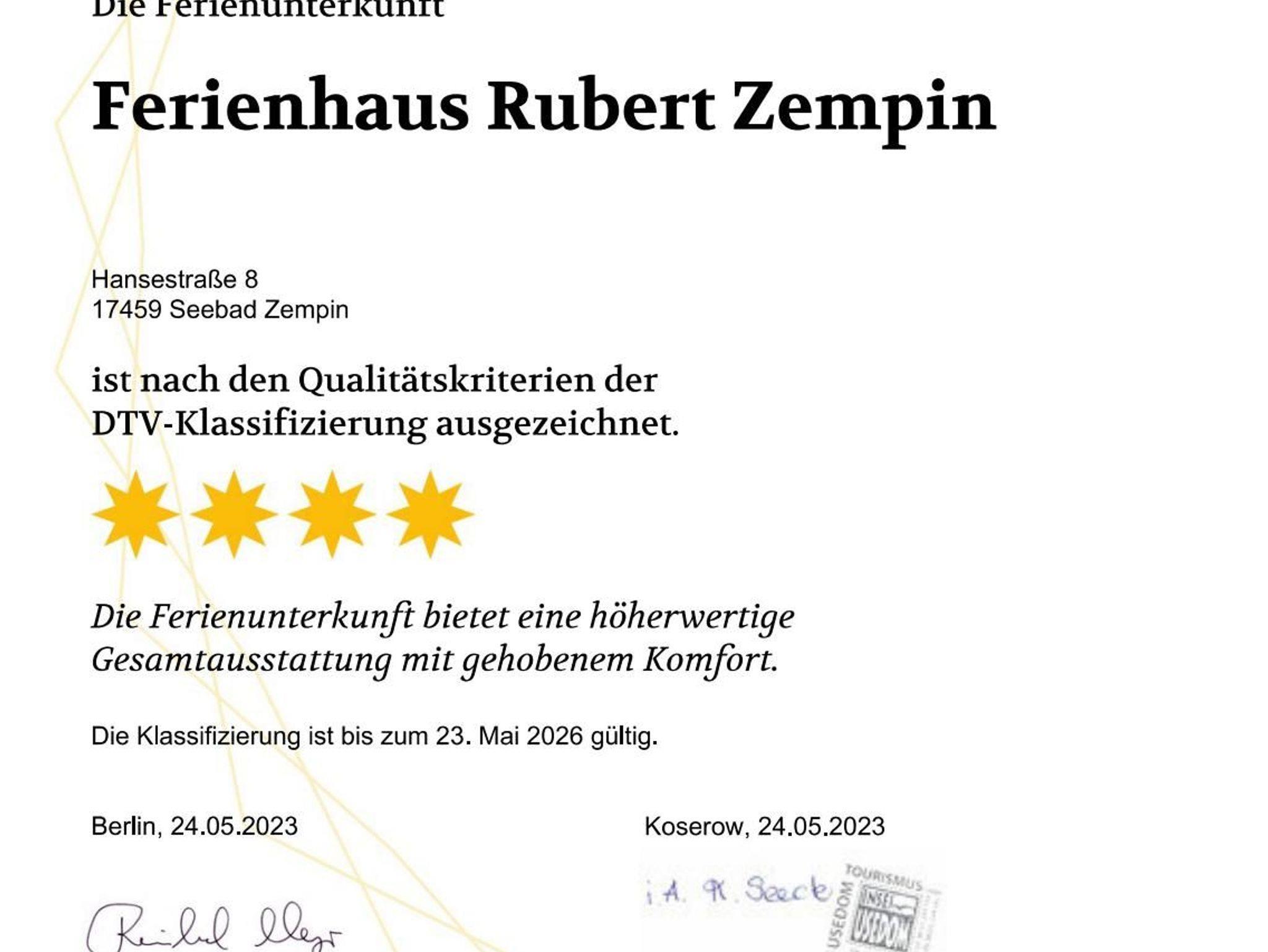 • Dieses Ferienhaus wurde vom DTV (Deutscher Tourismusverband) mit 4-Sternen bei einer Belegung mit 6 Personen klassifiziert.
