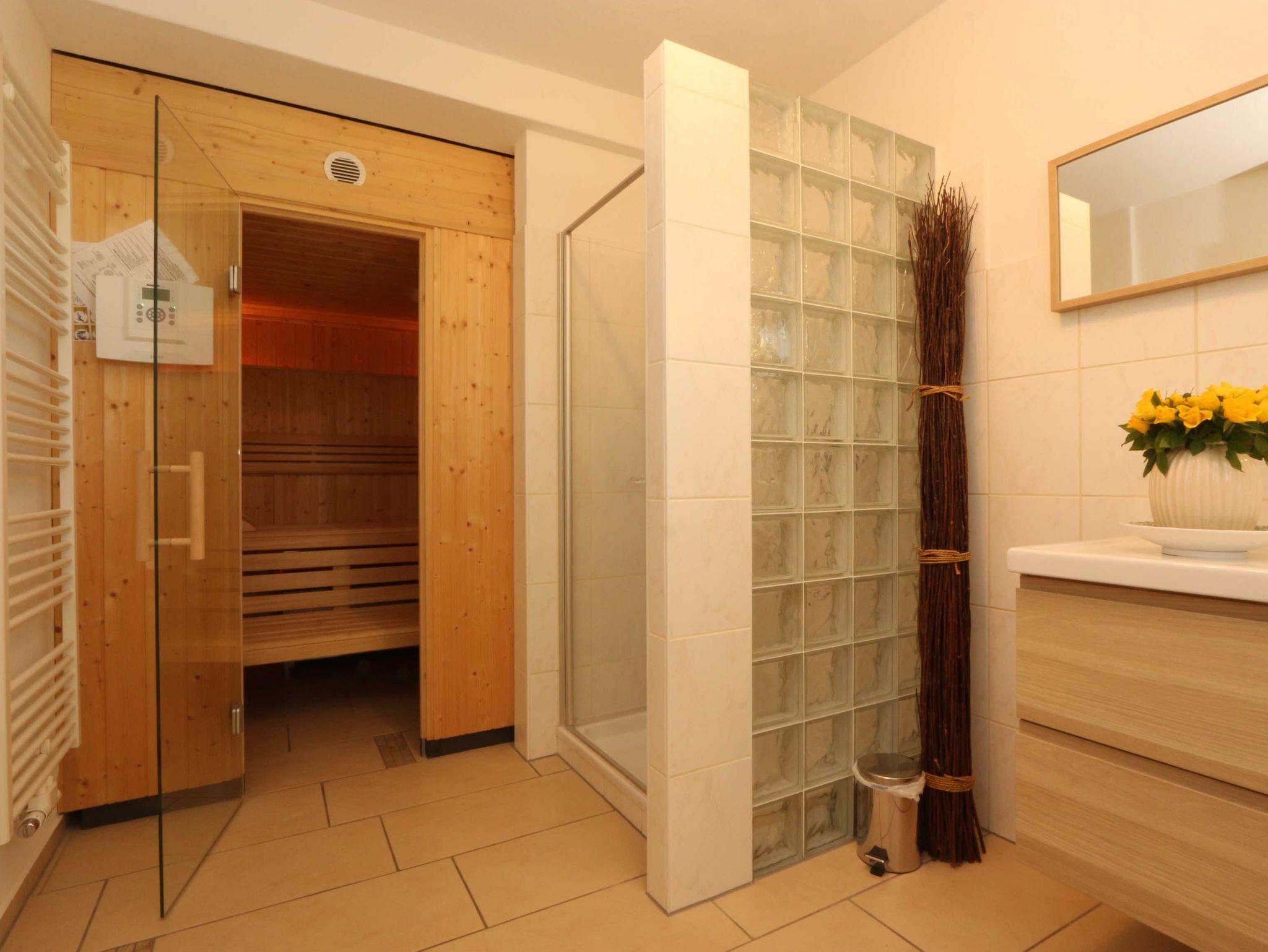 • grosses Badezimmer mit Sauna, Dusche, Fenster, Waschbecken und WC;