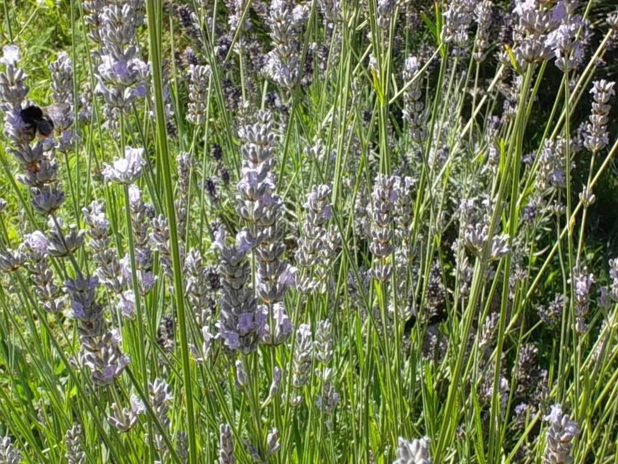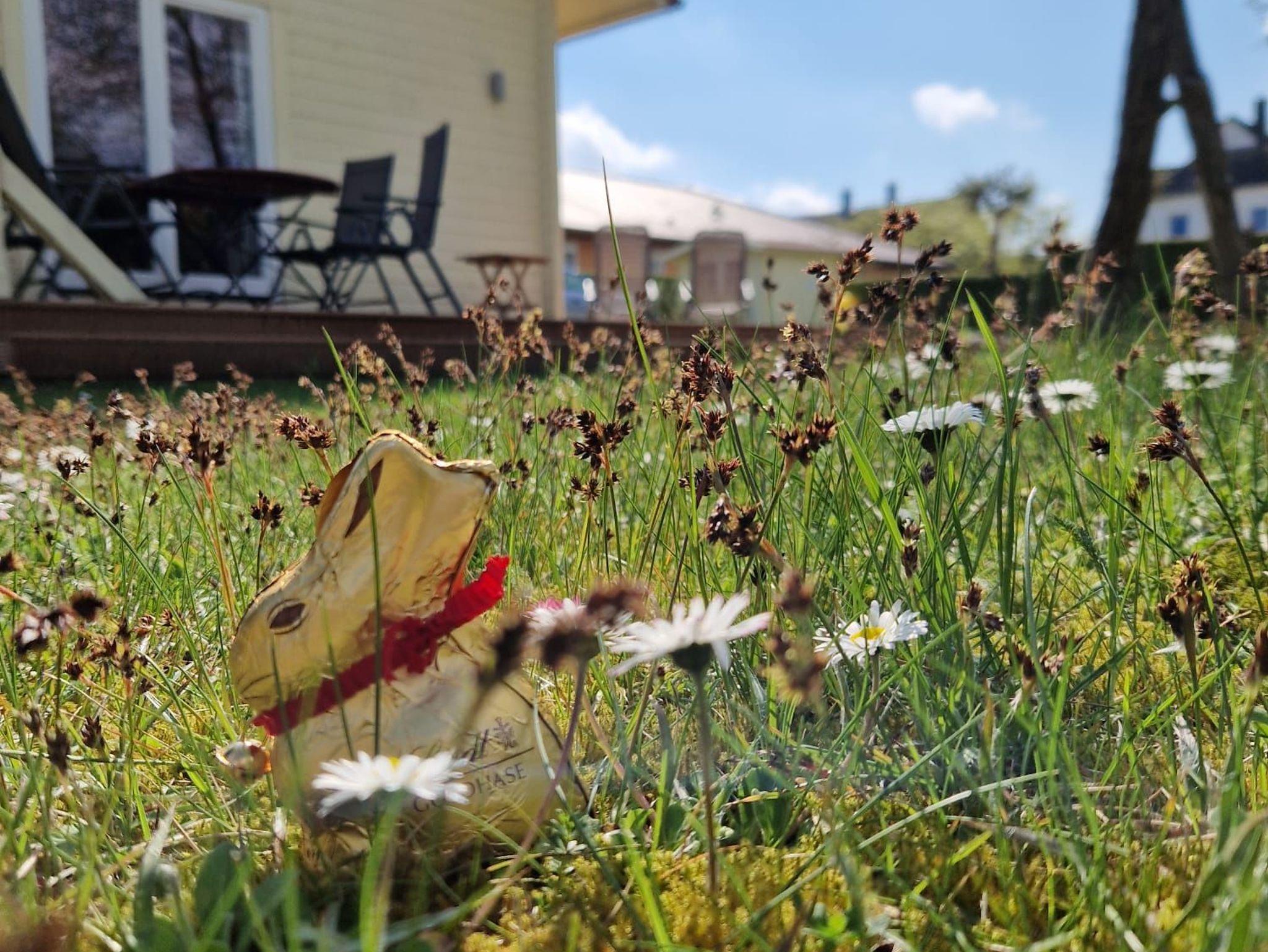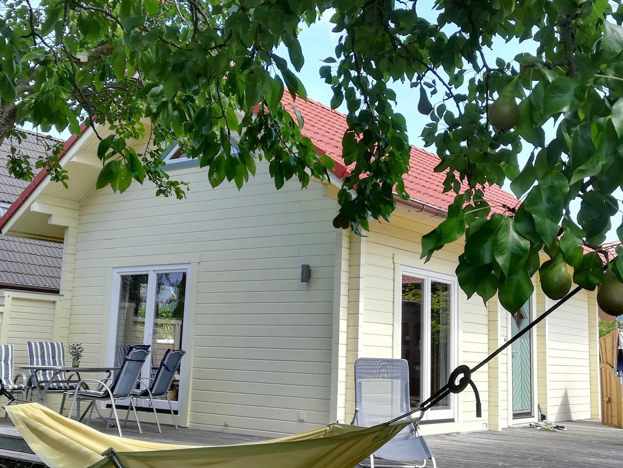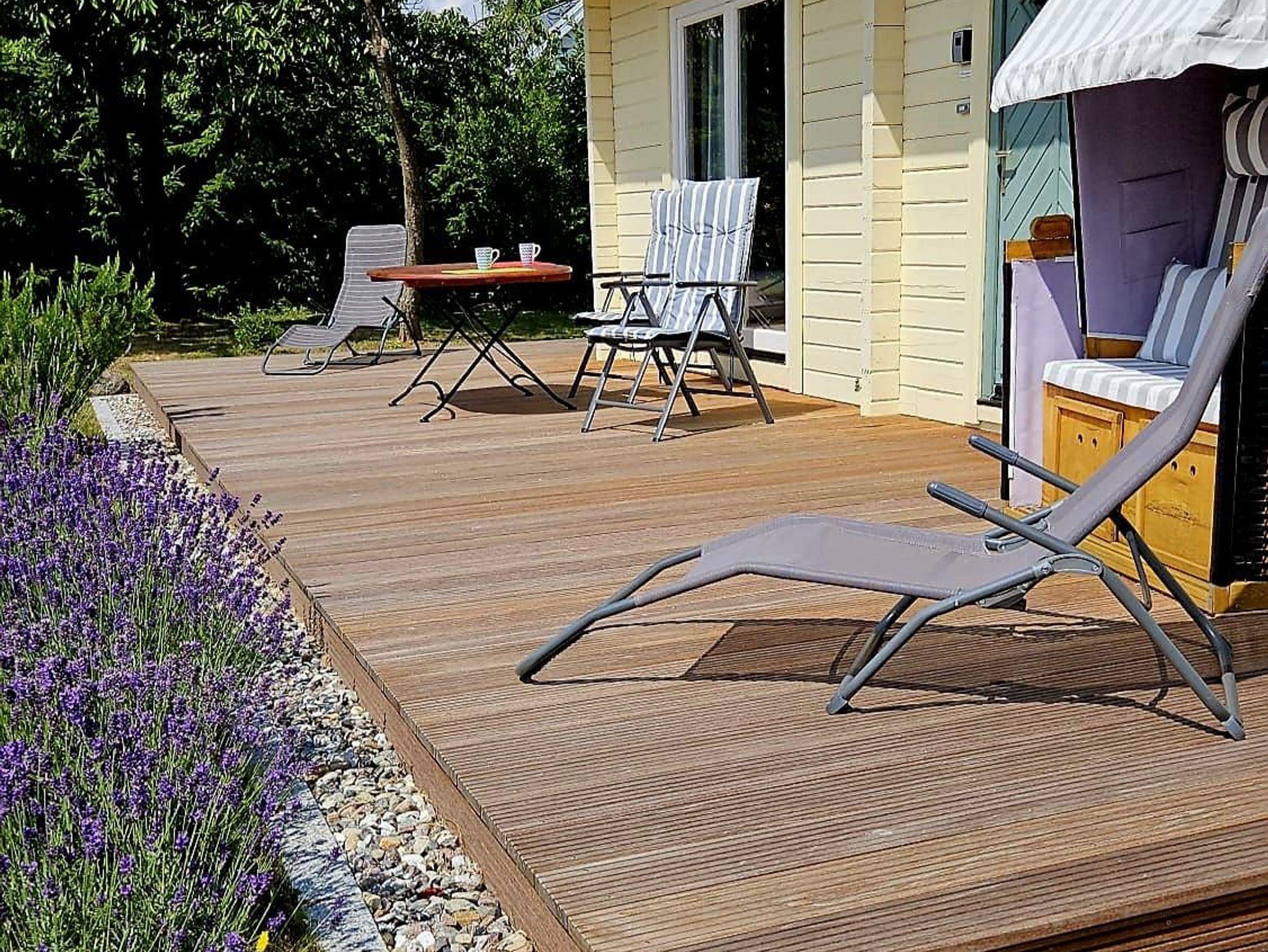 Freistehendes nordisches Ferienhaus auf Usedom, nahe Ostsee und Achterwasser, umgeben von Garten mit Lavendel und Kiefern.