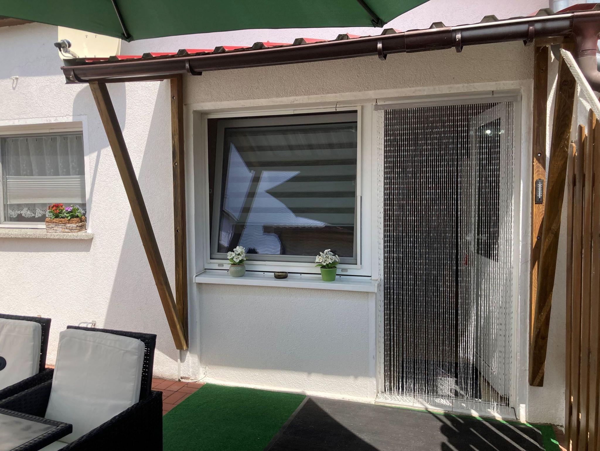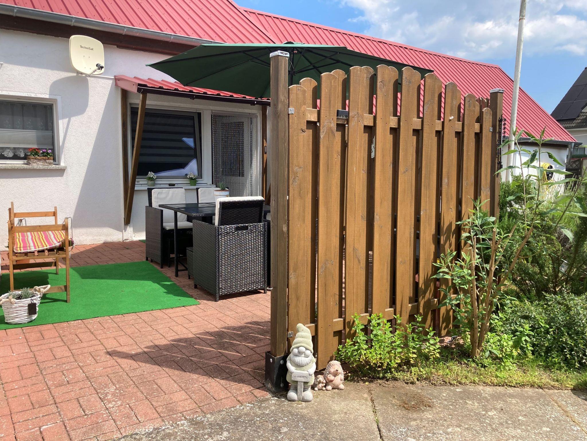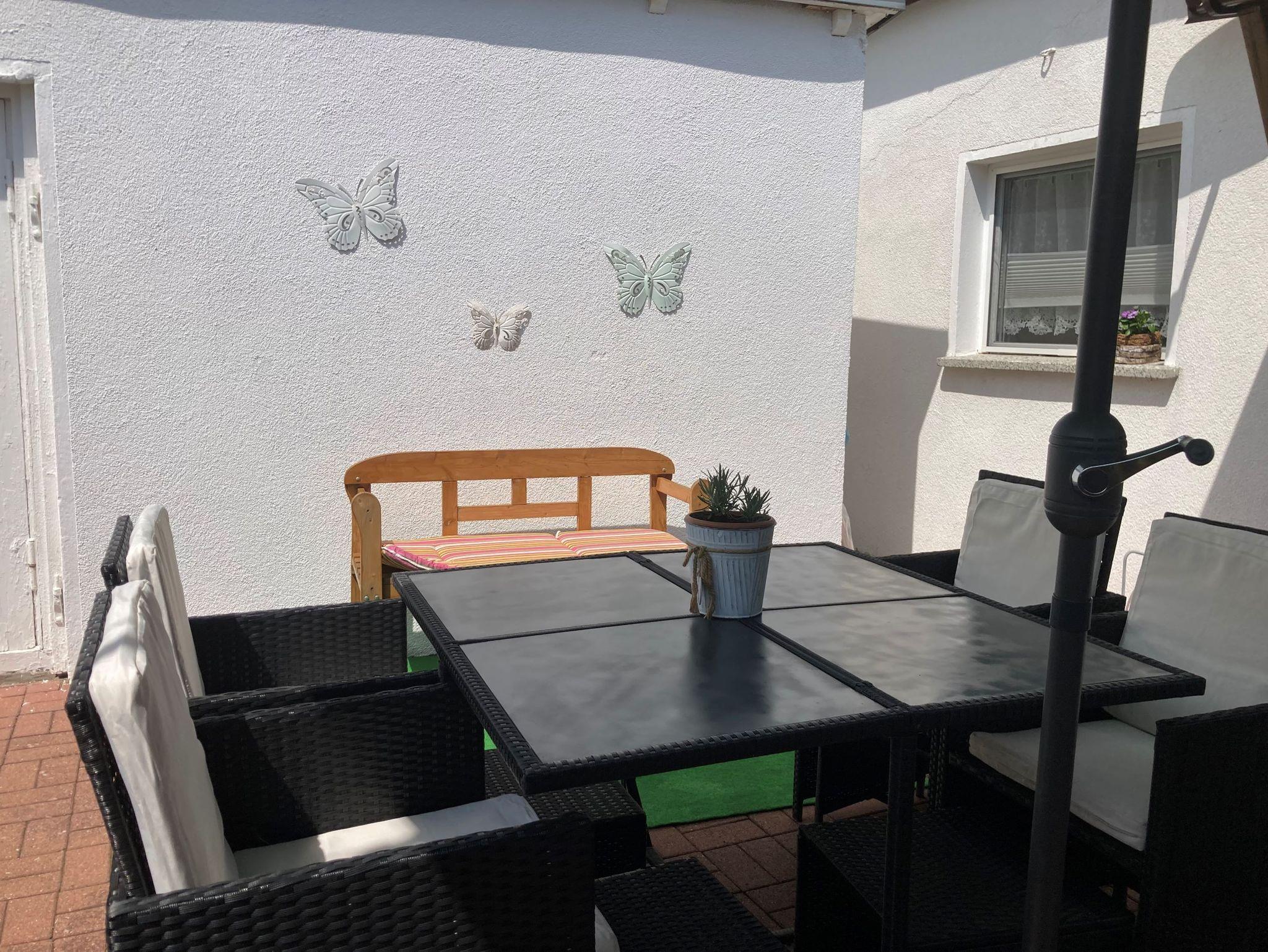 Besonders die großzügige sonnige Terrasse mit hochwertigen Sitzmöbeln, Sonnenschirm und kleiner Bank lädt zum Verweilen ein. Hier kann auch gegrillt werden.