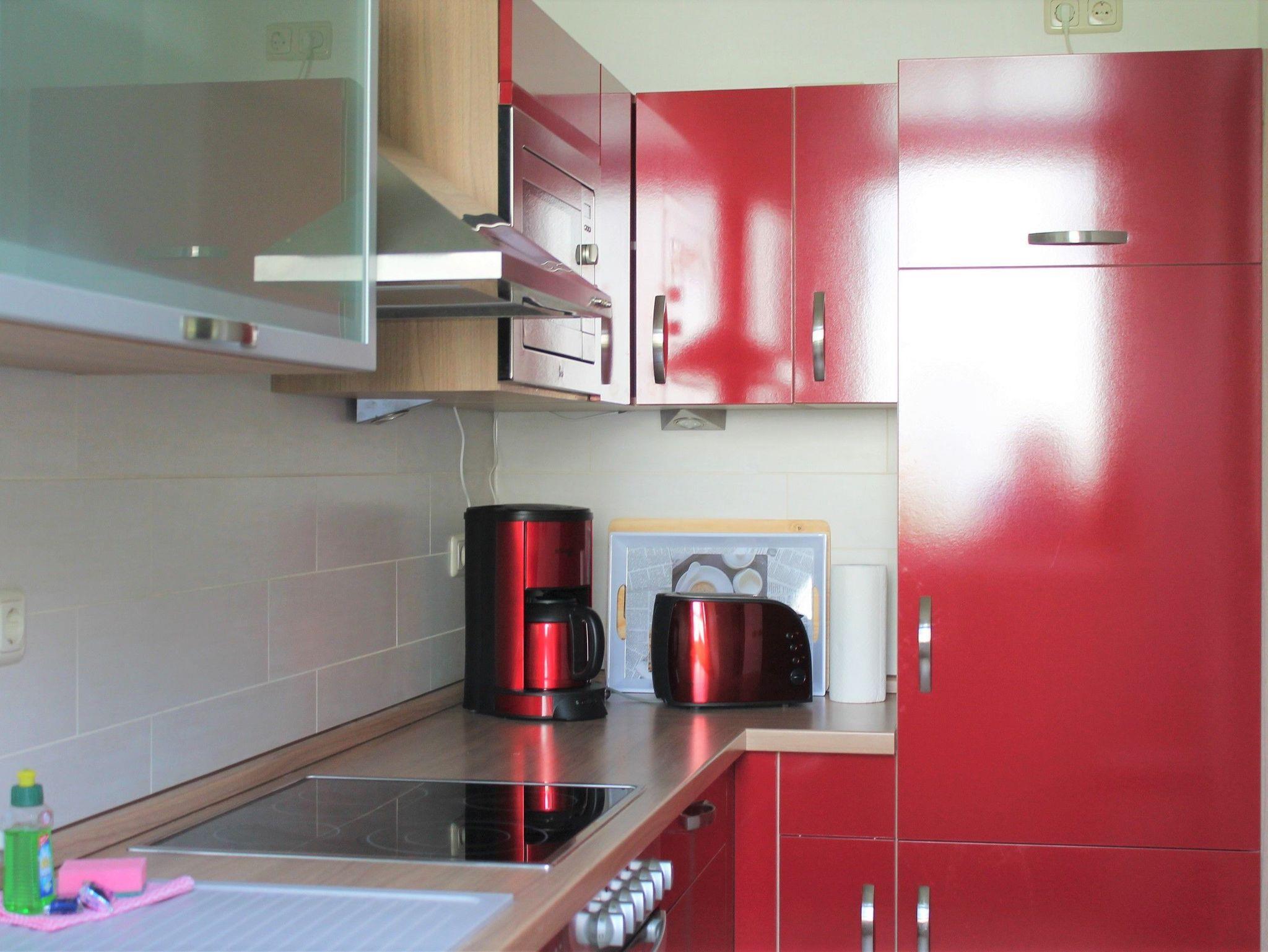 Die voll ausgestattete Küche verfügt neben Wasserkocher, Kaffeemaschine, Toaster, Herd mit Ceranfeld, Kühl-Gefrierkombination und einer Mikrowelle auch über einen Geschirrspüler.