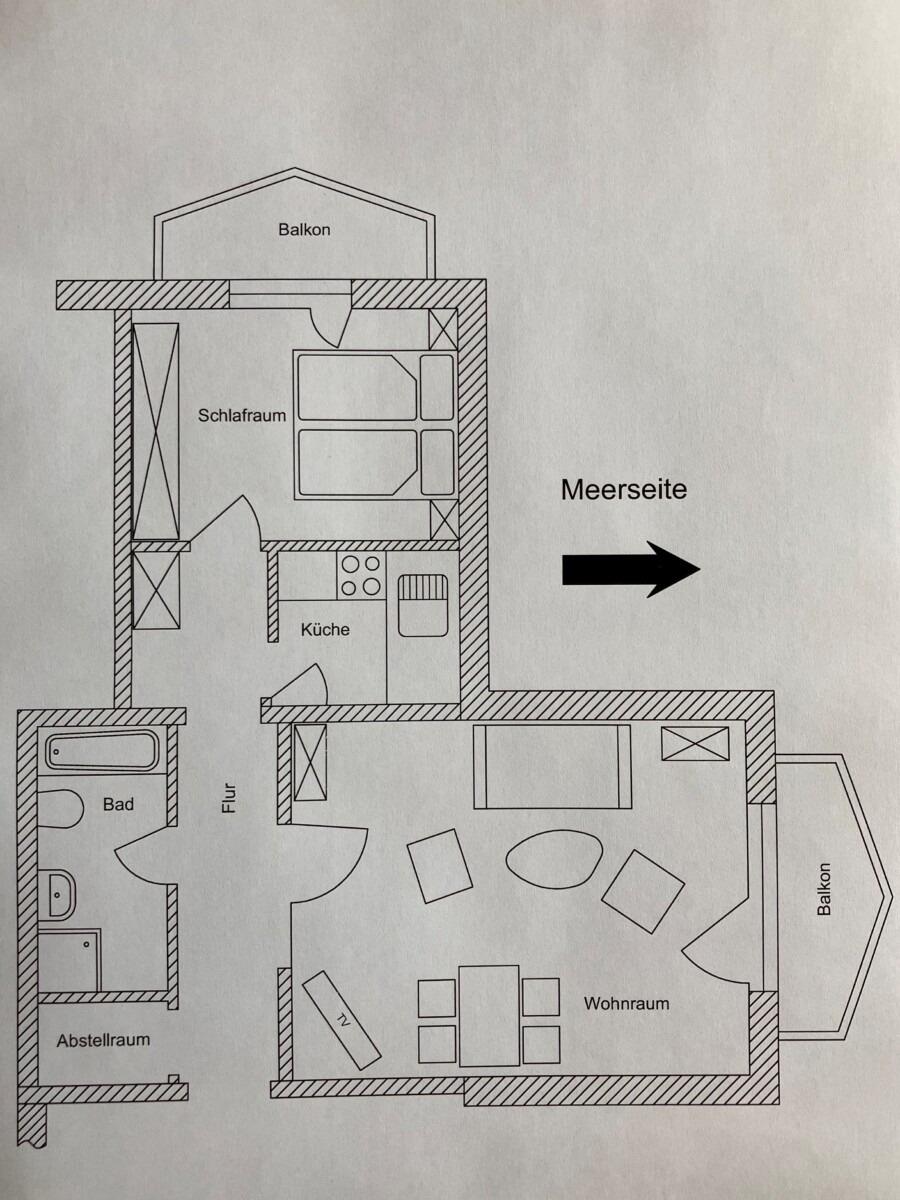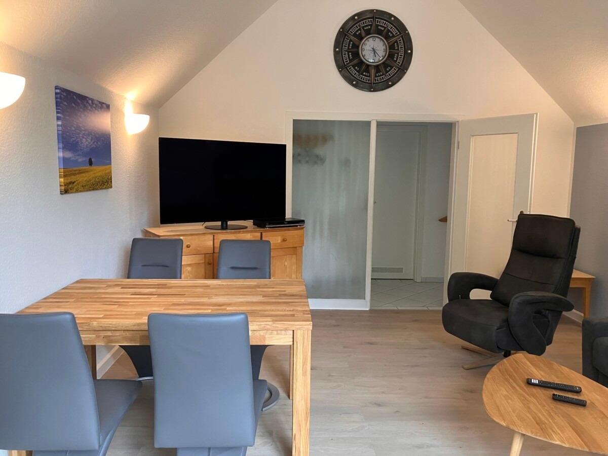 Wohnraum mit 55 Zoll-LED TV und UKW/DAB/Internet Radio, möblierter Balkon mit Blick auf die Kurpromenade in Richtung Meer, Essbereich mit massivem Holztisch und 4 Stühlen