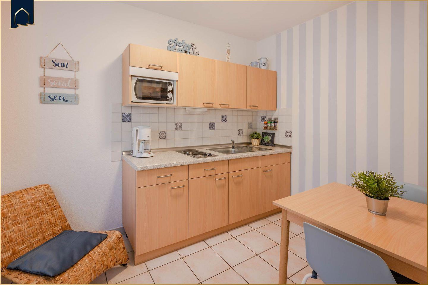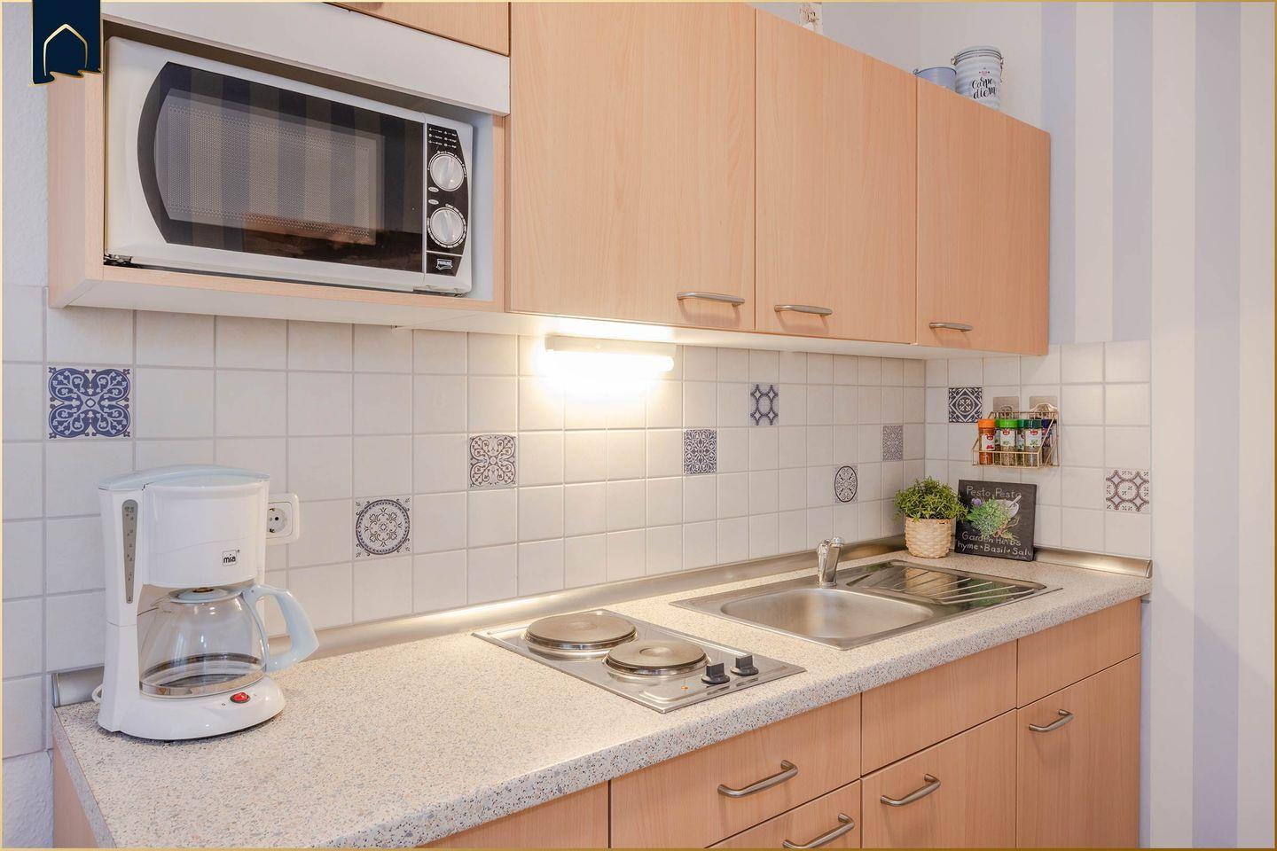 Die moderne Küchenzeile bietet alles, was Sie für die Selbstversorgung benötigen: Kühlschrank mit Gefrierfach, Herd, Backofen, Kaffeemaschine, Toaster, Mikrowelle und Wasserkocher sowie Geschirr und Besteck. Ein Essbereich ist ebenfalls vorhanden. Für Unterhaltung sorgt ein Flachbild-TV mit Anschluss, WLAN ist kostenlos nutzbar. Auch an Details wie Haartrockner, Spiegel und Rauchmelder wurde gedacht – ideal für einen sorgenfreien Aufenthalt.