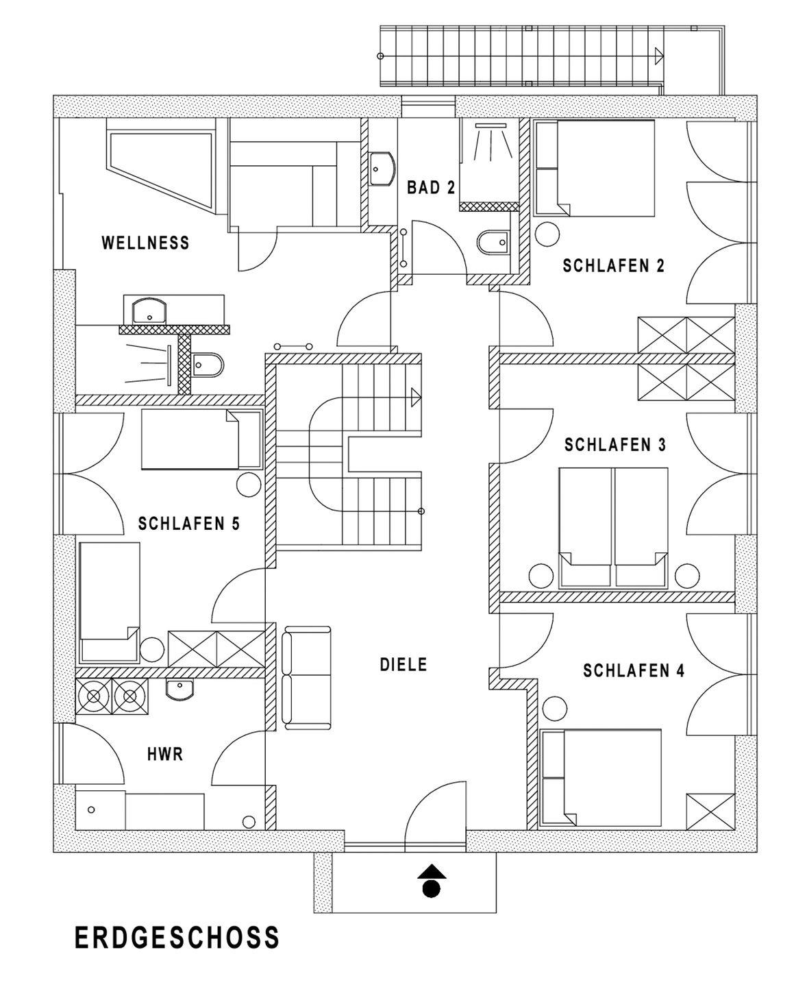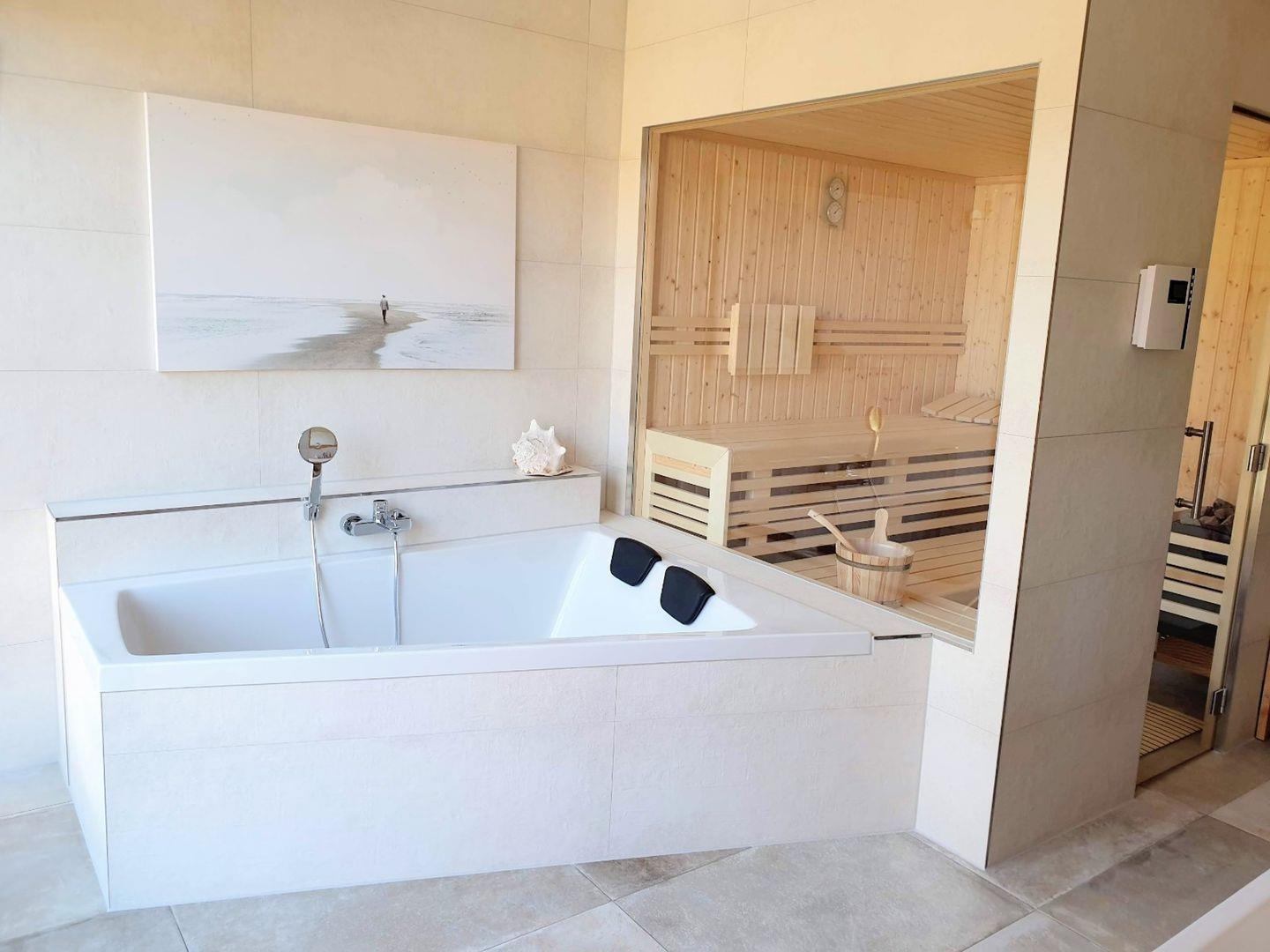 - 1 Wellnessbad: Sauna, Doppelbadewanne, Walk-in-Dusche, Zugang zur blickgeschützten Terrasse (nach dem Saunagang sehr angenehm)