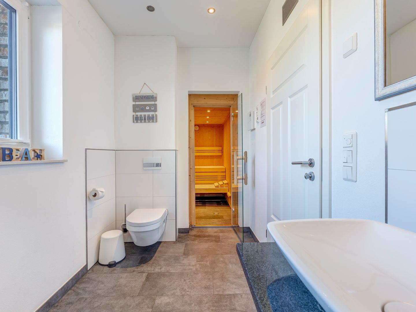 Das Ferienhaus ist rauchfrei und bietet Ihnen zwei moderne Bäder mit Dusche und WC. Eine großzügige Sauna rundet das Angebot ab und sorgt für Wohlfühlmomente nach einem ereignisreichen Tag.