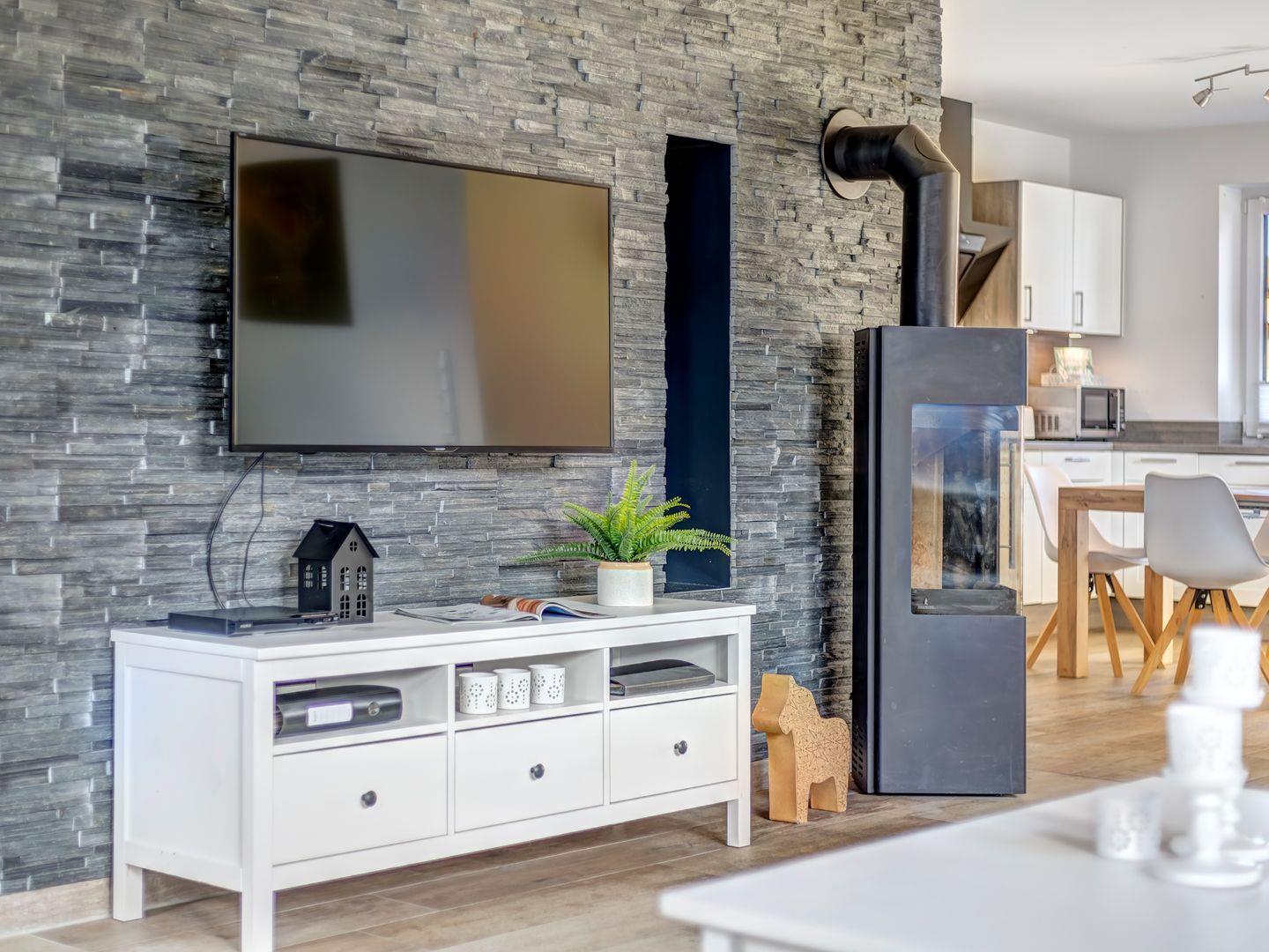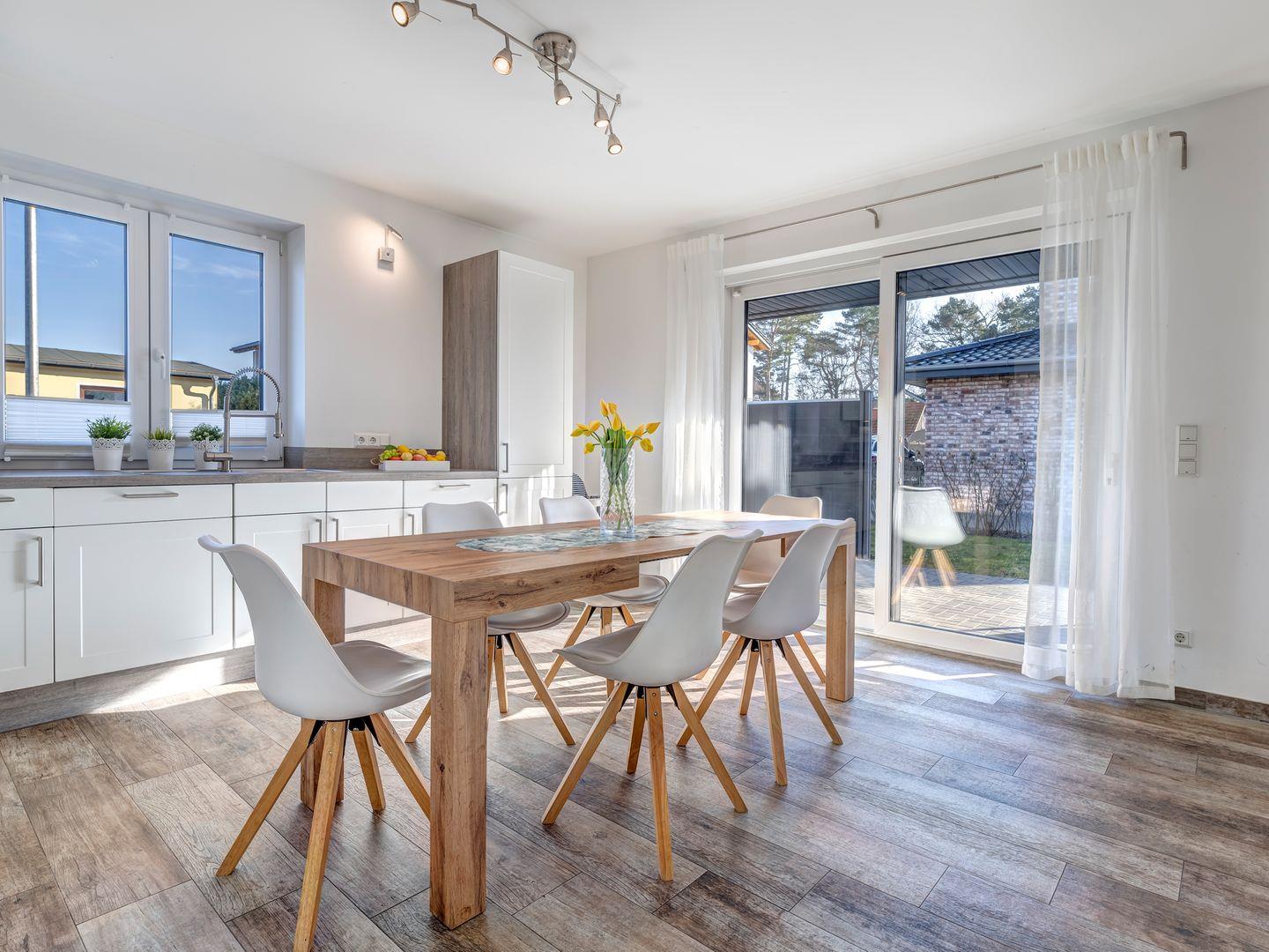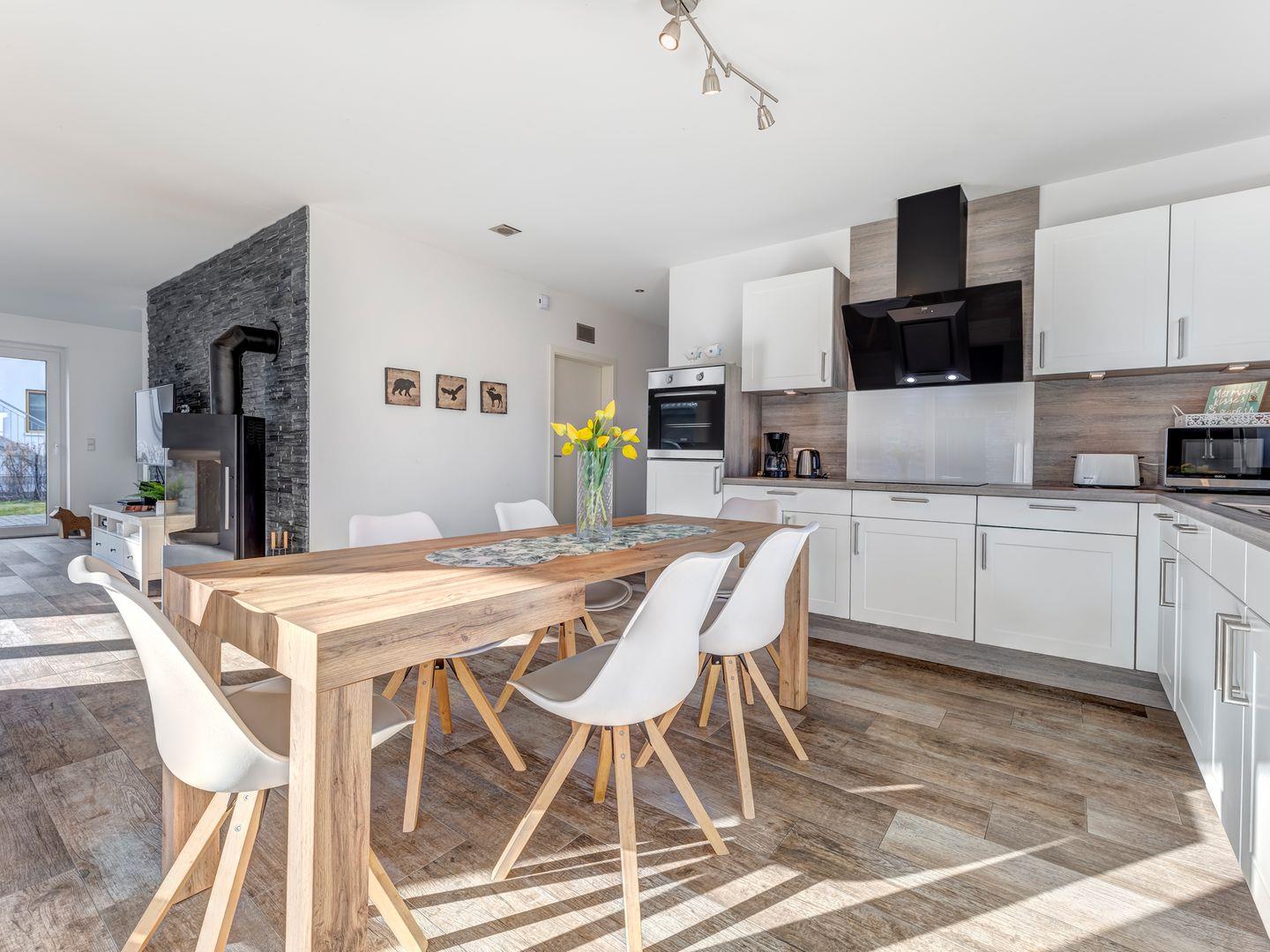 Der gemütliche Esstisch und die großzügige, voll ausgestattete Einbauküche befinden sich direkt im Anschluss an den offenen Wohnbereich, der durch den Kamin eine besonders einladende Atmosphäre schafft. Von hier aus haben Sie auch Zugang zur sonnigen Terrasse, ideal für entspannte Stunden im Freien.