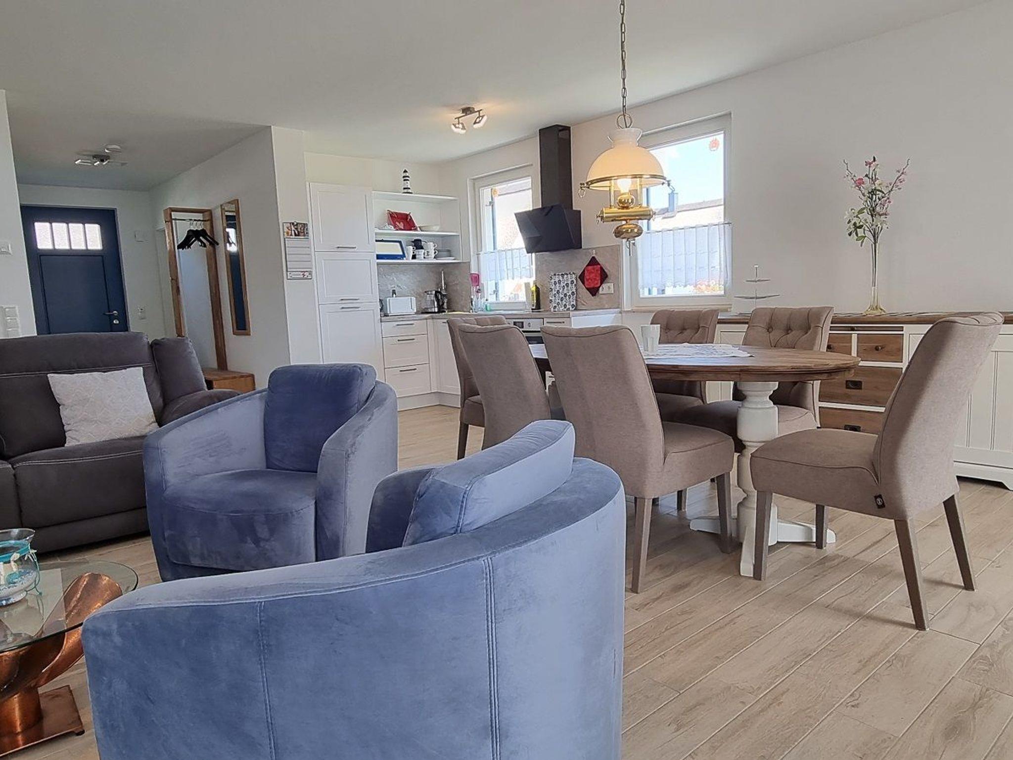 Der große Wohn- und Essbereich im Erdgeschoss des Ferienhauses ist mit hochwertigen Sitzmöbeln eingerichtet. Ein Sat-TV und diverse Bücher sorgen für Unterhaltung.