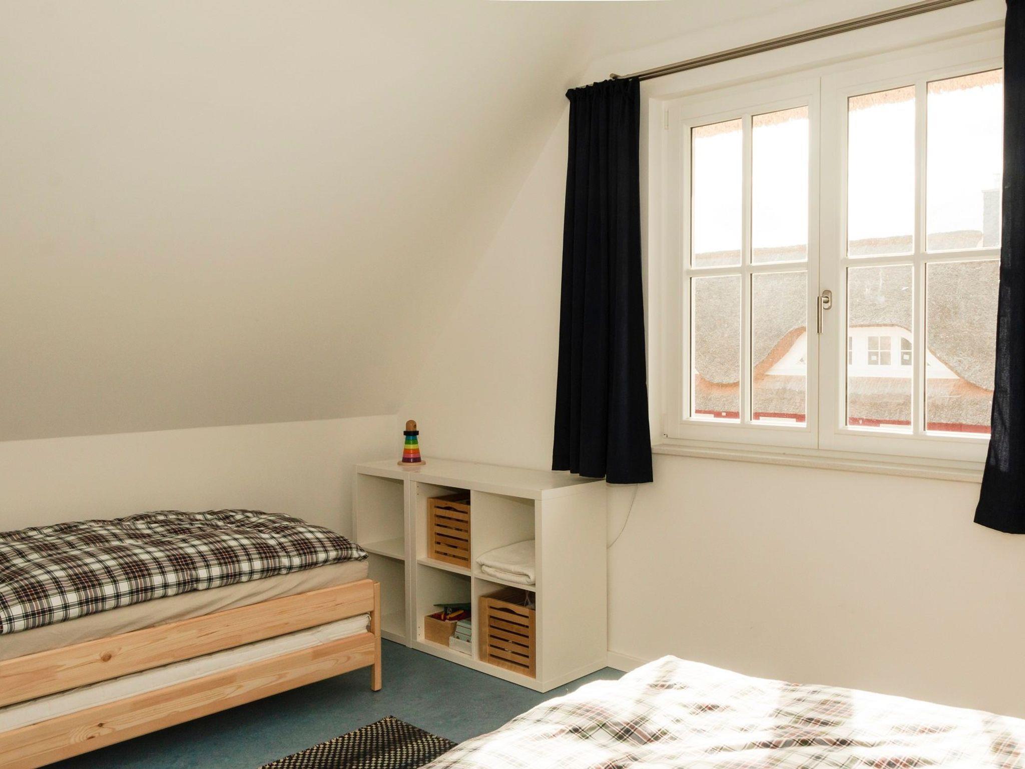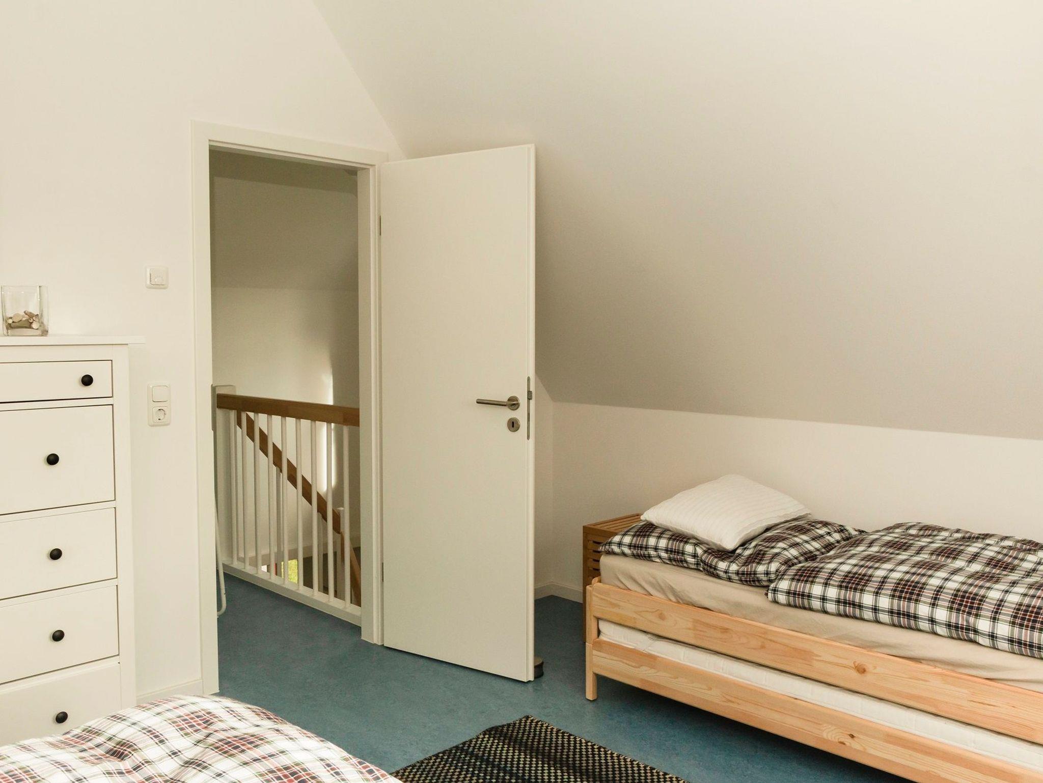 Im Obergeschoss findest du zwei Schlafzimmer: Im rechten Schlafzimmer steht ein französisches Ehebett und im linken drei Einzelbetten, die du flexibel ganz nach deinen Bedürfnissen auch zu einem Doppelbett zusammenstellen kannst. Bis zu fünf Personen genießen hier dank Insektengittern ungestörte Nächte. Falls ihr noch ein zusätzliches Kinderreisebett benötigt, sagt einfach Bescheid.