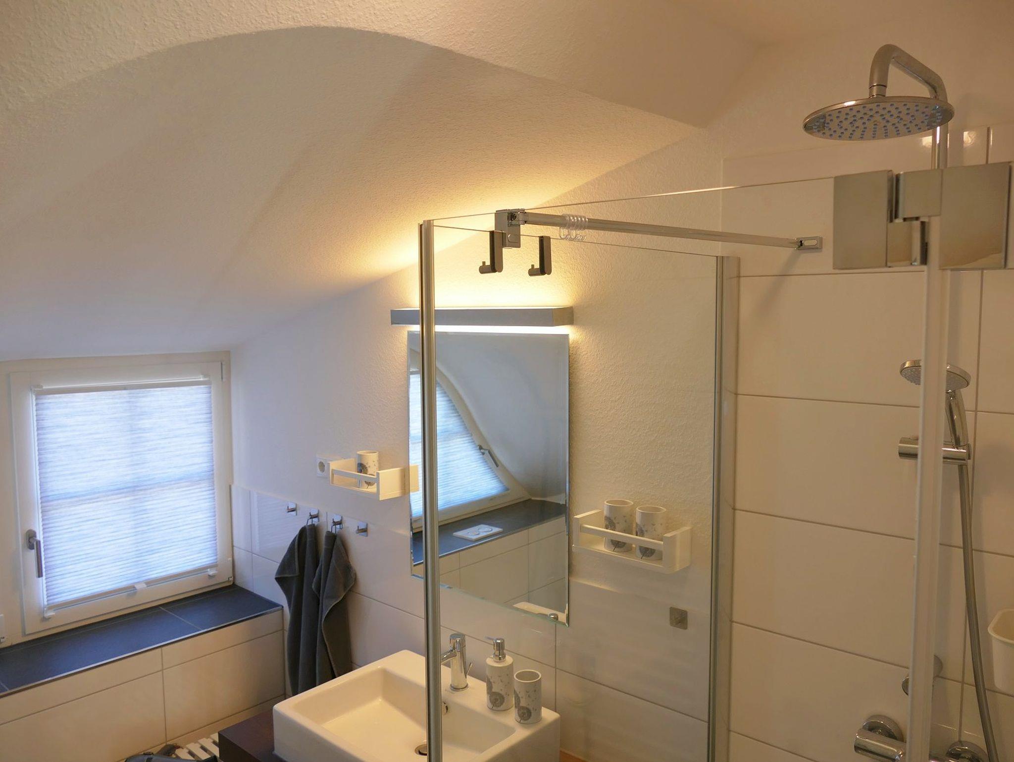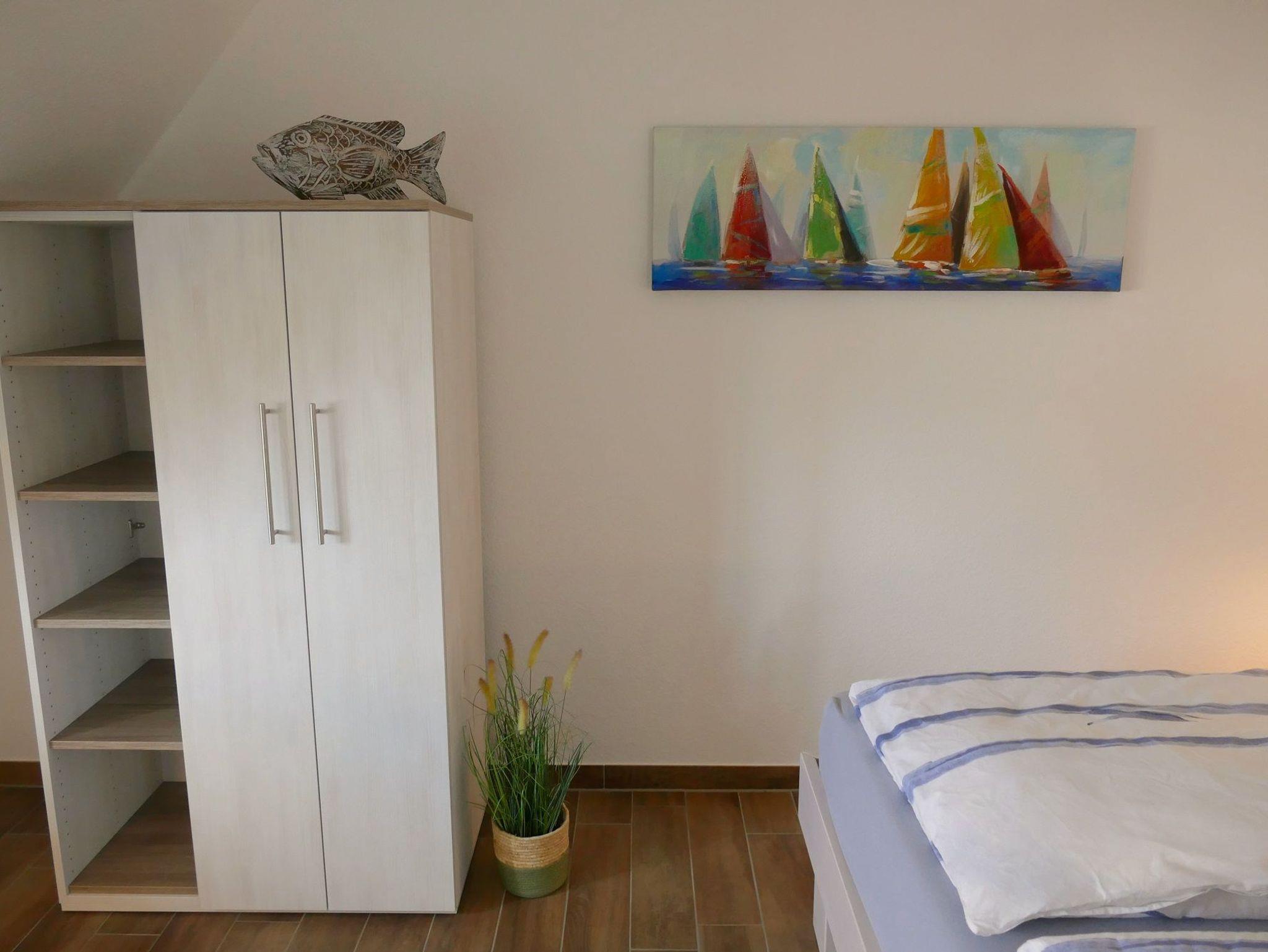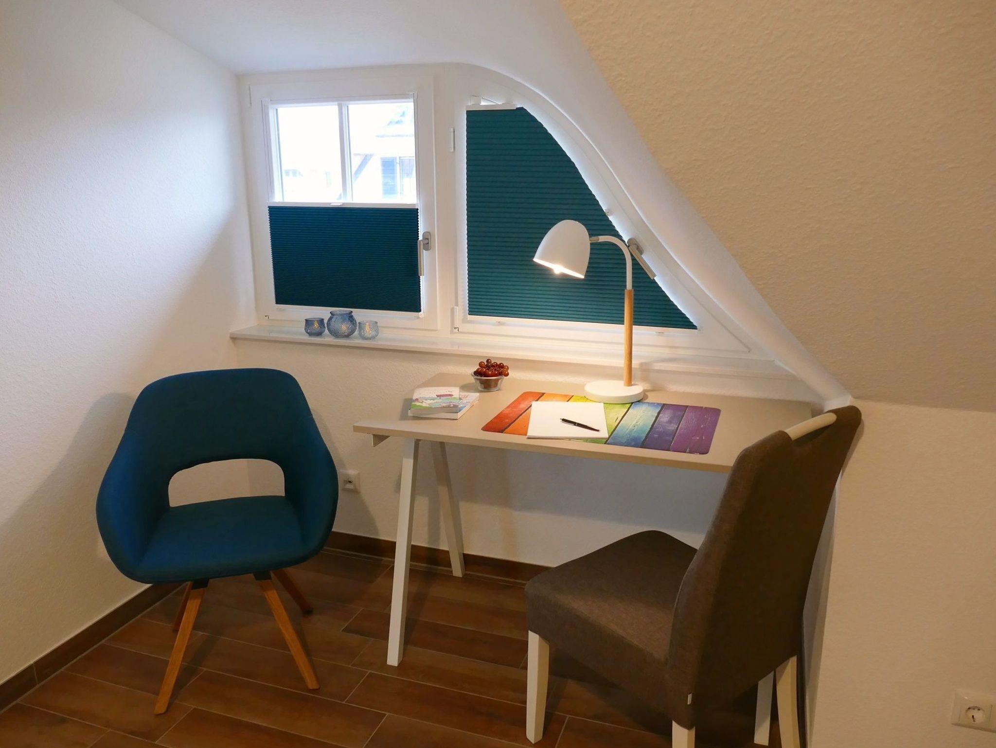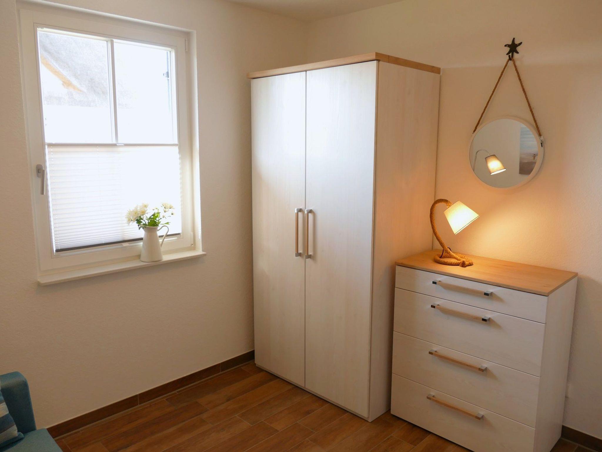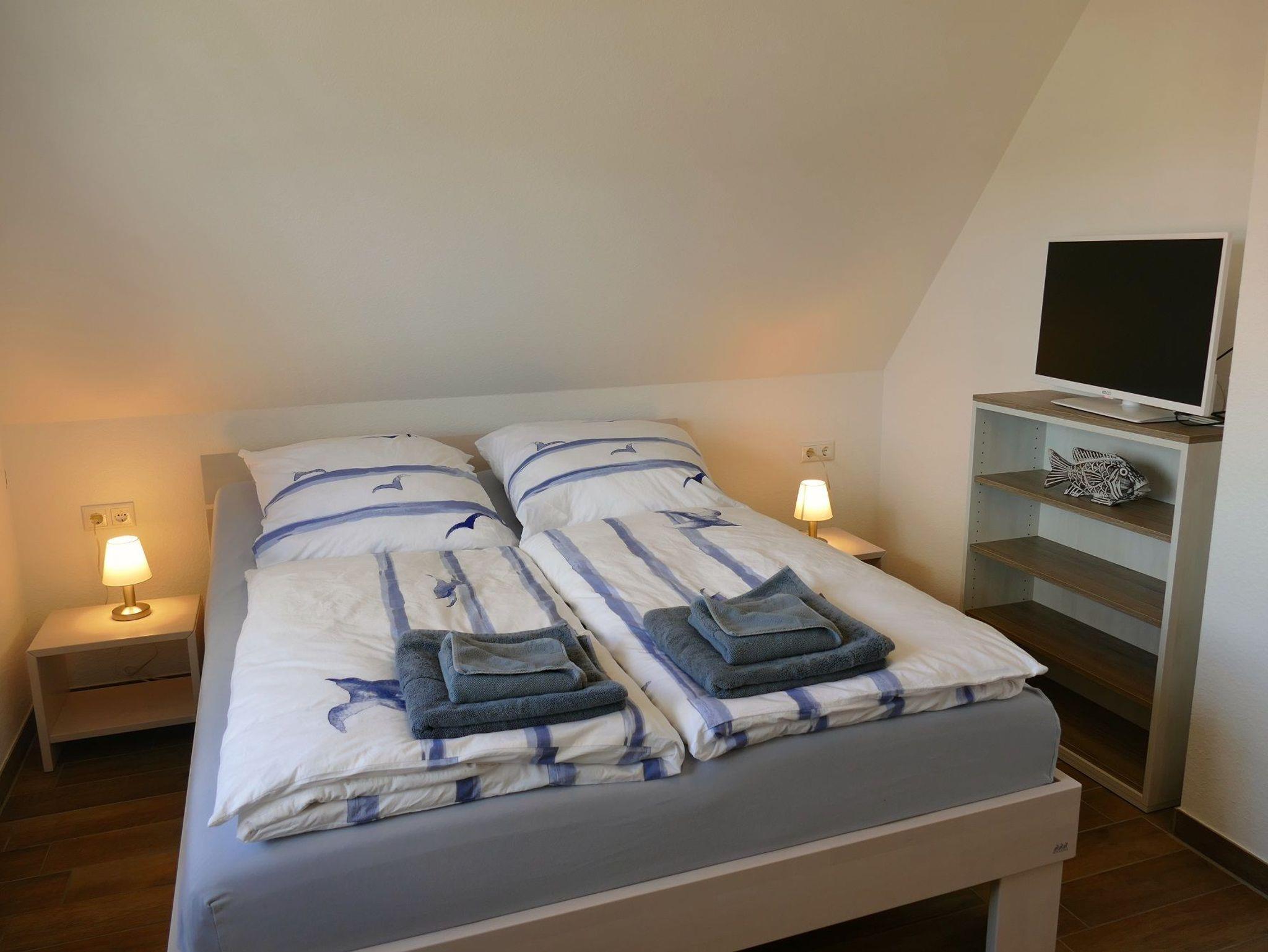 Im Obergeschoss des Reethauses befinden sich die beiden großen Schlafzimmer sowie das Badezimmer mit Regendusche. Beide Schlafzimmer sind mit bequemen Doppelbetten und viel Stauraum ausgestattet. In einem der Zimmer finden Sie den zweiten Fernseher sowie eine gemütliche Leseecke. Am Schreibtisch im anderen Schlafzimmer können Sie in der Ferne die Ostsee erblicken. Beide Schlafräume lassen sich verdunkeln und sind mit Insektenschutzgittern versehen.