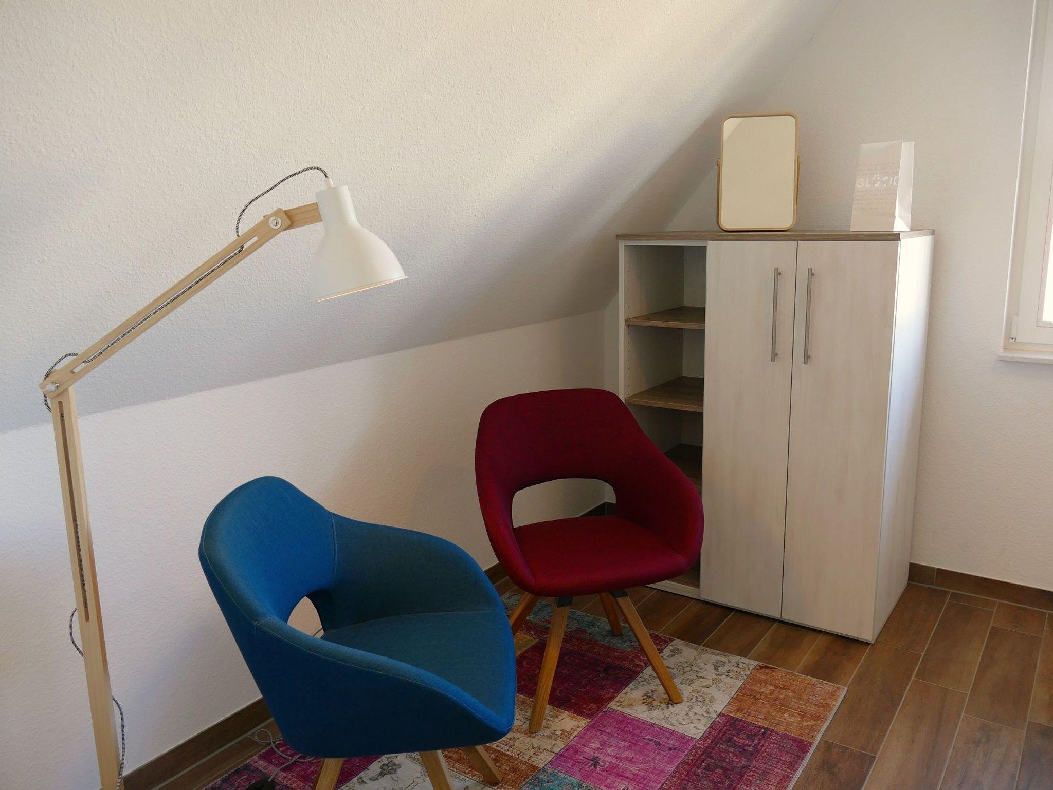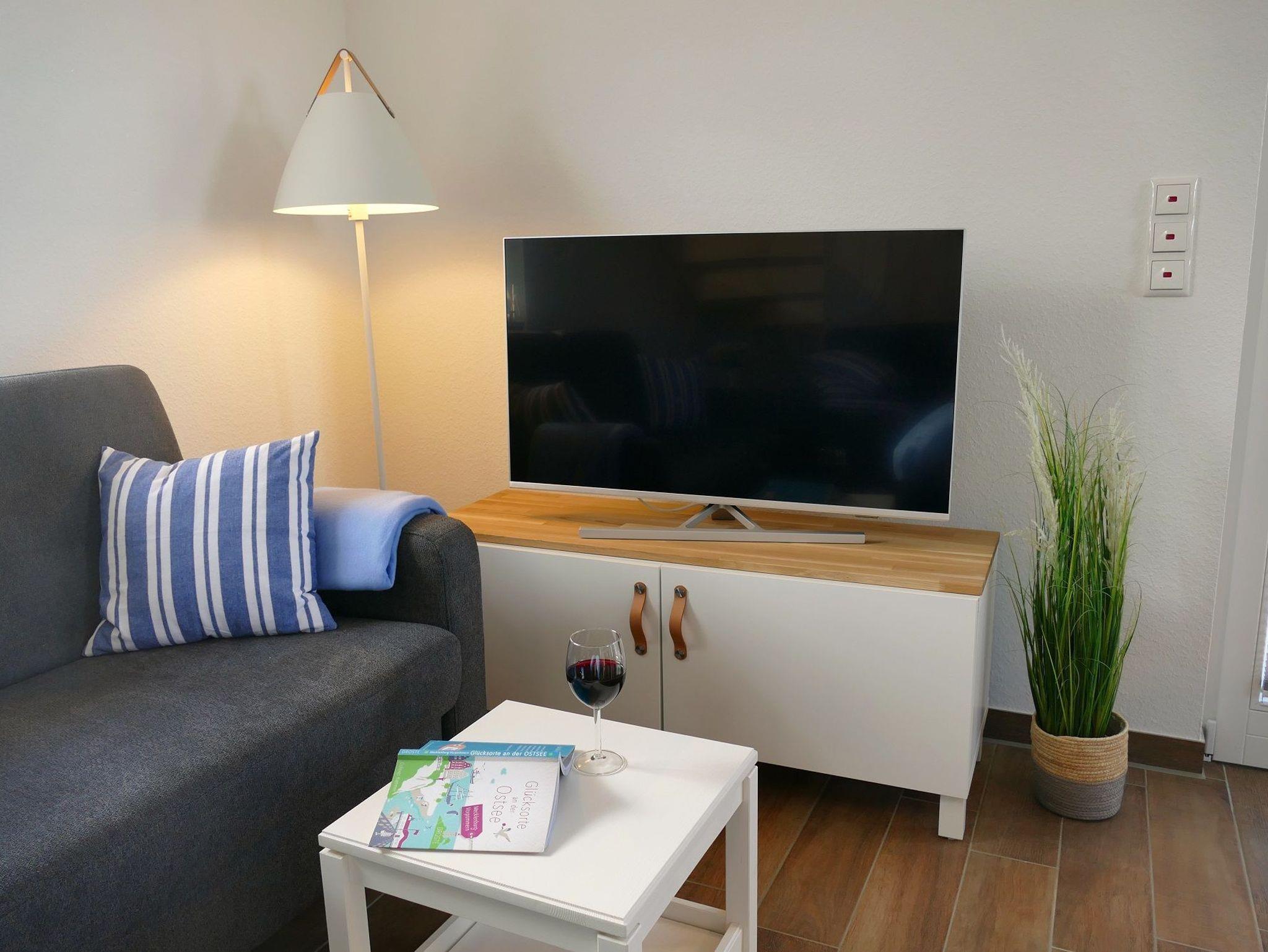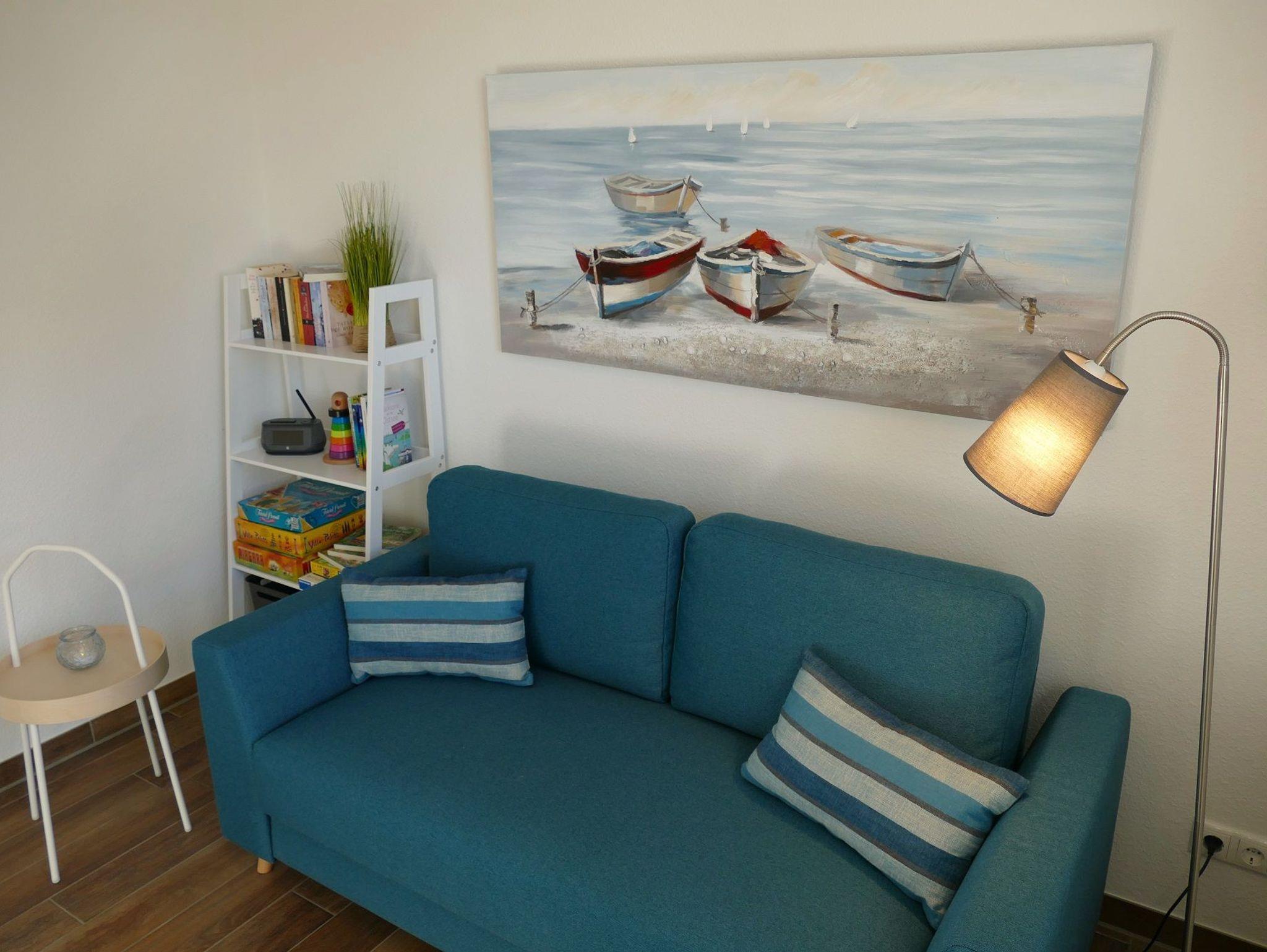 Das dritte Schlafzimmer befindet sich im Erdgeschoss. Es ist mit einem Schlafsofa mit Boxspringtechnologie ausgestattet. In diesem können ein Erwachsener oder zwei Kinder schlafen. Wird das Zimmer nicht als Schlafraum genutzt, so ist es ein gemütlicher zusätzlicher Rückzugsort mit einem kleinen Sofa, einigen Büchern und Spielen.