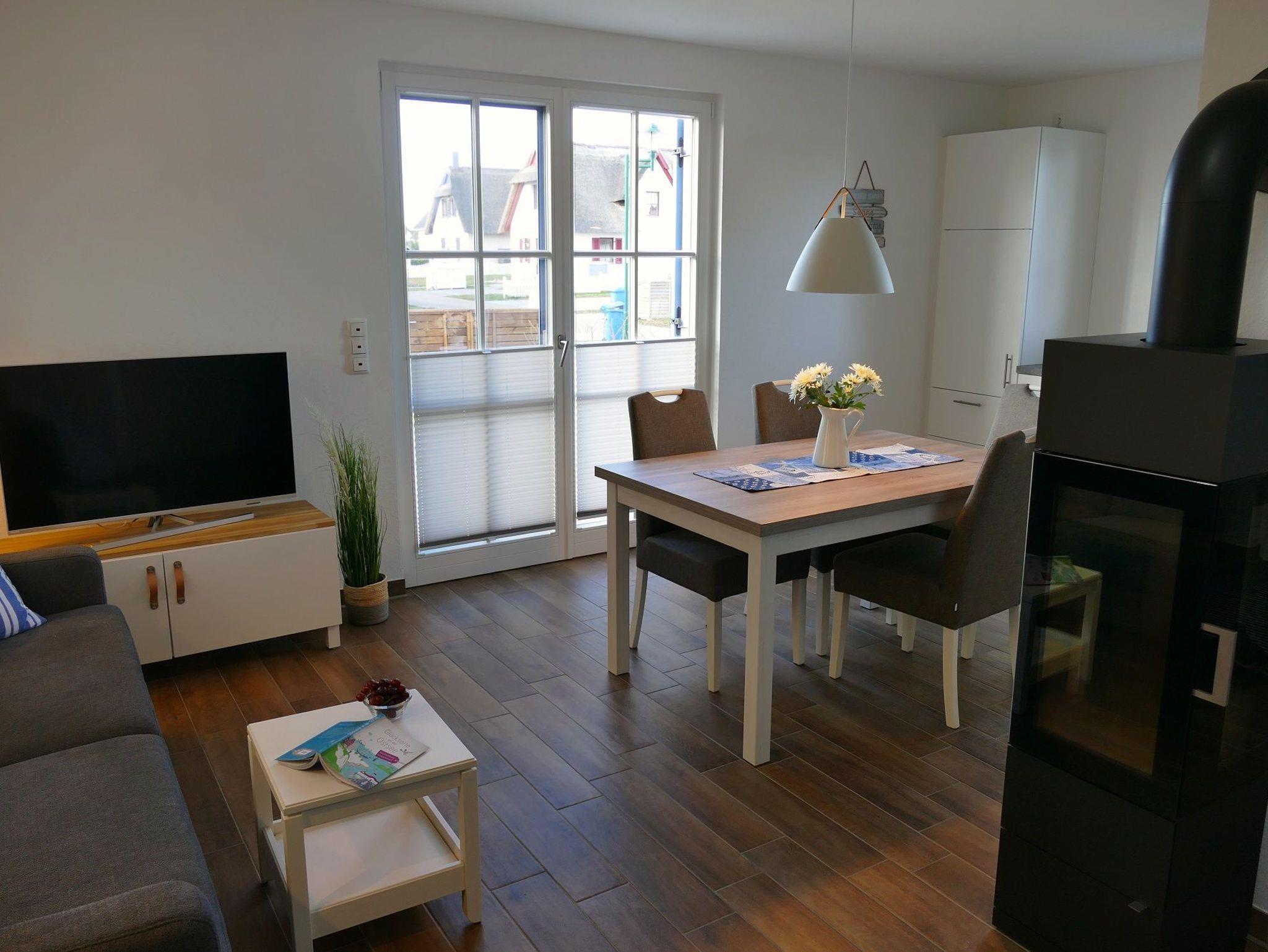 Der großzügige und lichtdurchflutete Wohn-Essbereich lädt Sie dazu ein, eine schöne Zeit miteinander zu verbringen. Die Küche ist integriert und sehr gut ausgestattet. Im Wohn-Essbereich finden Sie einen großen Esstisch, eine gemütliche Couchecke mit Kaminofen sowie einen modernen Fernseher. Von hier haben Sie einen direkten Zugang zur Terrasse.